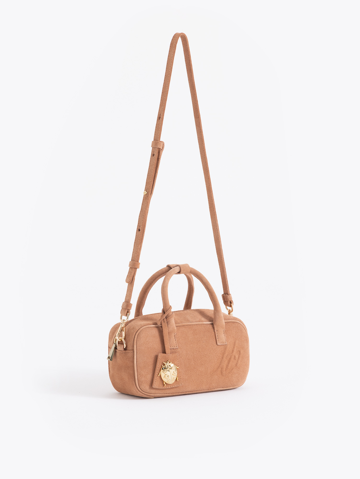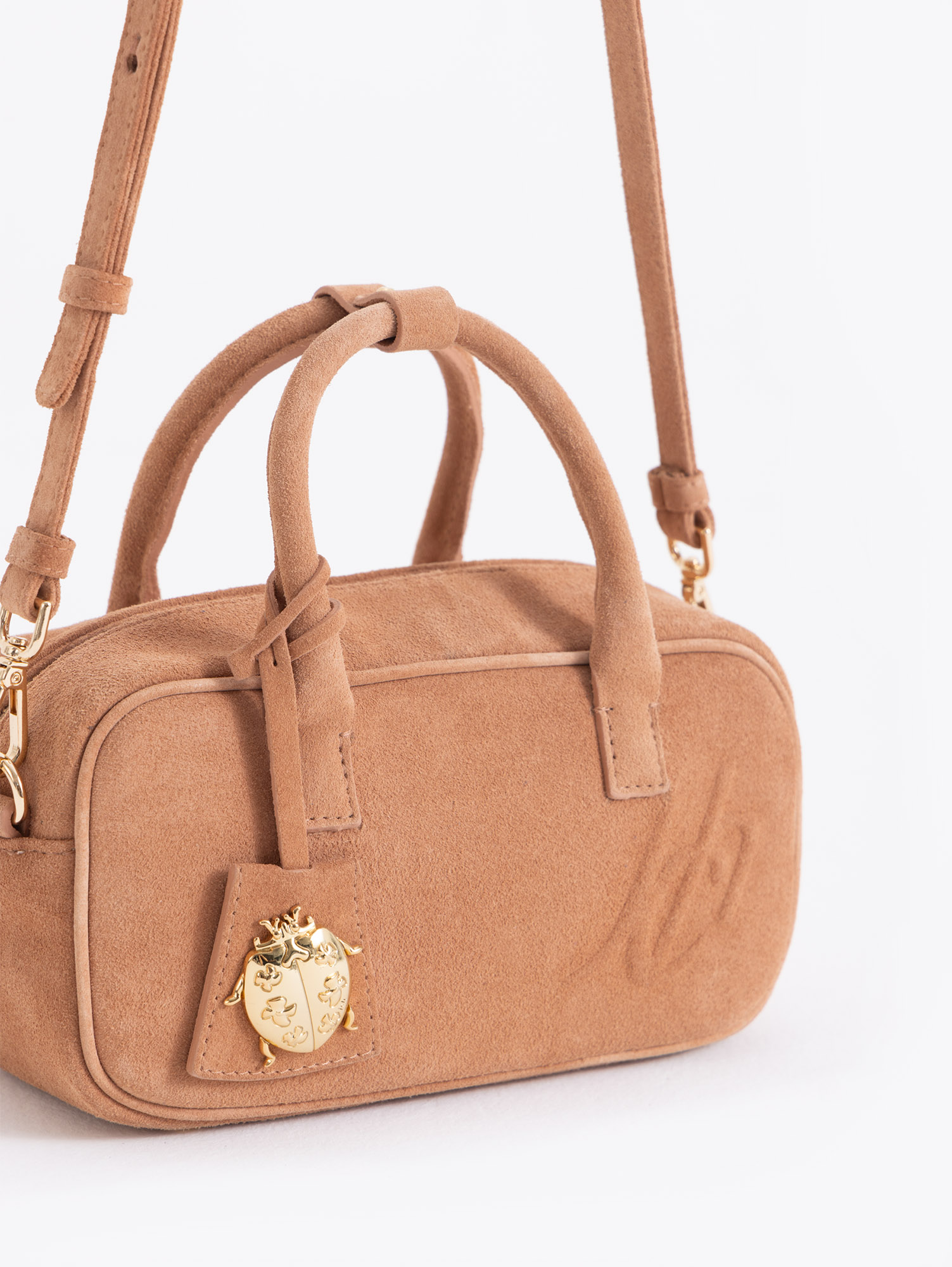 Baulito Lucky realizado en cuero descarne vacuno con gofrado JCH en la tapa delantera. Incluye correa larga desmontable y regulable que permite llevarlo al hombro o cruzado. Lleva charm Lady Bag en el tag. Es compacto y versátil.