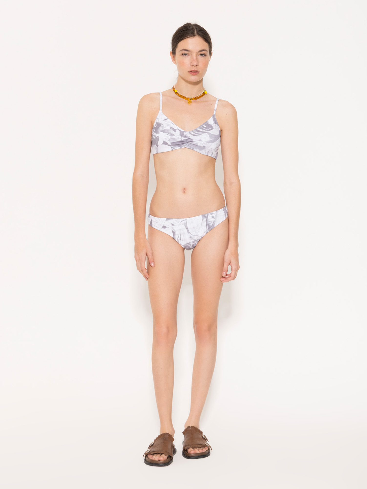 Bikini Summer de dos piezas confeccionado en tela con estampa full print. El corpiño presenta frunce en el centro del escote y tazas desmontables, mientras que la bombacha tiene tiro medio, brindando un calce cómodo y favorecedor.