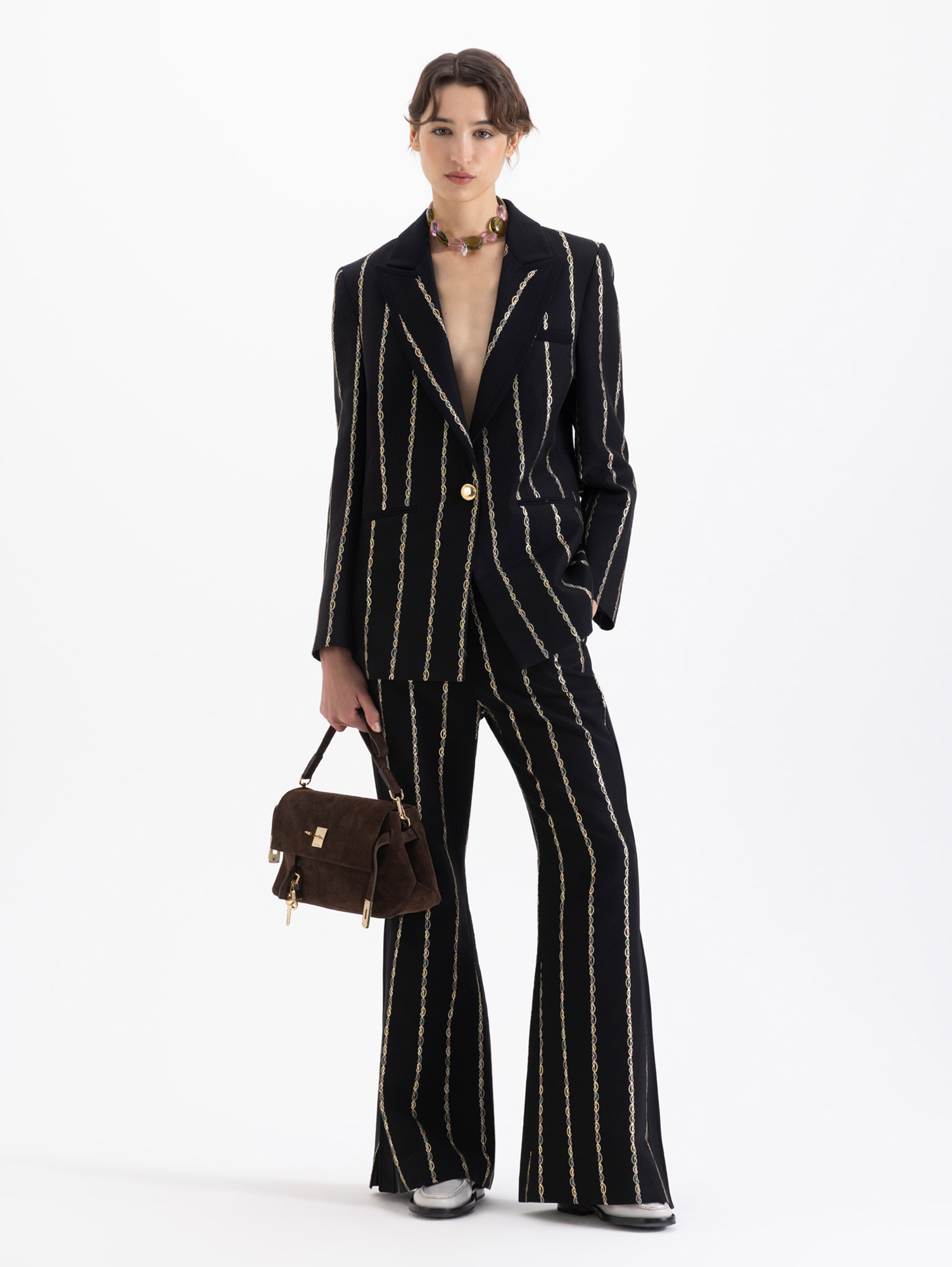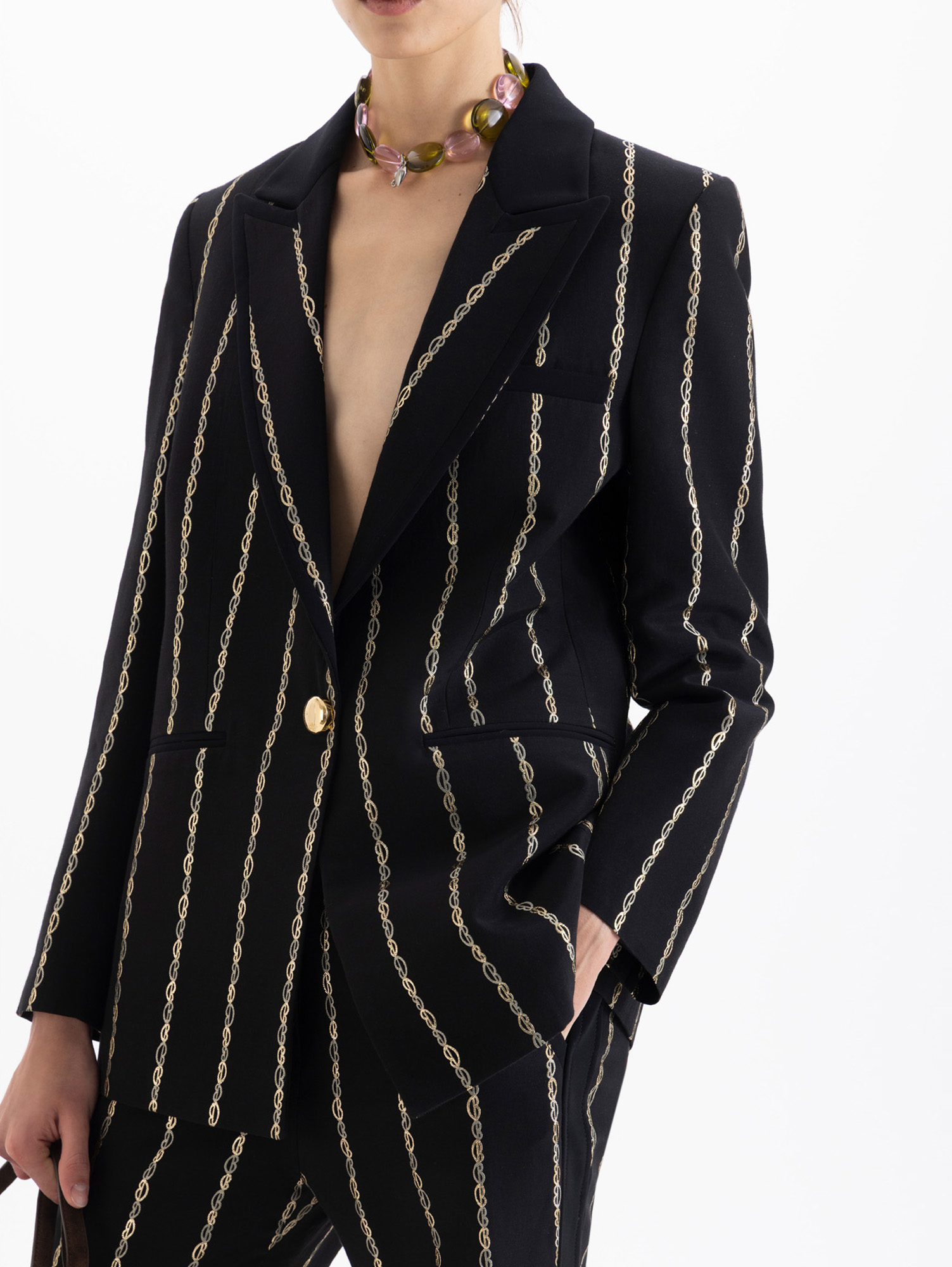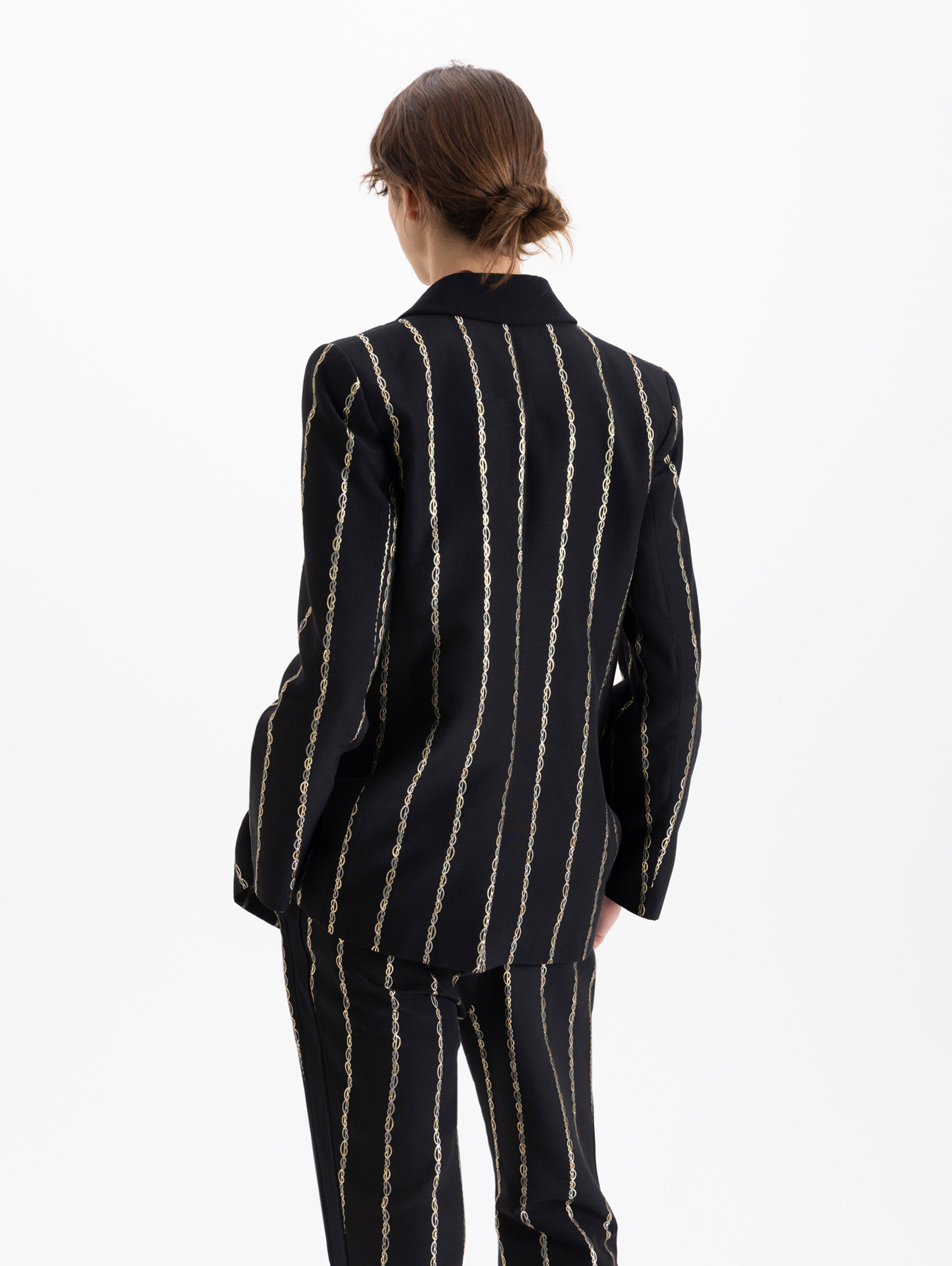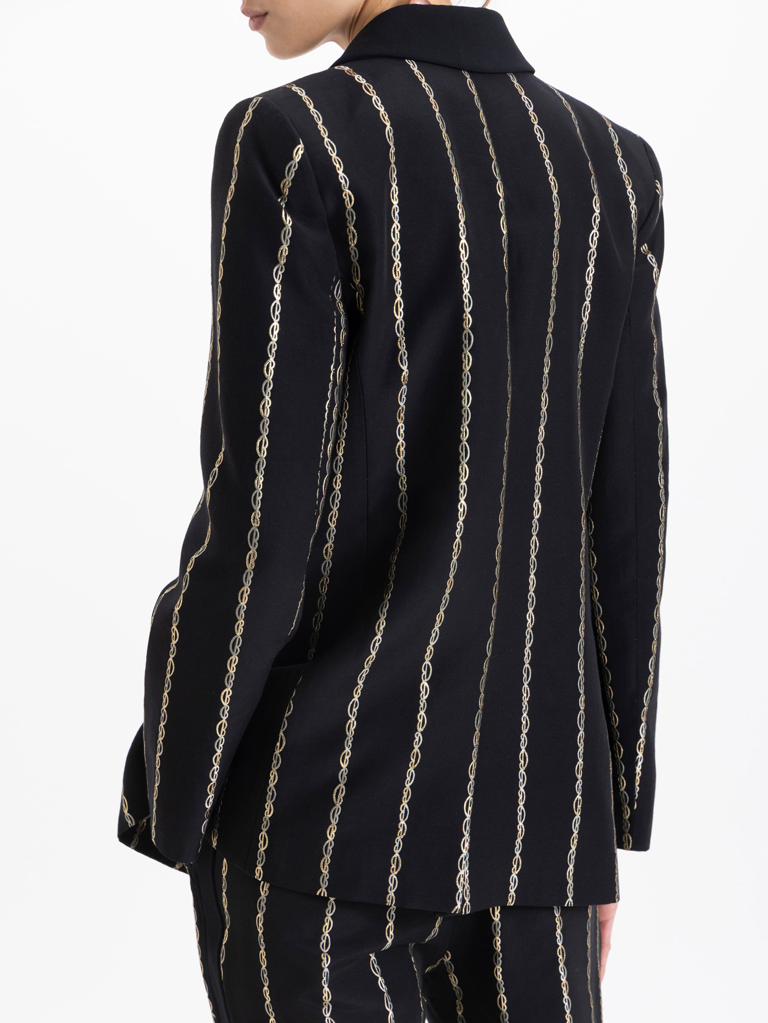 Blazer Lovers confeccionado en jaquard con boquitas que forman rayas. Incluye bolsillo relojero y ojal. Trae solapa con vivo en complemento y cuello y broche snap dorado JCH. Largo hasta abajo de la cadera y es de fit regular.