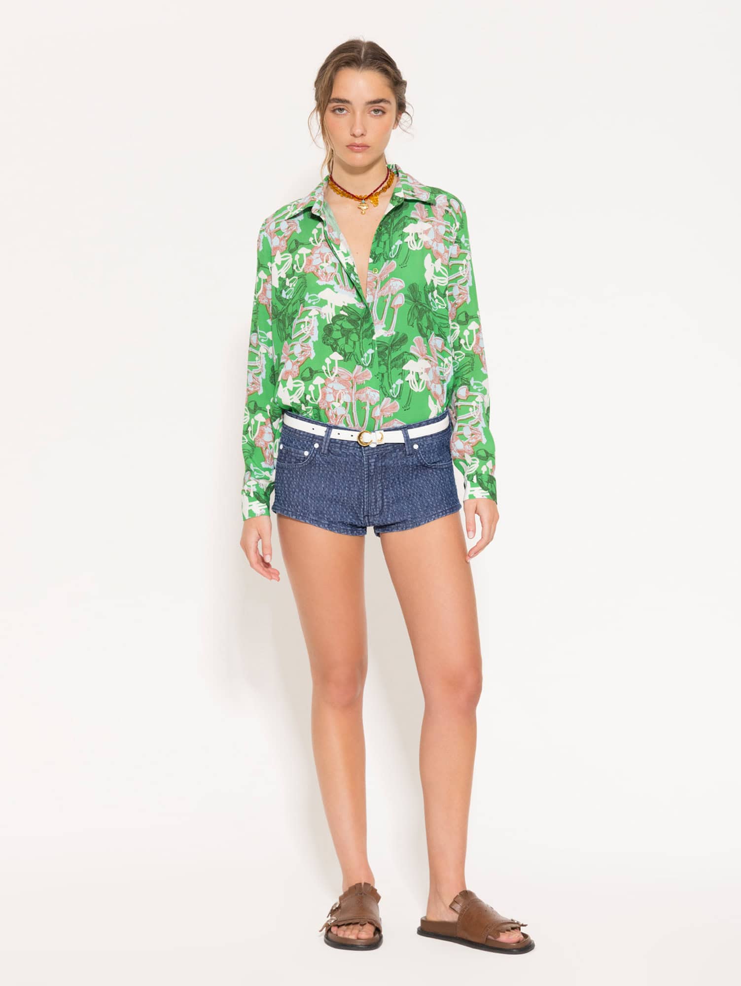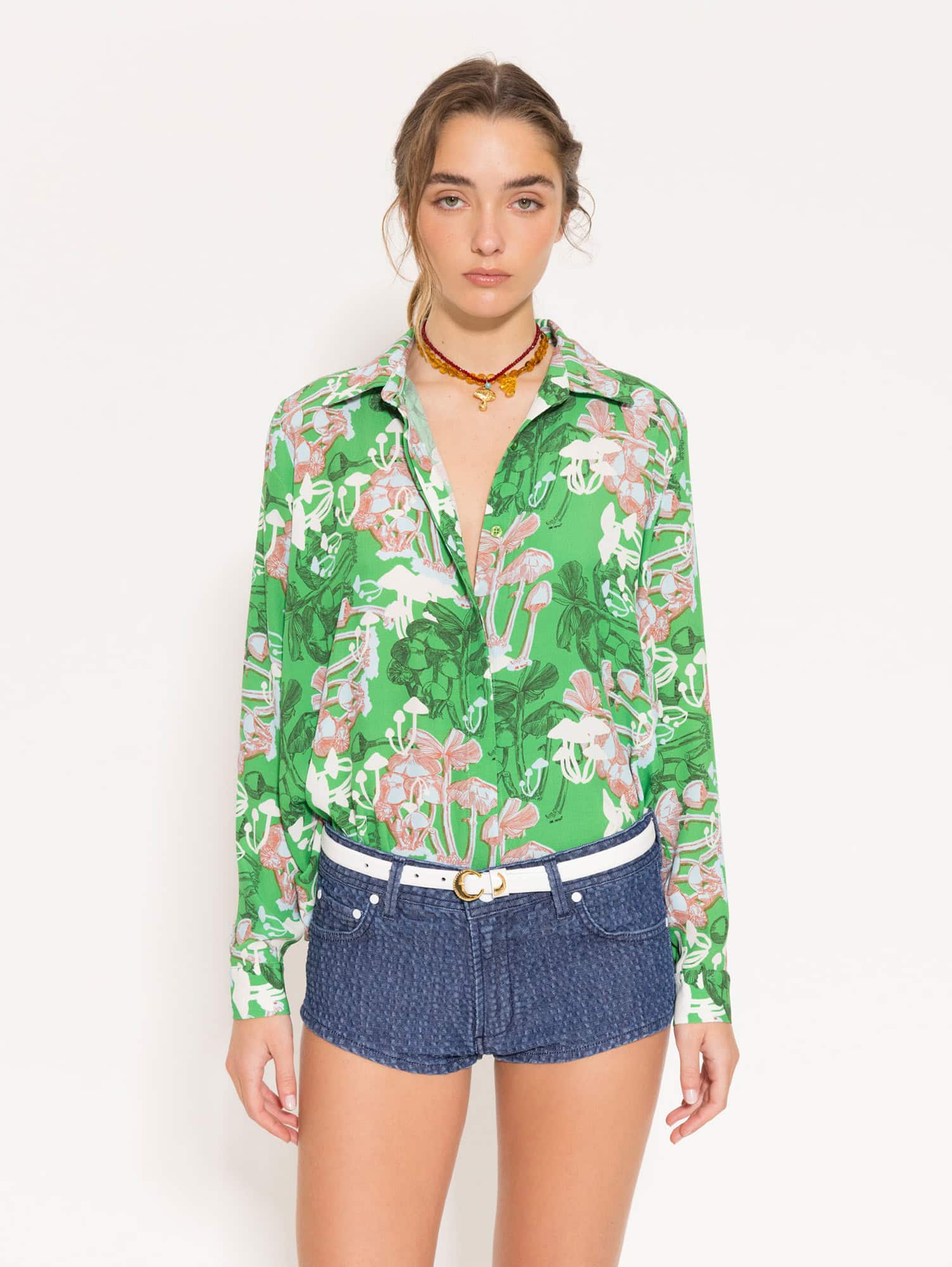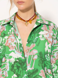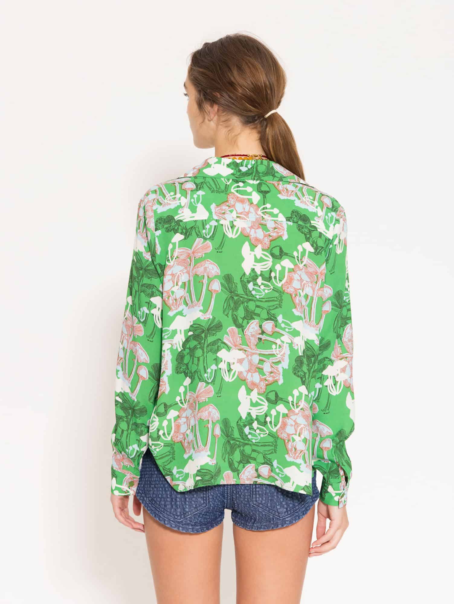 Camisa Elfie confeccionada en delila con estampa exclusiva de JCH. De fit relajado y caída fluida, viene con cartera oculta y botones de pasta teñidos a tono con logo marcario. Un diseño versátil con impronta propia.