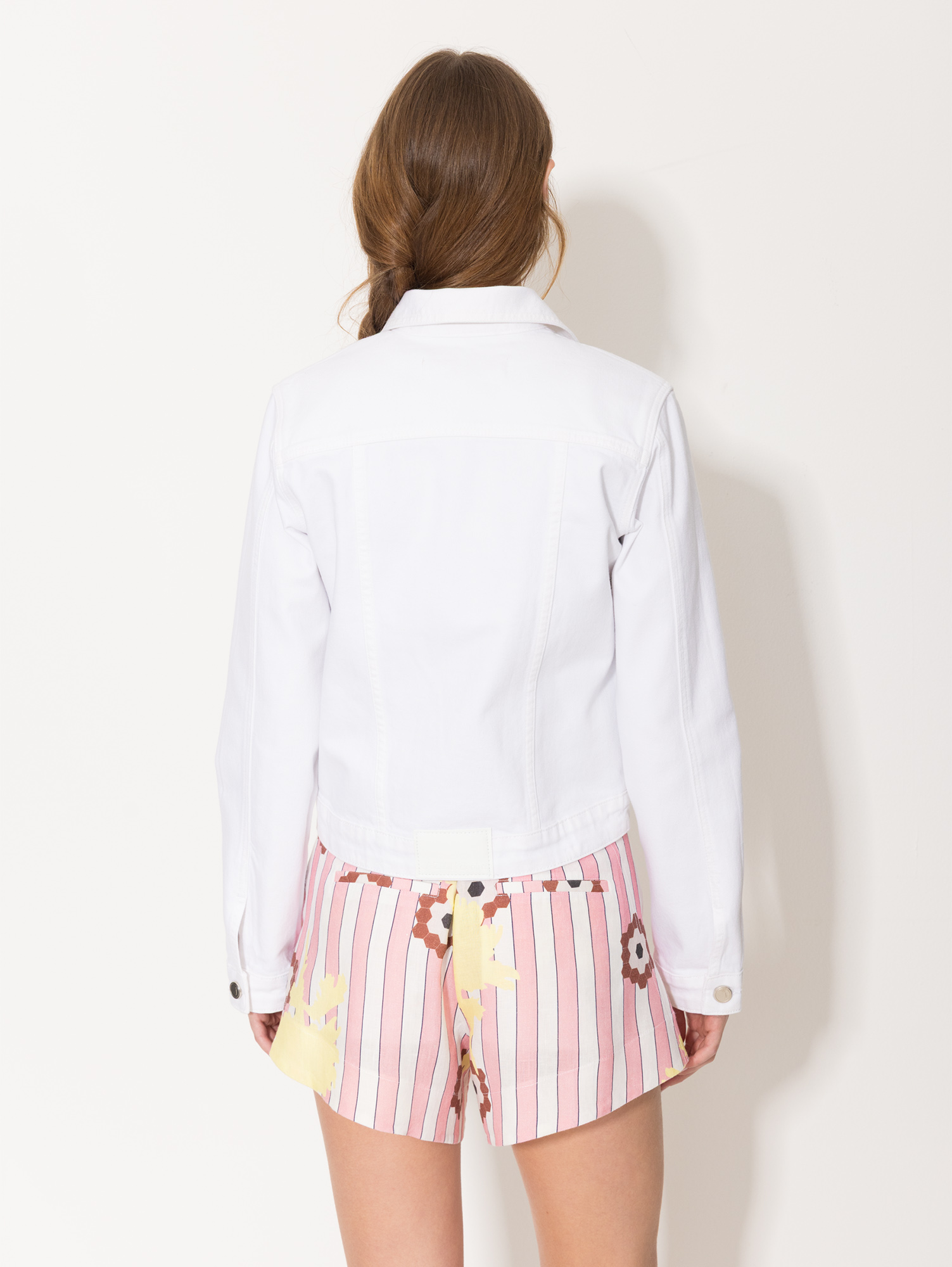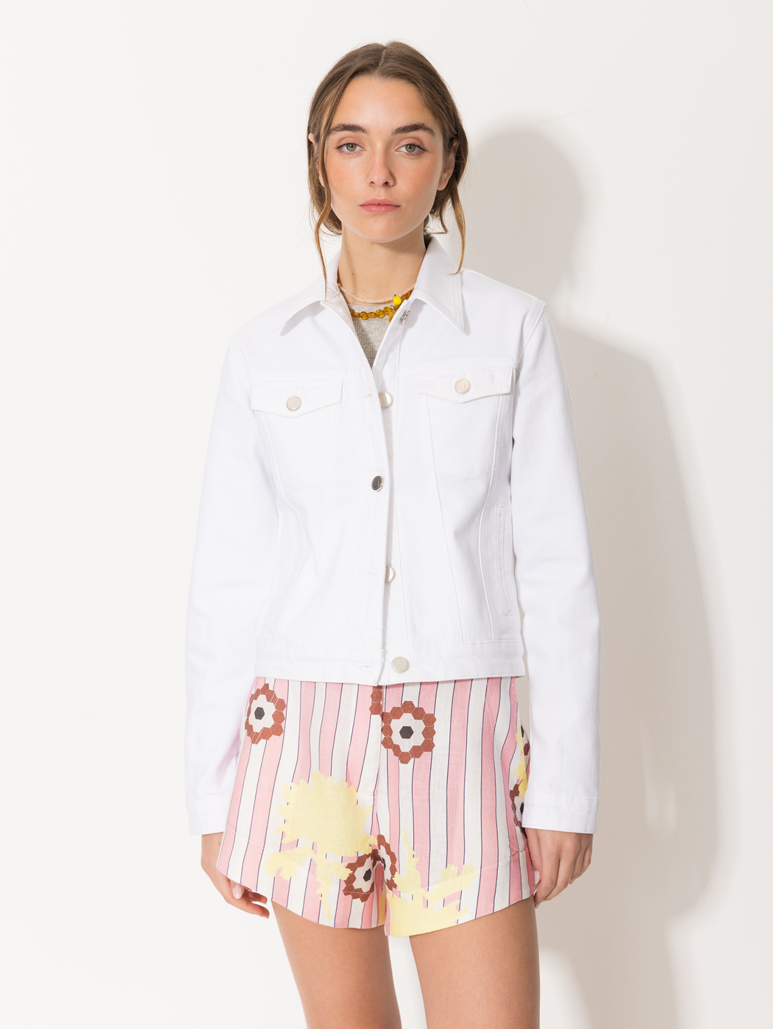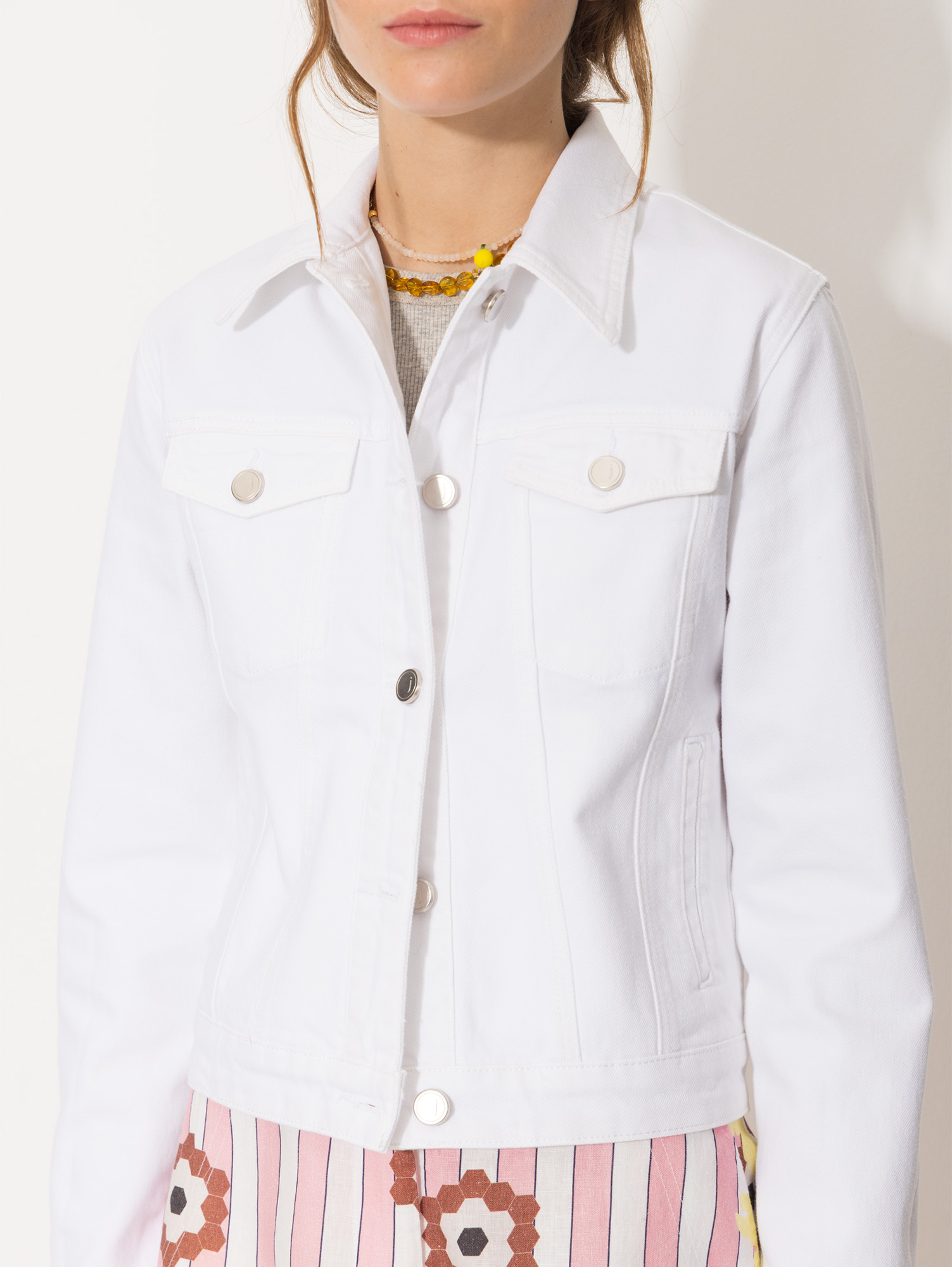 Campera Trucker White clásica de fit slim, confeccionada en gabardina blanca con lycra para mayor confort. Su diseño entallado acompaña la silueta sin perder movilidad, ideal para complementar looks frescos con un toque urbano.