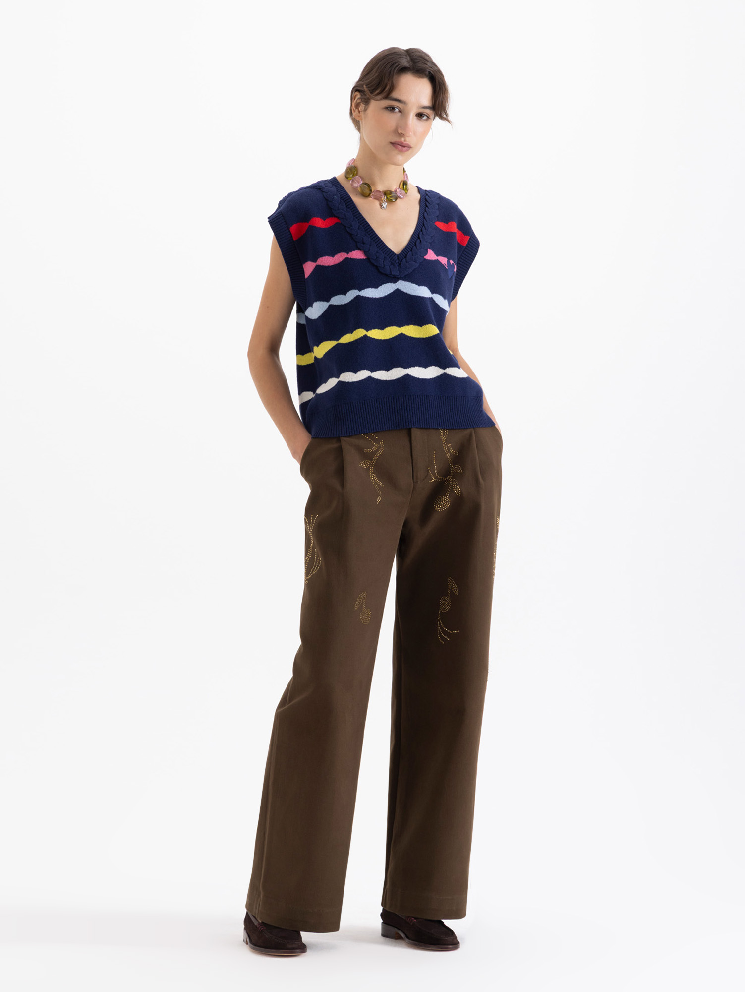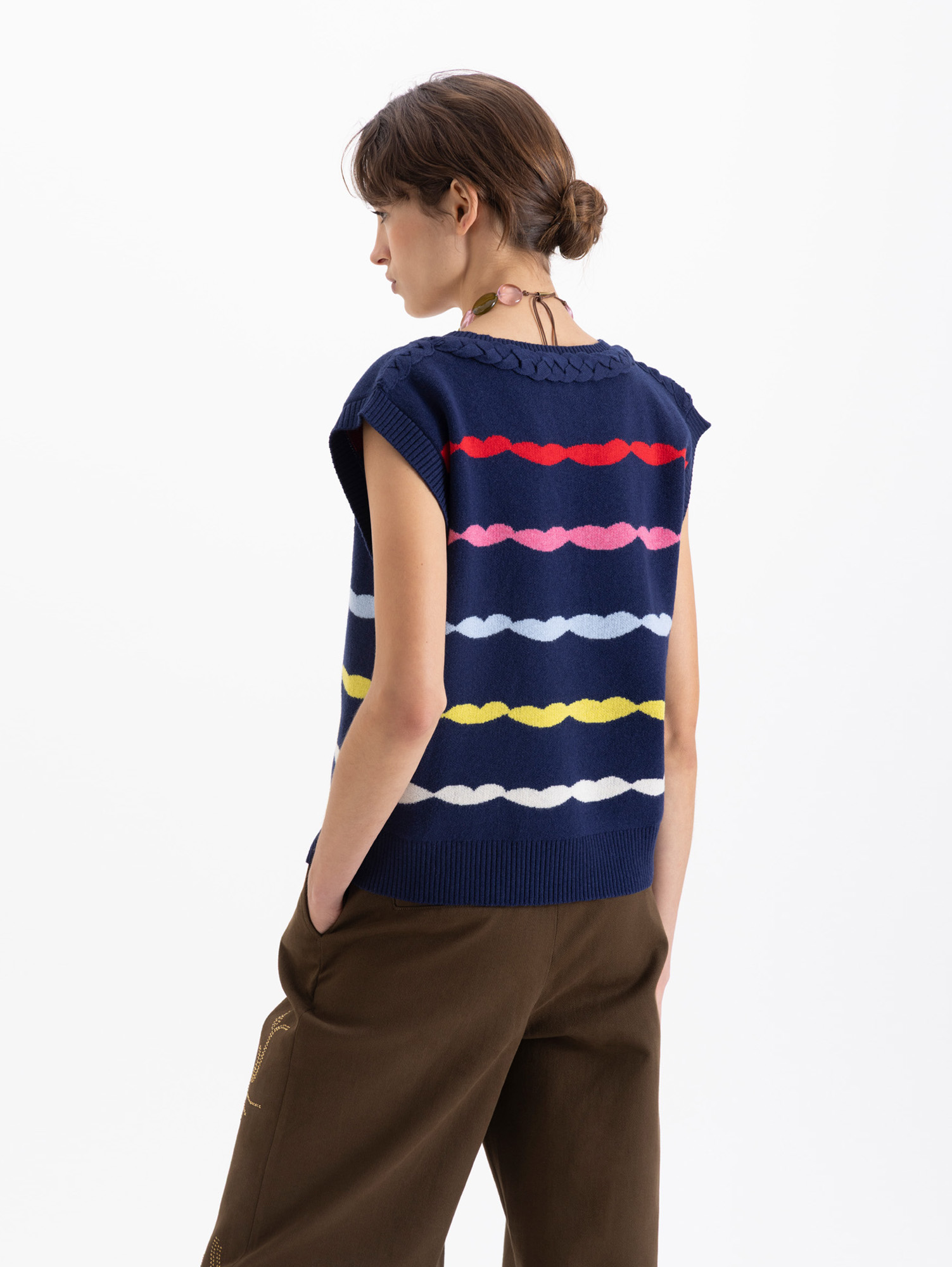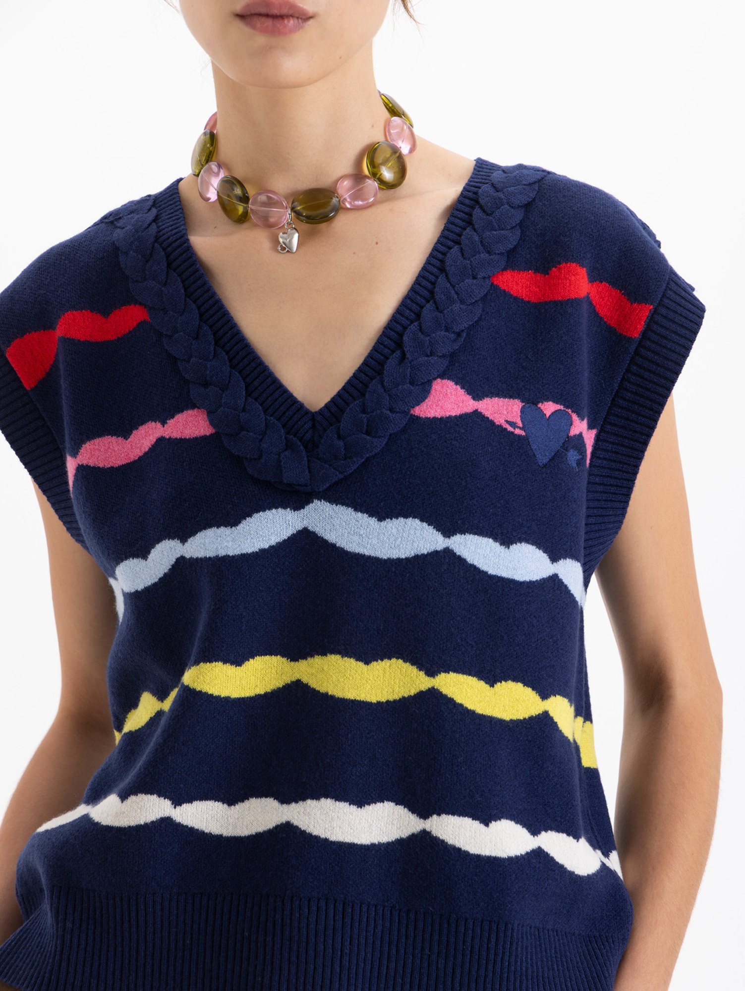 Chaleco Bacio de tejido multicolor y texturas contrastantes. En el frente lleva bordado tipo escudo que refuerza su impronta colegial. Ideal para superponer y jugar con capas en looks de media estación.