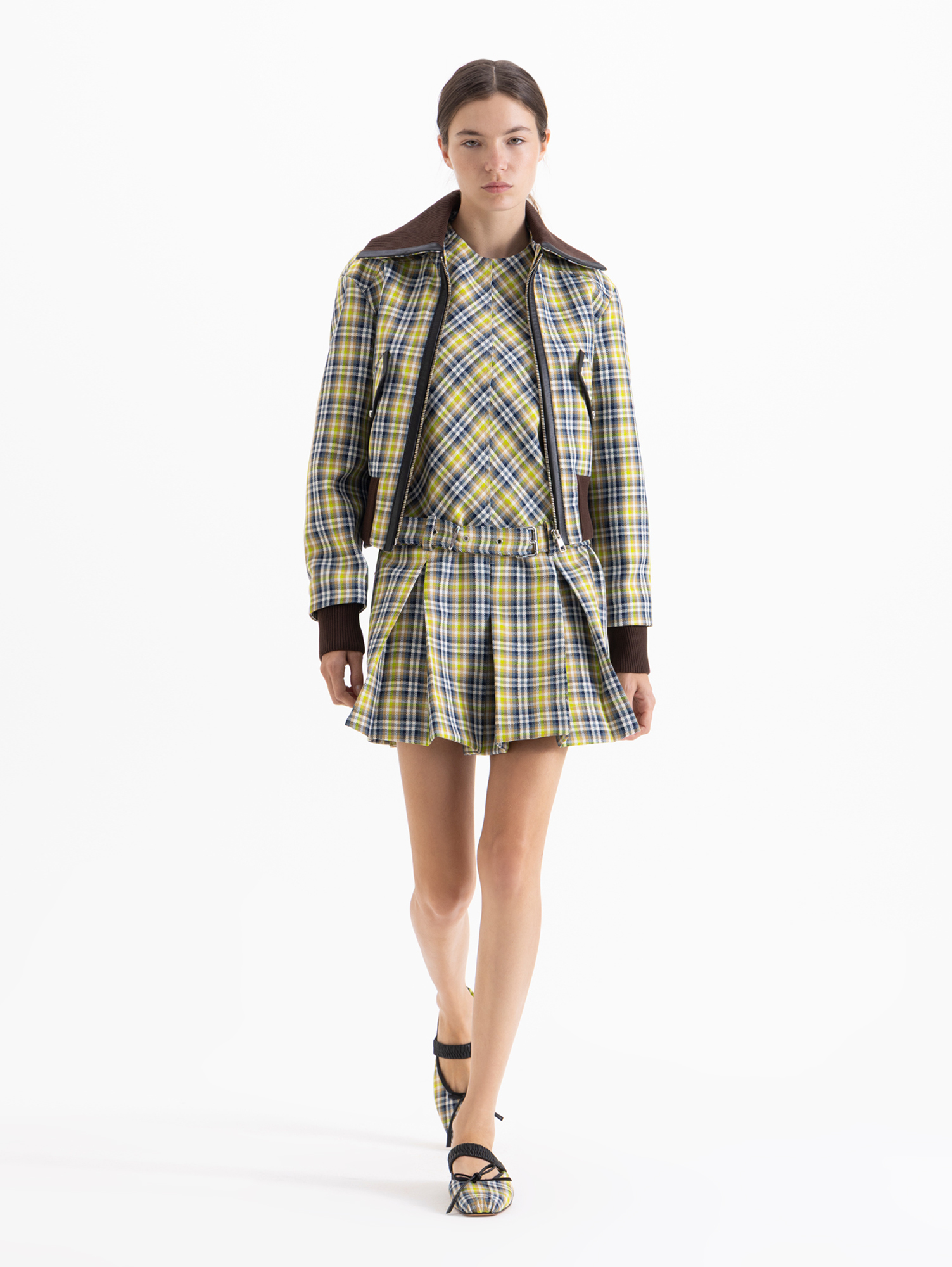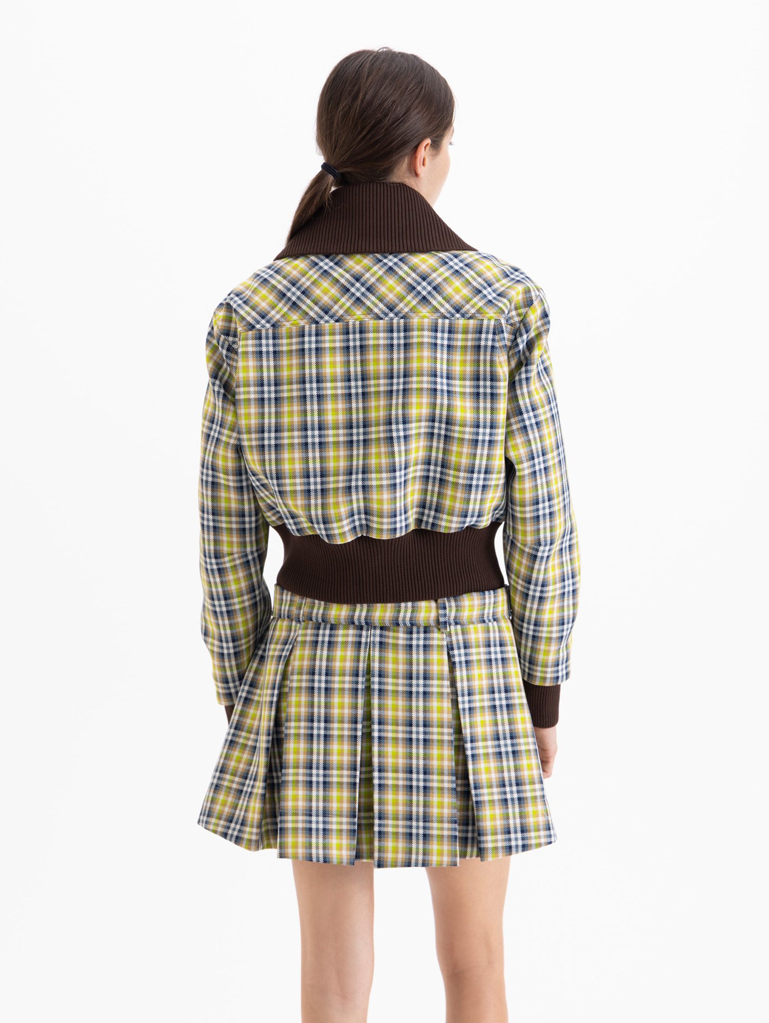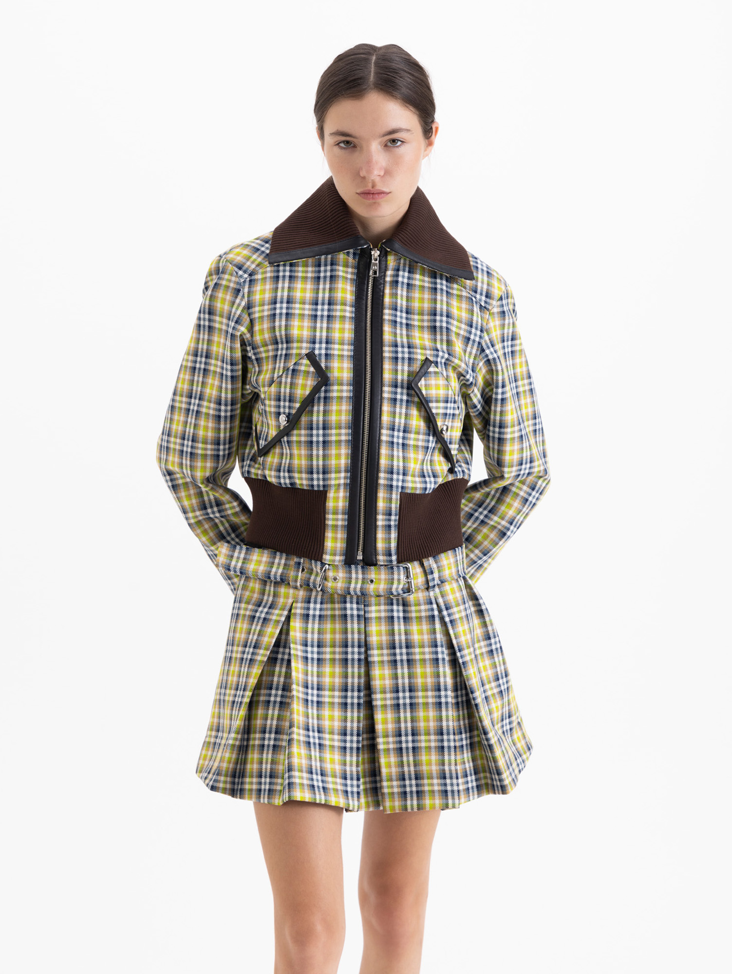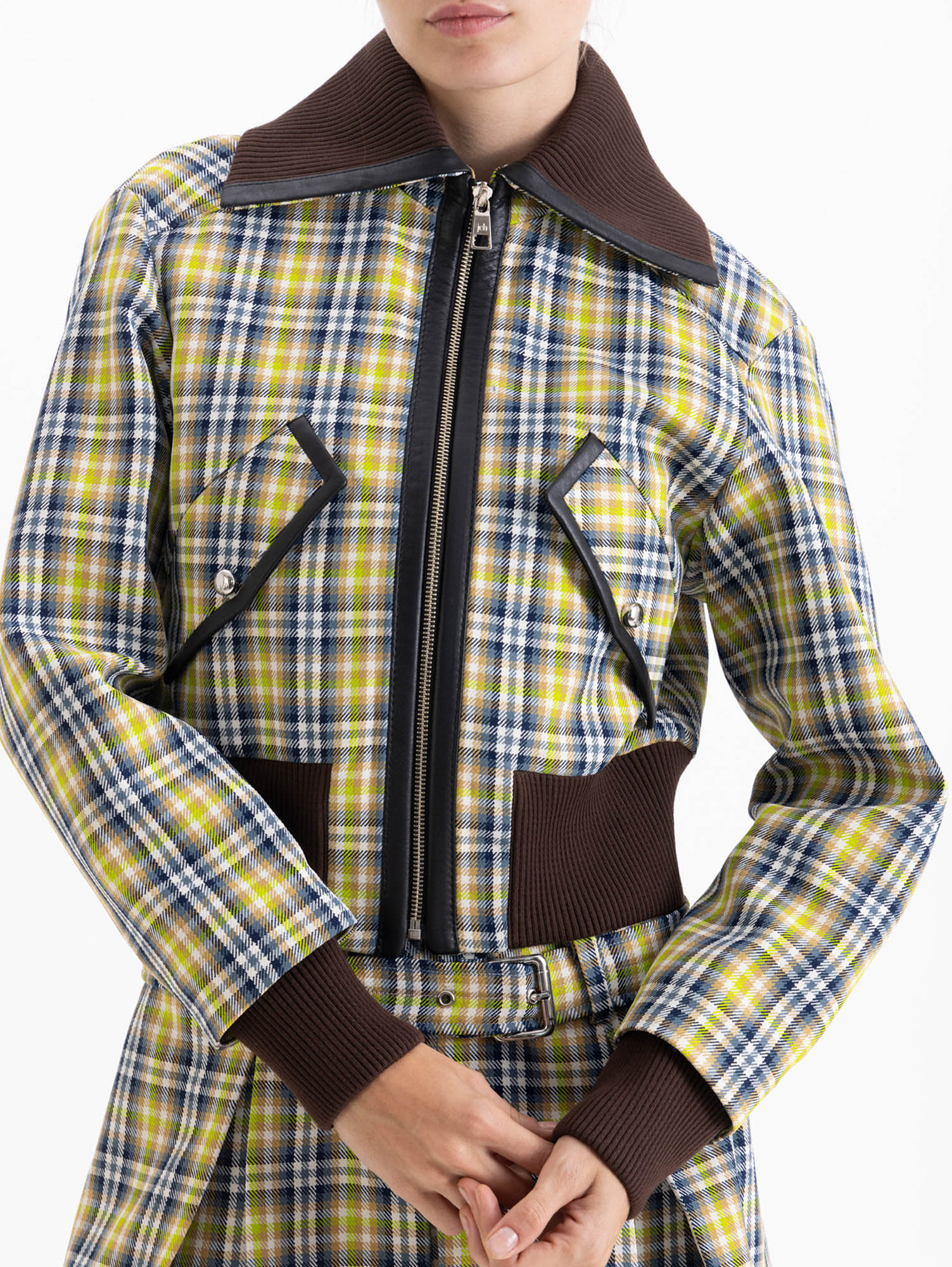 Chaqueta Wales de diseño tipo cropped confeccionada en lanita cuadrillé. Incorpora terminaciones en tejido ribb color chocolate en cuello, puños y ruedo, generando contraste y calidez. Se destaca por sus vivos en cuero en bolsillos y cartera.Presenta bolsillos con tapa, asegurados con botones fat níquel.