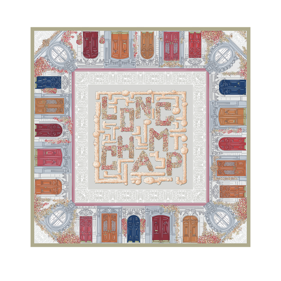 Reconocidas mundialmente por su elegancia arquitectónica, las puertas cocheras aparecen en este gran pañuelo de seda, revelando un misterioso laberinto que te lleva al corazón de París. Lleva esta delicada pieza sobre los hombros para un toque refinado o llévala como cinturón para realzar tu silueta.