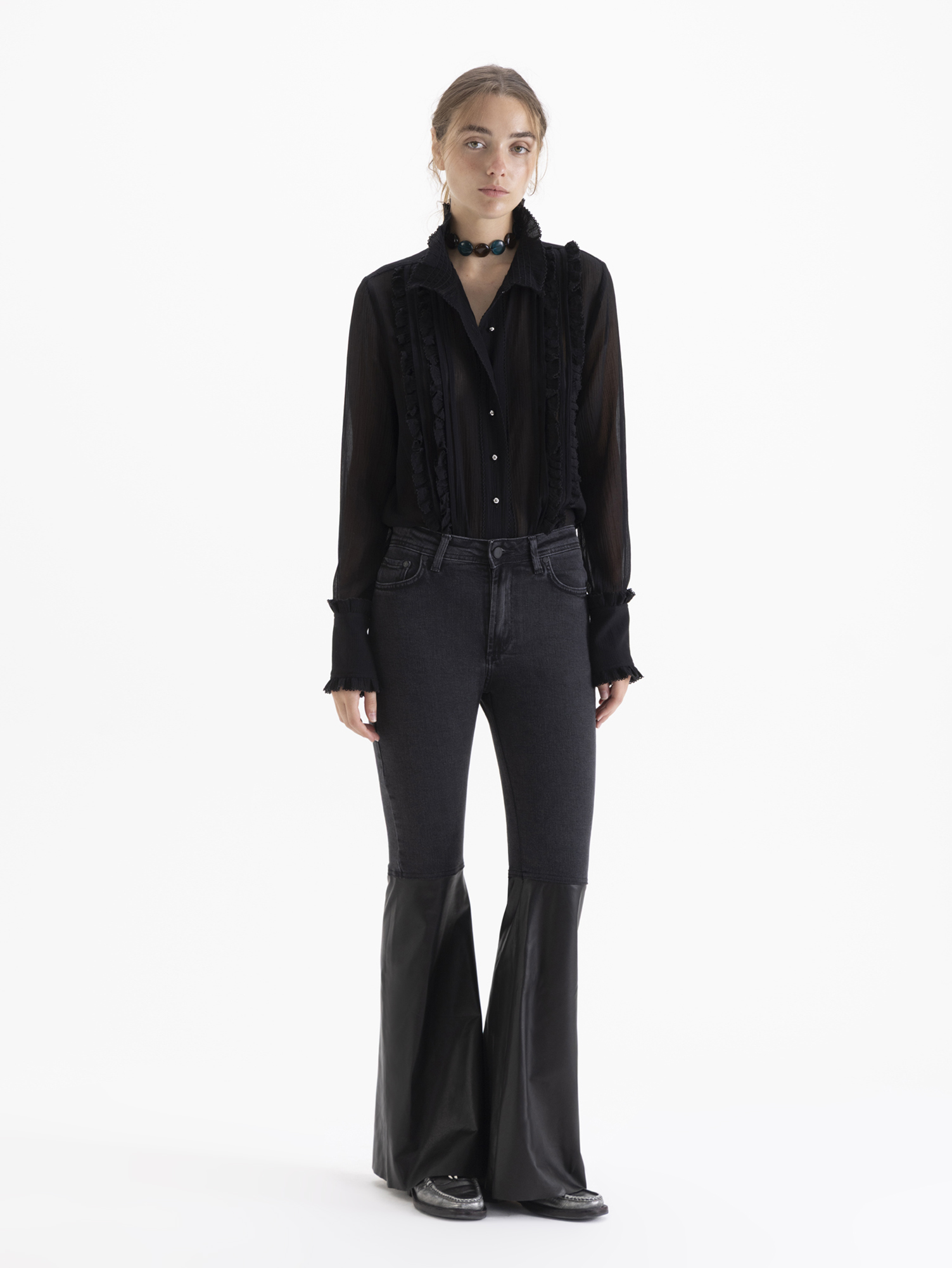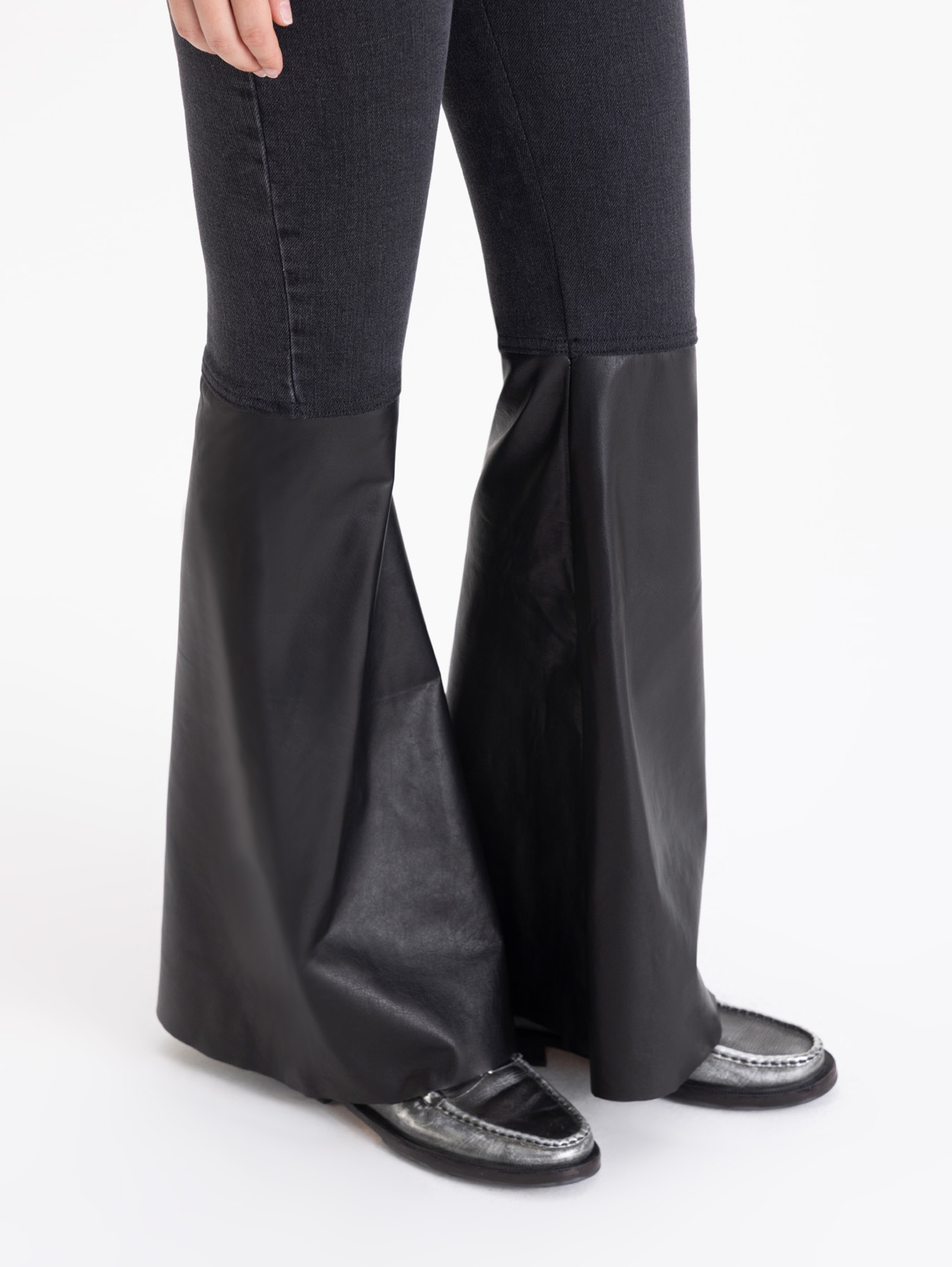 Jeans Kurt Black bootcut, confeccionado en denim elastizado con botamanga enteramente de cuero al tono.
