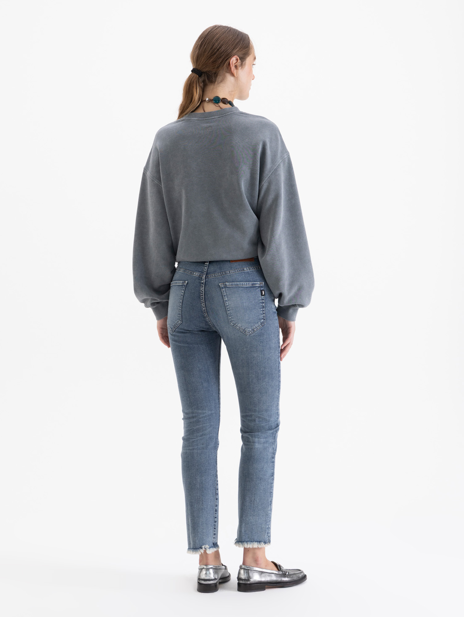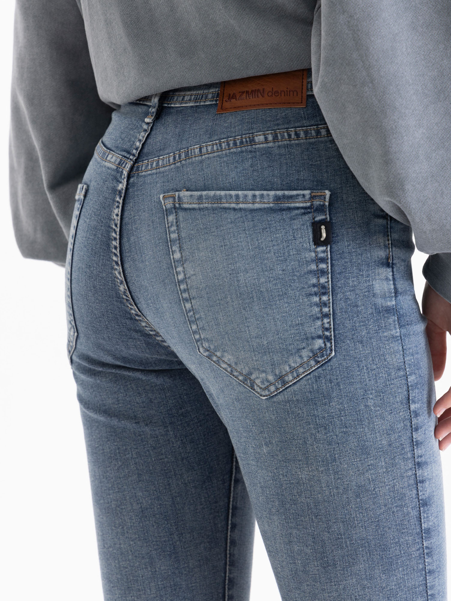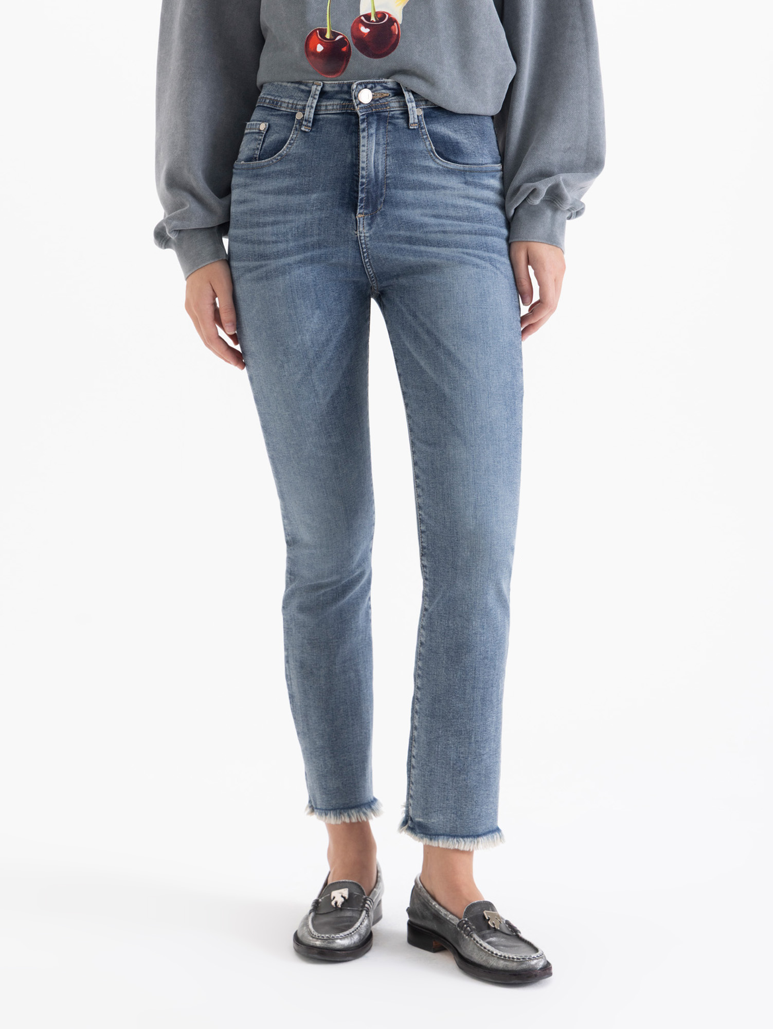 Jeans Richie Summer de fit cropped, es de tiro medio confeccionado en tejido con lycra. El largo es por arriba del tobillo, termina con la botamanga bien recta y desflecada.