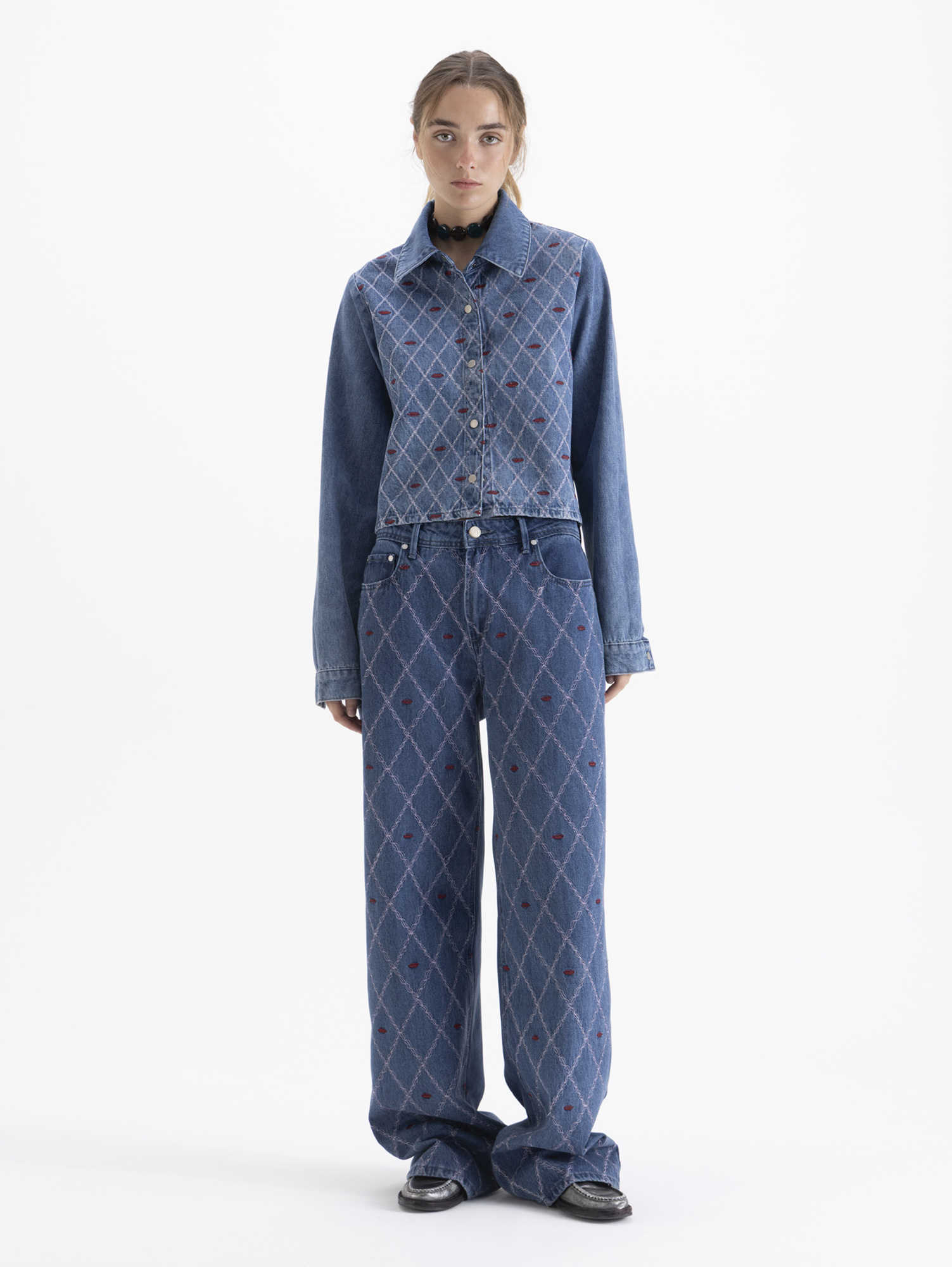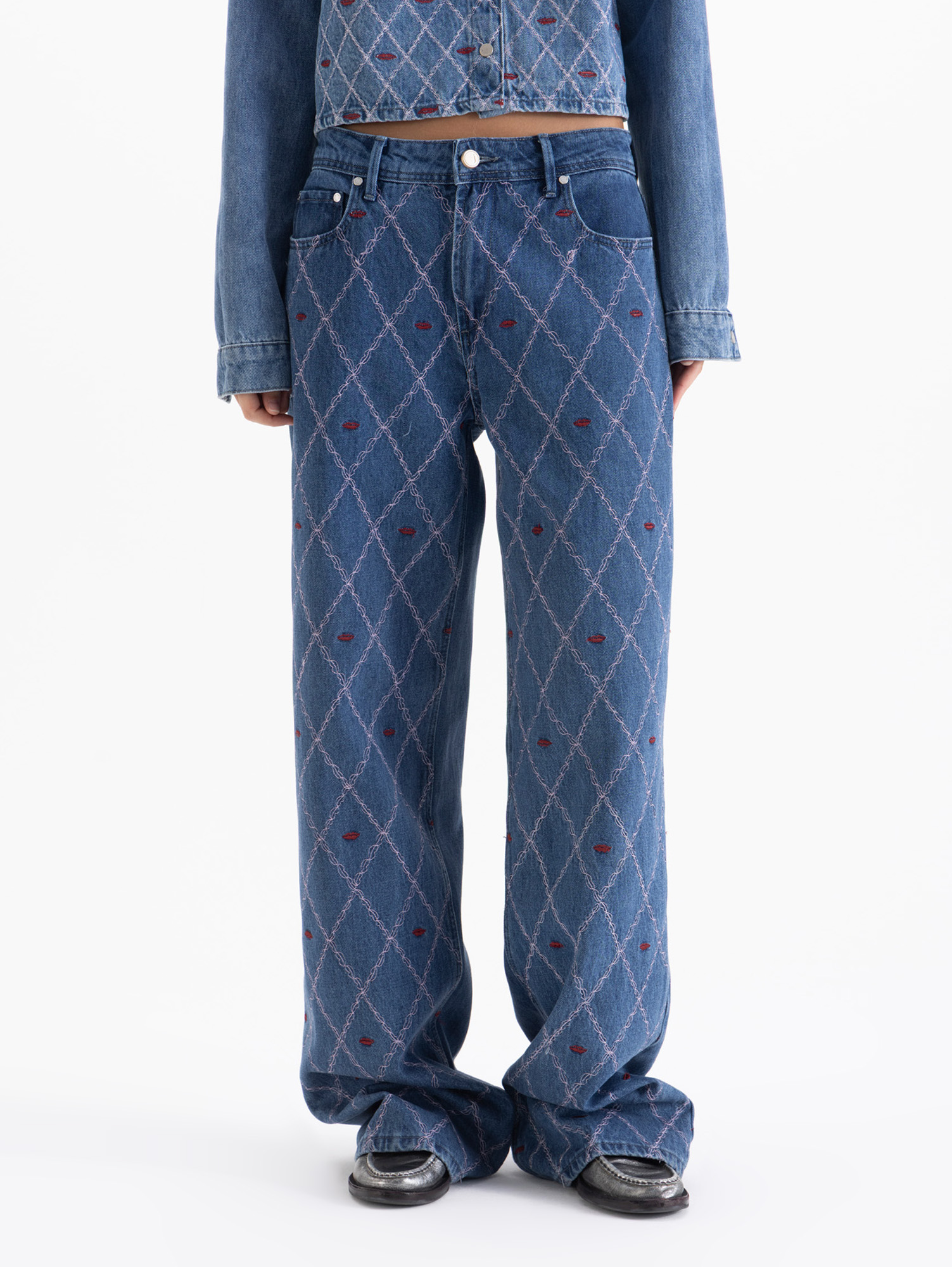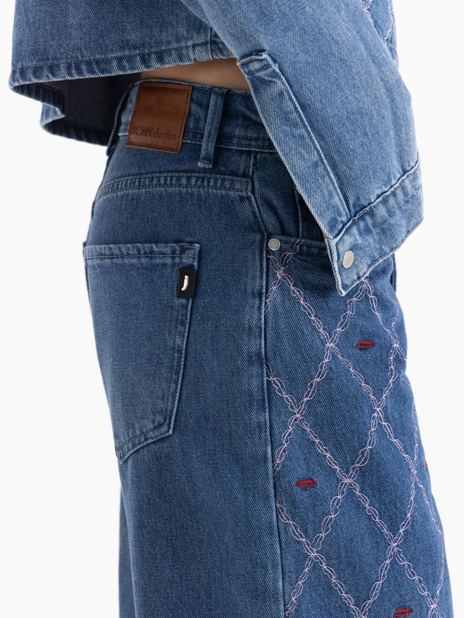 Jeans Straight Kiss de fit recto y tiro medio. Lleva bordado exclusivo en rosa y bordeaux en delantero.