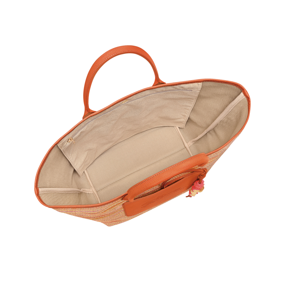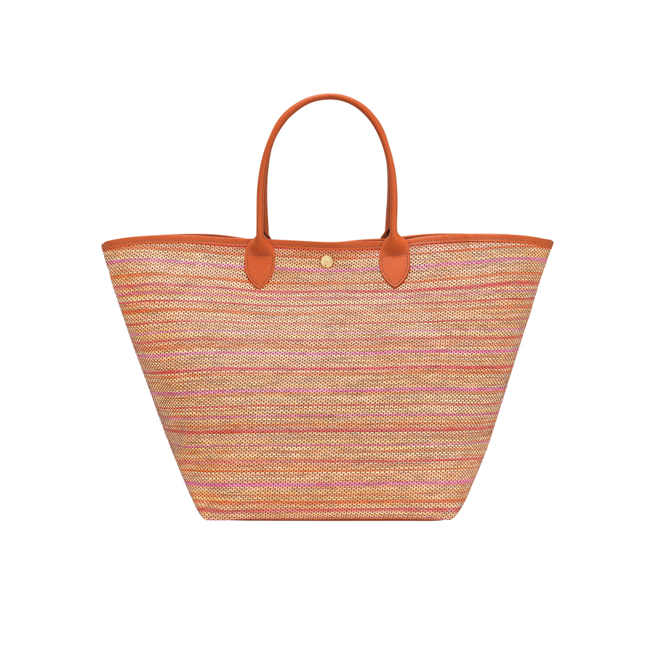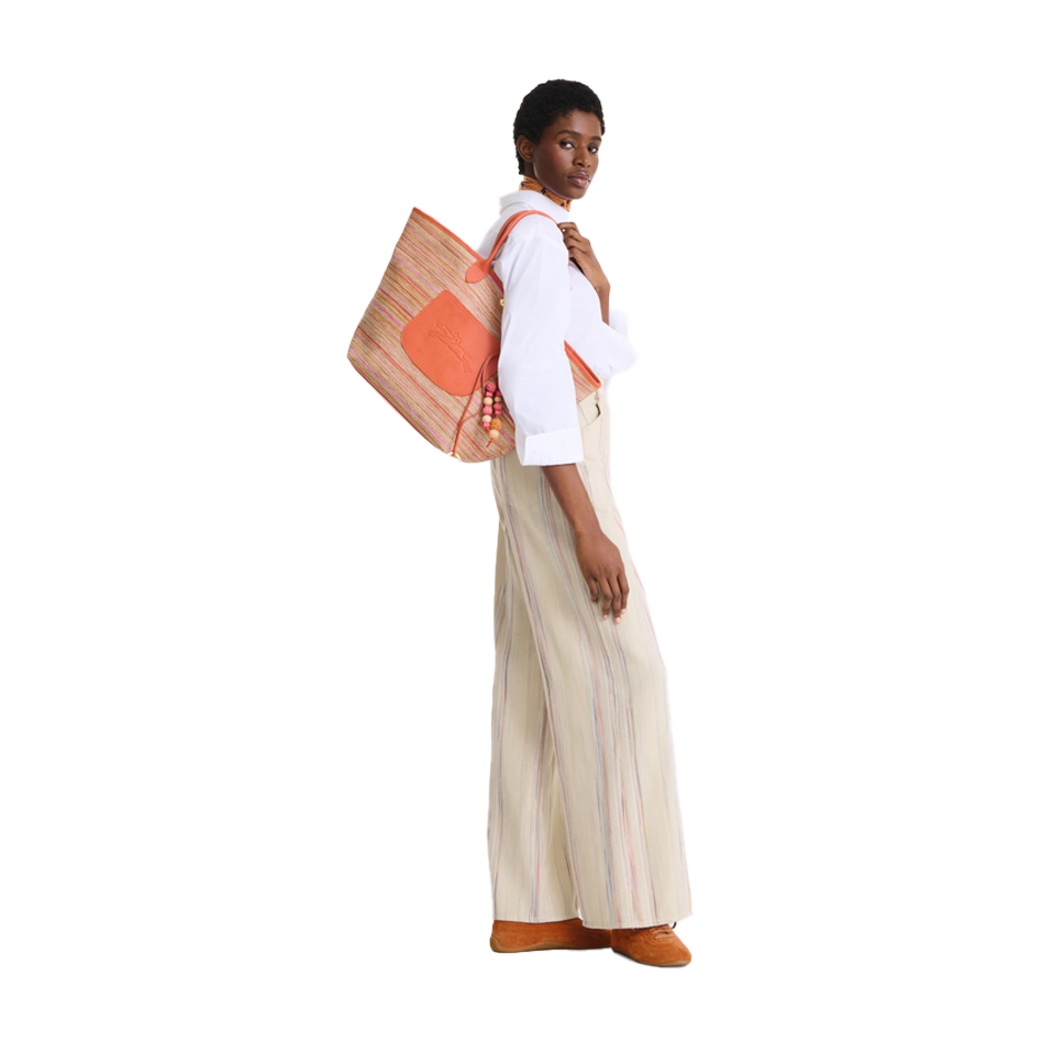 El bolso Le Panier Pliage grande reinventa el clásico bolso de mimbre con un toque fresco y veraniego. Confeccionado en lona con efecto paja en un radiante degradado arcoíris —que evoca cielos de verano y coloridas esterillas de playa—, está rematado con elegantes detalles de piel y un charm artesanal de cuentas de madera y un cordón de piel que imita el movimiento de las olas del mar. Diseñado para un estilo veraniego sin esfuerzo, cuenta con cierre de botón a presión, un bolsillo exterior plano, un bolsillo interior con cremallera y una anilla adicional para mayor funcionalidad.