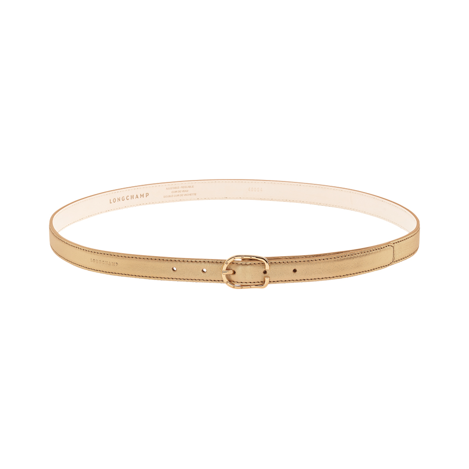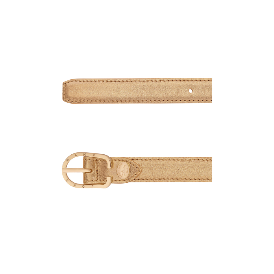 Inspirado en la tradición ecuestre de Longchamp, este fino cinturón presenta una hebilla delicadamente grabada que realza la belleza de la piel de becerro dorada metalizada. Inspirada en los estribos, la hebilla encarna la elegancia.