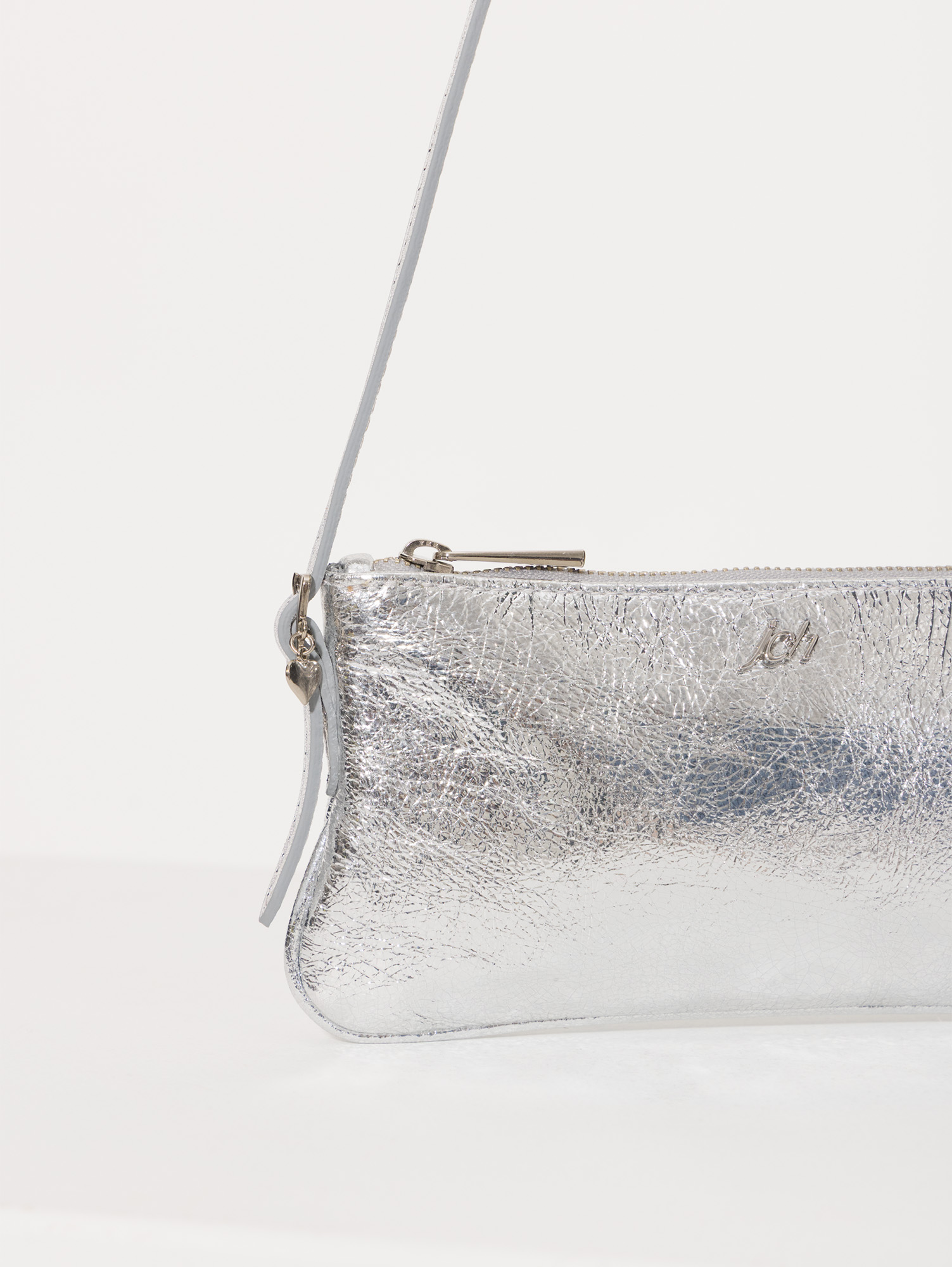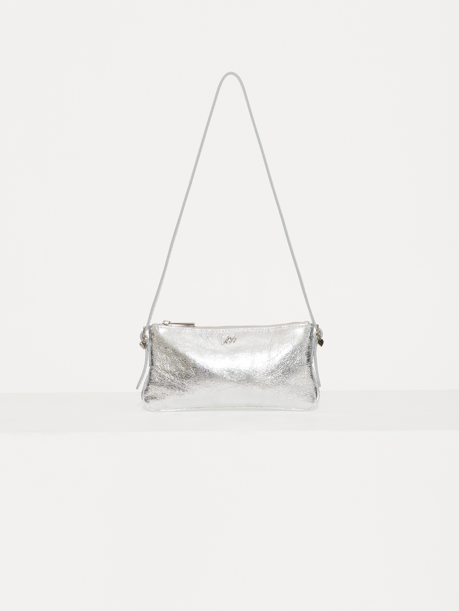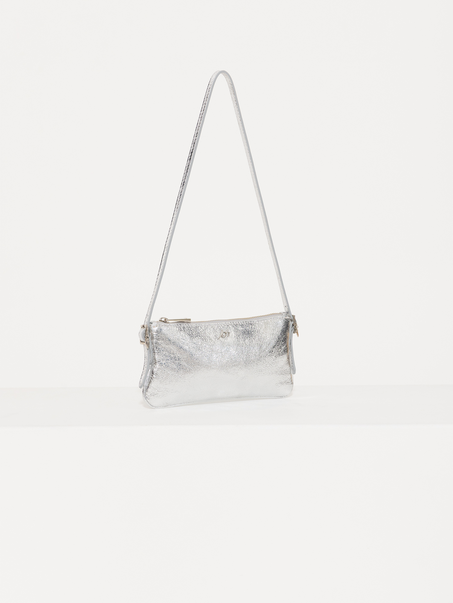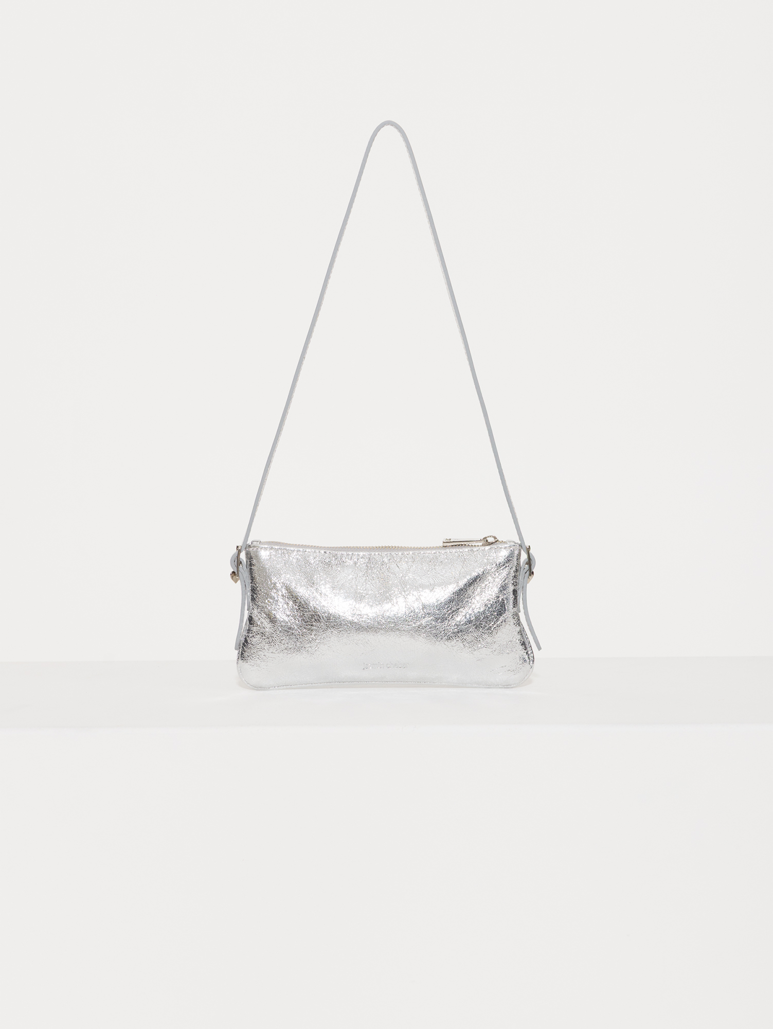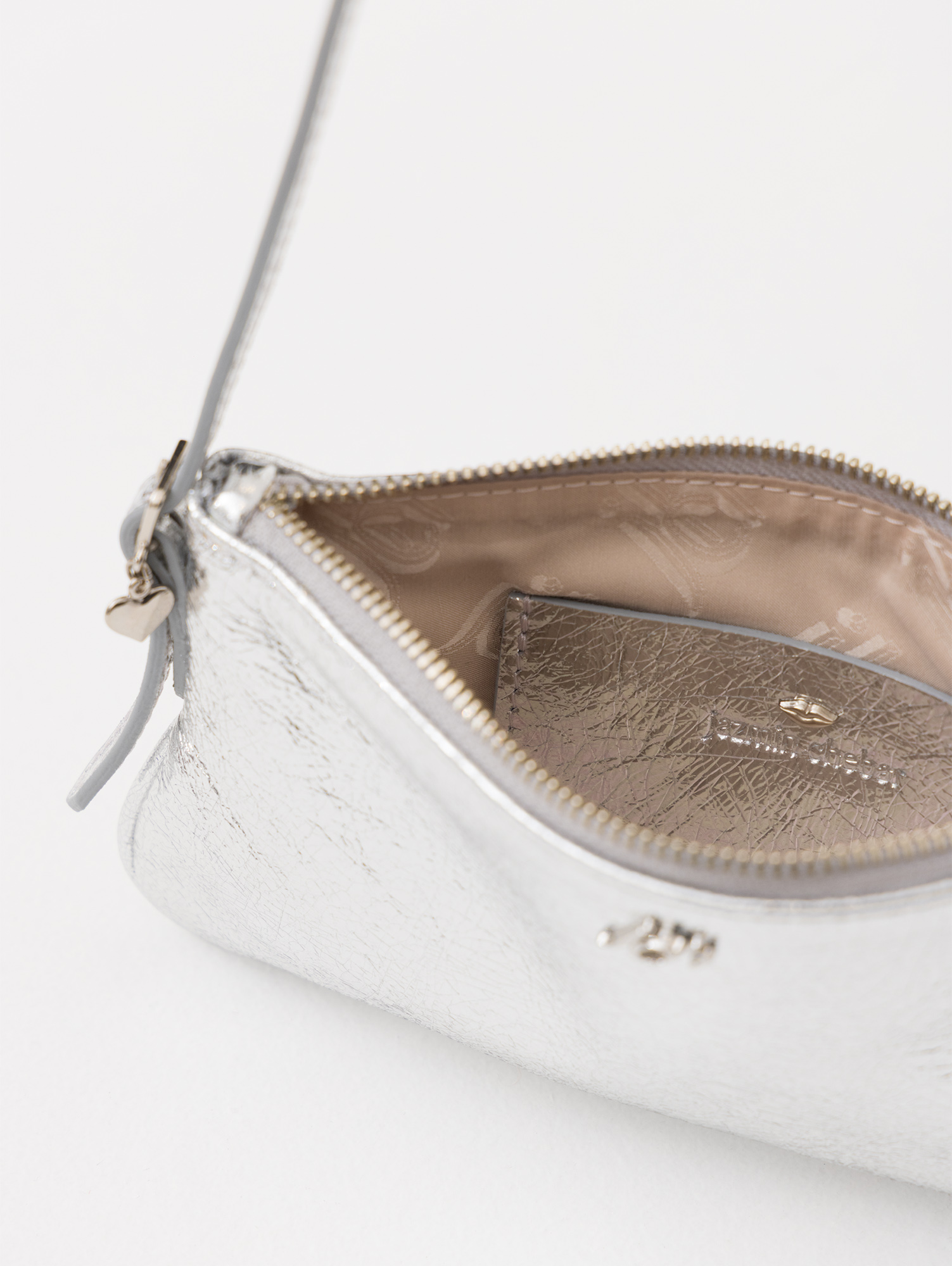 Composición Plateado: Cuerpo: 100% cuero vacuno flor Forrería: 100% poliéster Correa: 100% cuero vacuno flor
