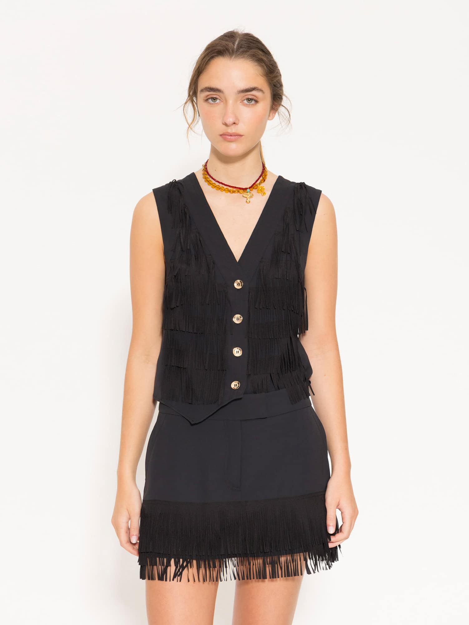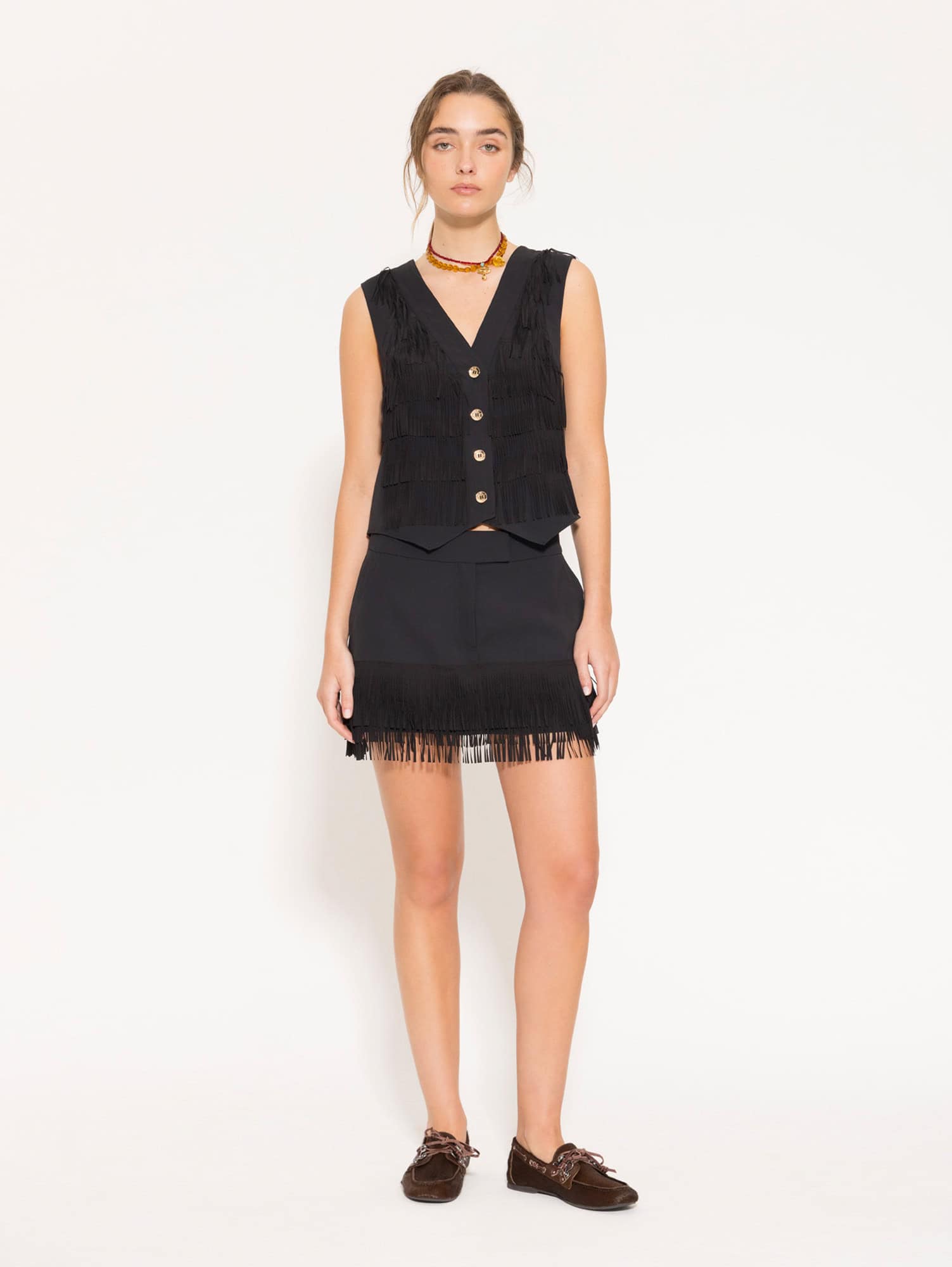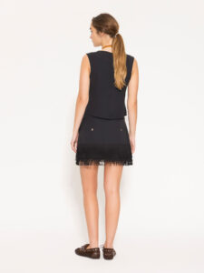 Mini Deep de corte corto por arriba de las rodillas. Lleva flecos en tela base sobre el ruedo que suman textura y movimiento. Incluye bolsillos laterales y traseros. El acceso es a través de ganchos pantaloneros en la cintura.