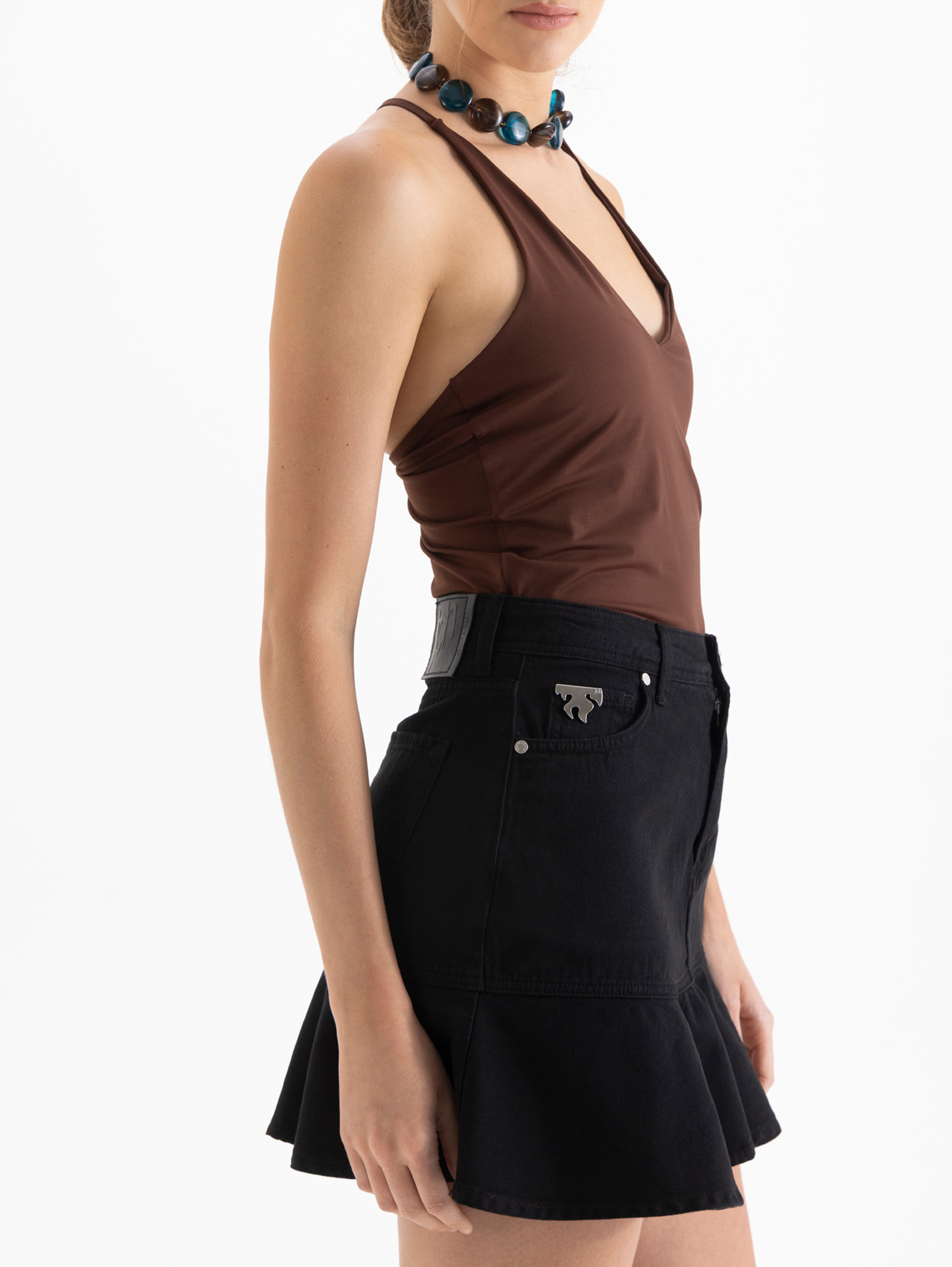 Mini Fire de estilo jeanero con volado en el ruedo. Lleva cinco bolsillos tradicionales de denim y remaches «Fire».