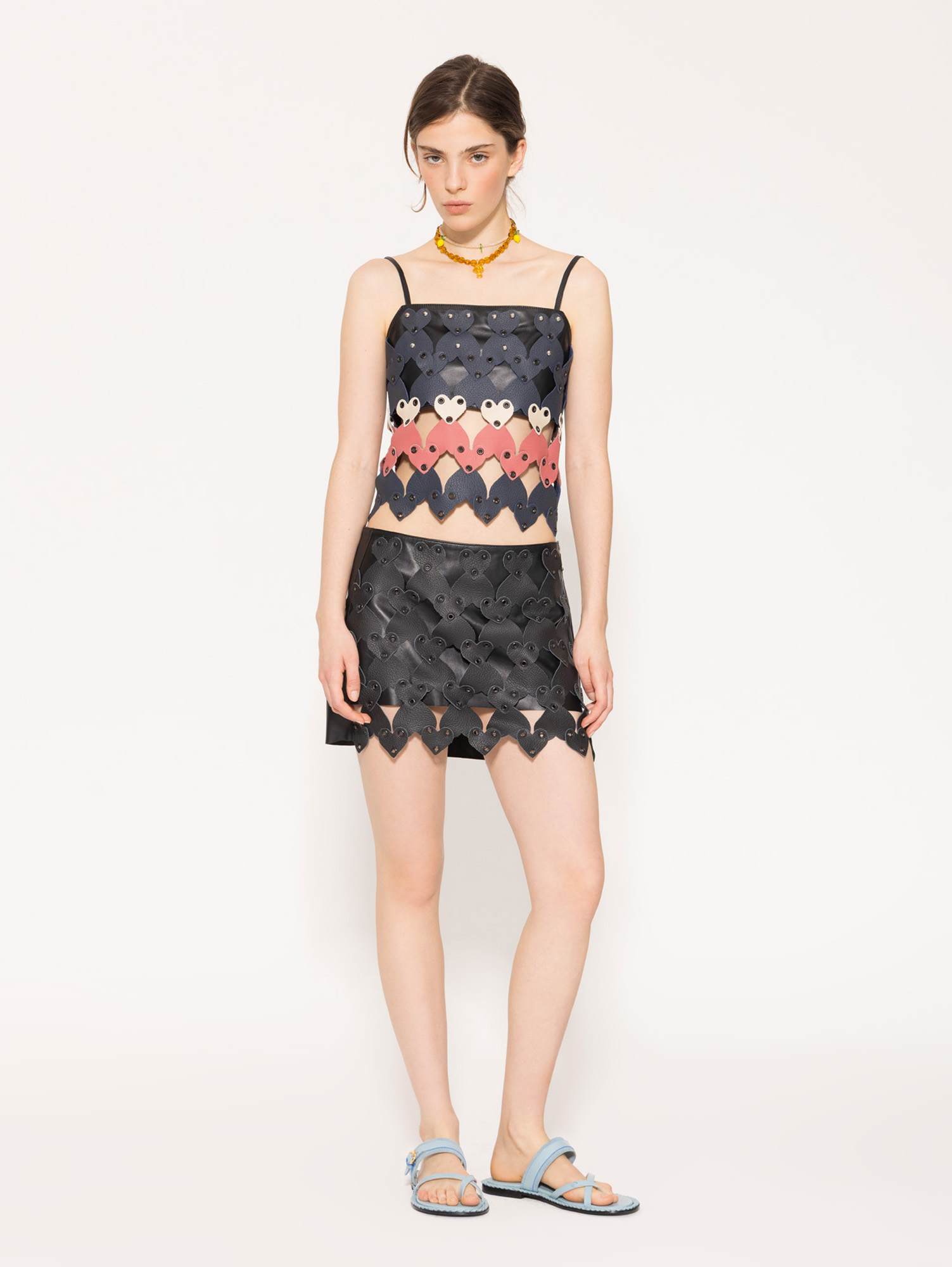 Mini Hearts confeccionada en cuero ovino con paño de corazones troqueladas de cuero vacuno. Lleva ojalillos metálicos níquel. Su acceso es a través de cierre metálico en lateral. Composición: 100% cuero ovino. Complemento: 100% cuero vacuno