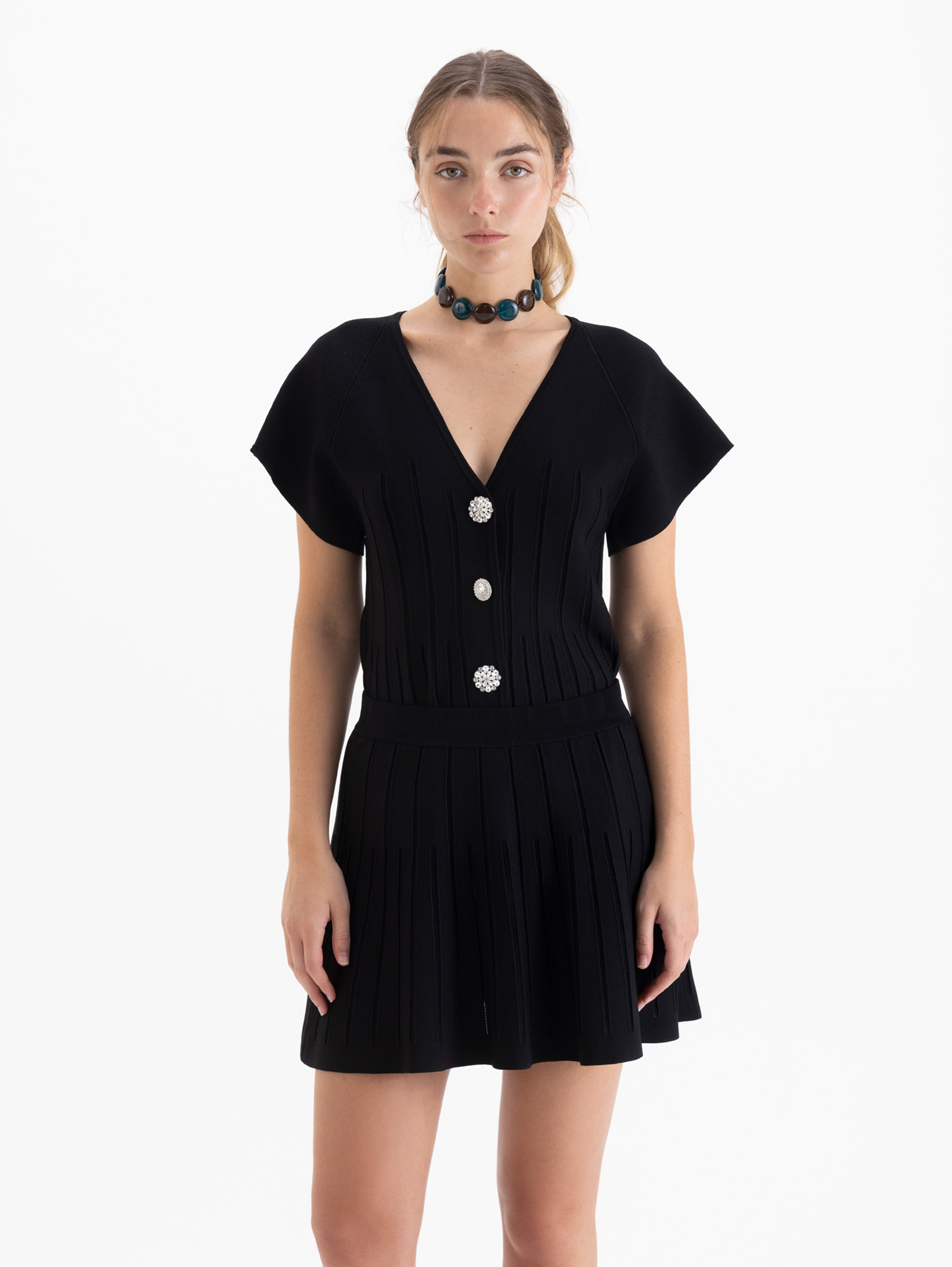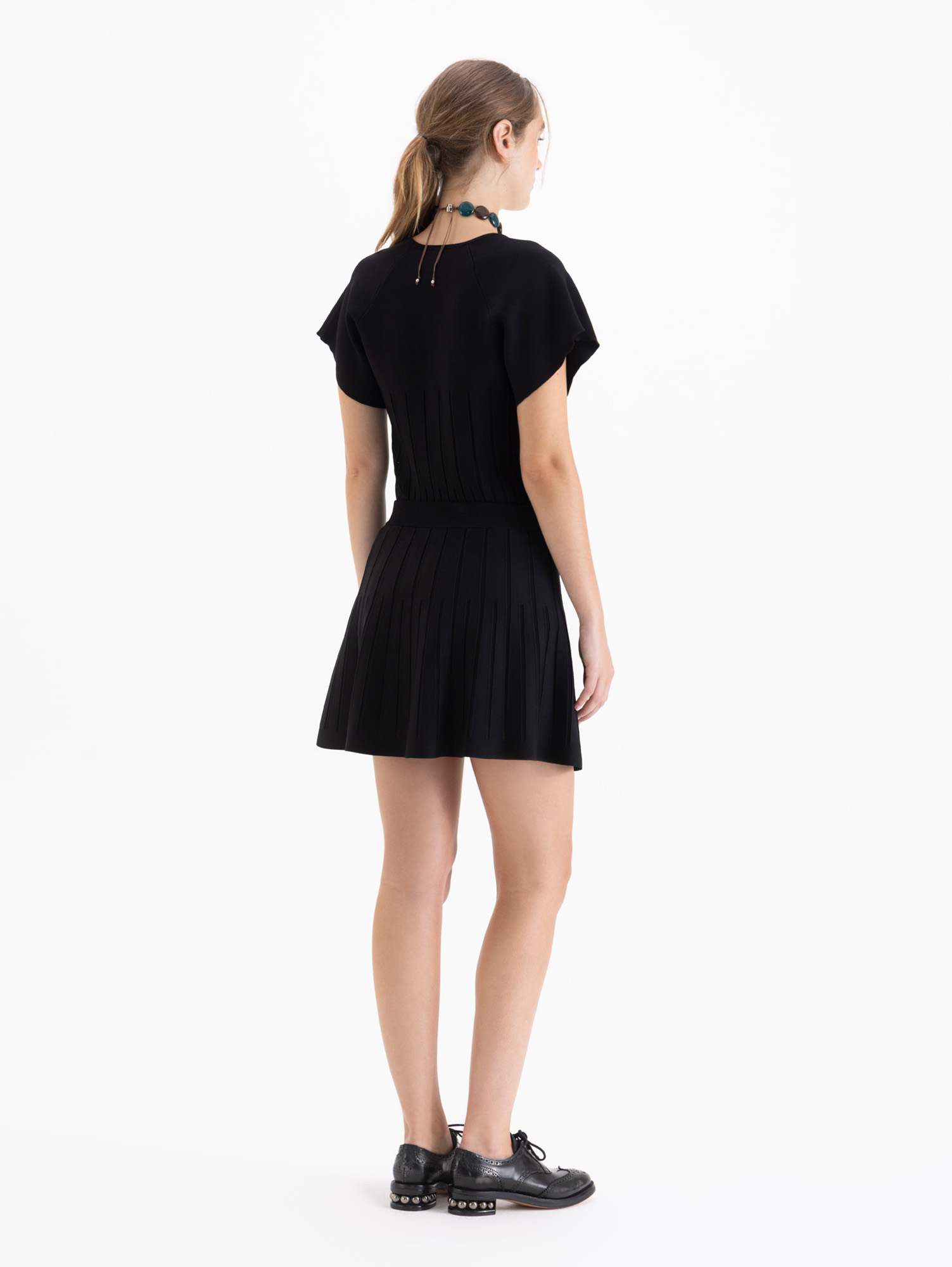 Mini Lines tejida con diseño de líneas en relieve que recorren la prenda verticalmente, estilizando la silueta. De calce recto y estructura firme.