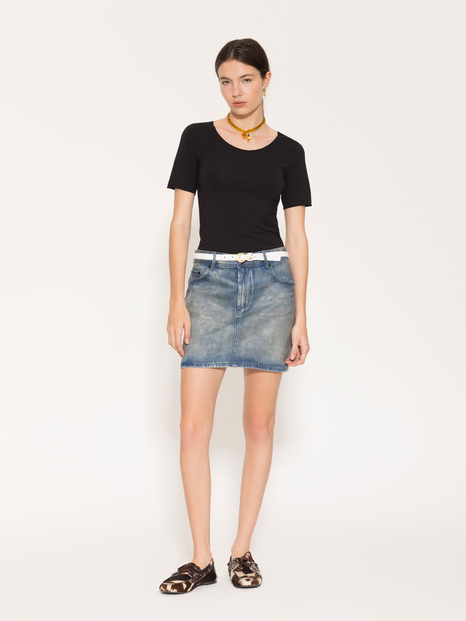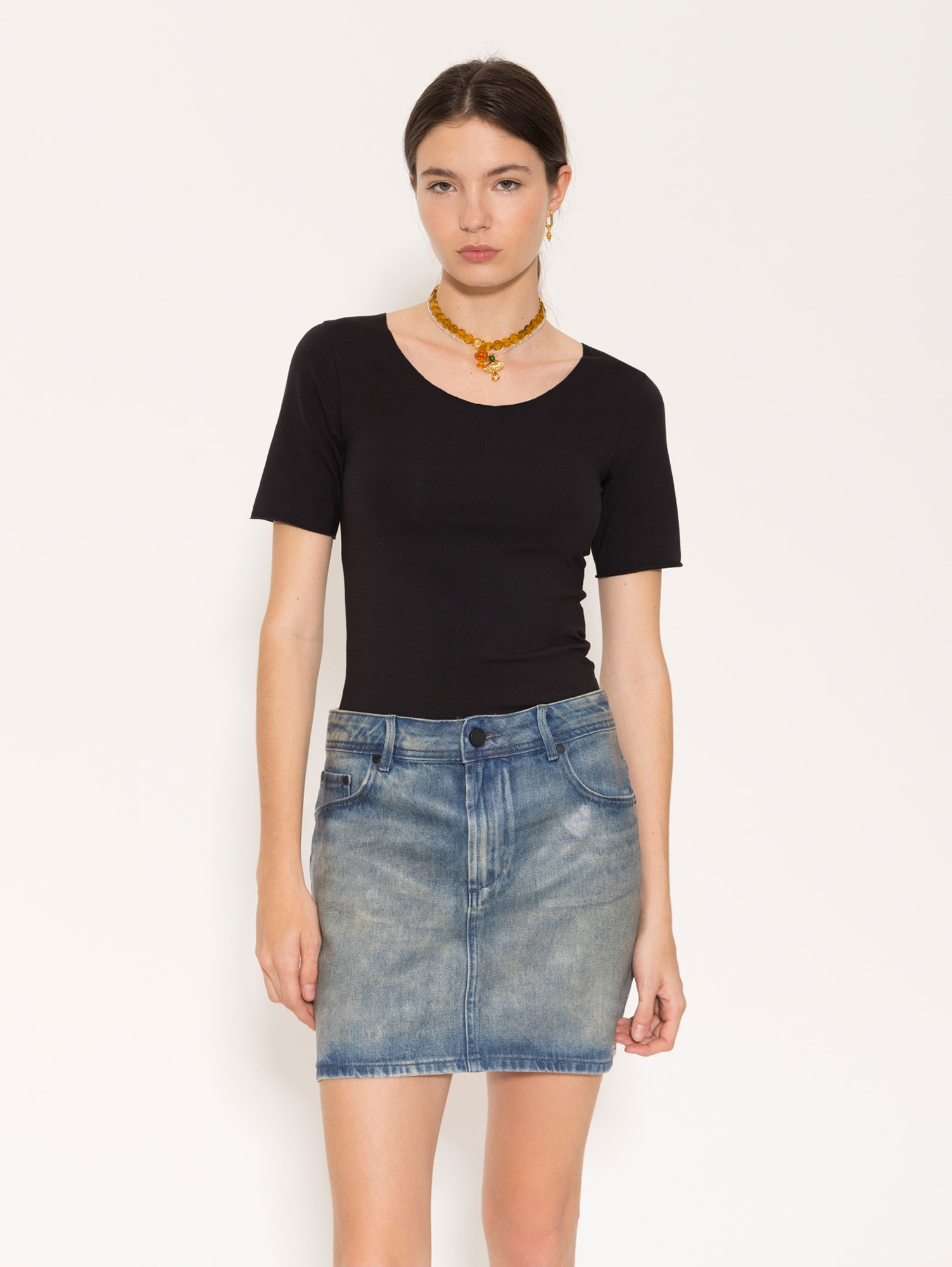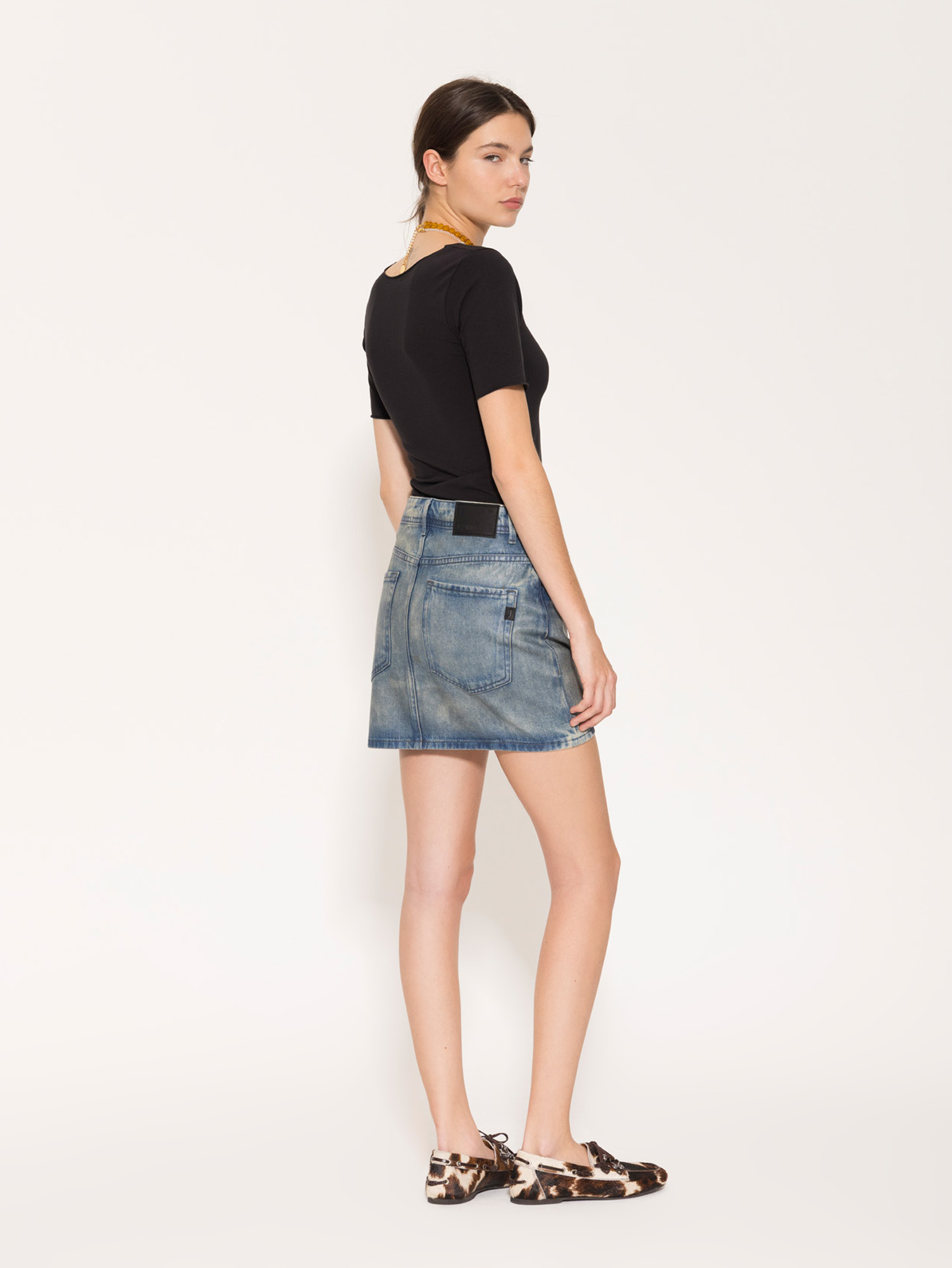 Mini Magic de denim con un exclusivo lavado irregular que incluye localizados y desgastes estratégicos. Su superficie presenta un coating especial realizado sobre la prenda que genera un acabado simil cuero, otorgándole una textura innovadora y sofisticada. Una prenda distintiva para looks urbanos con personalidad.
