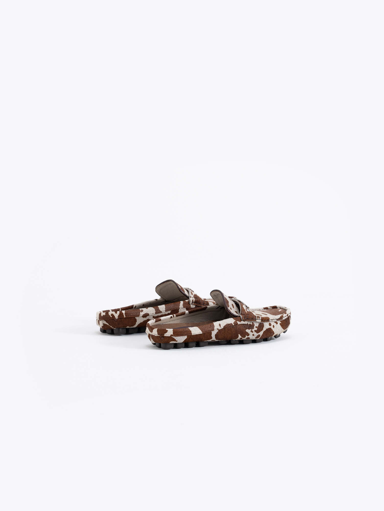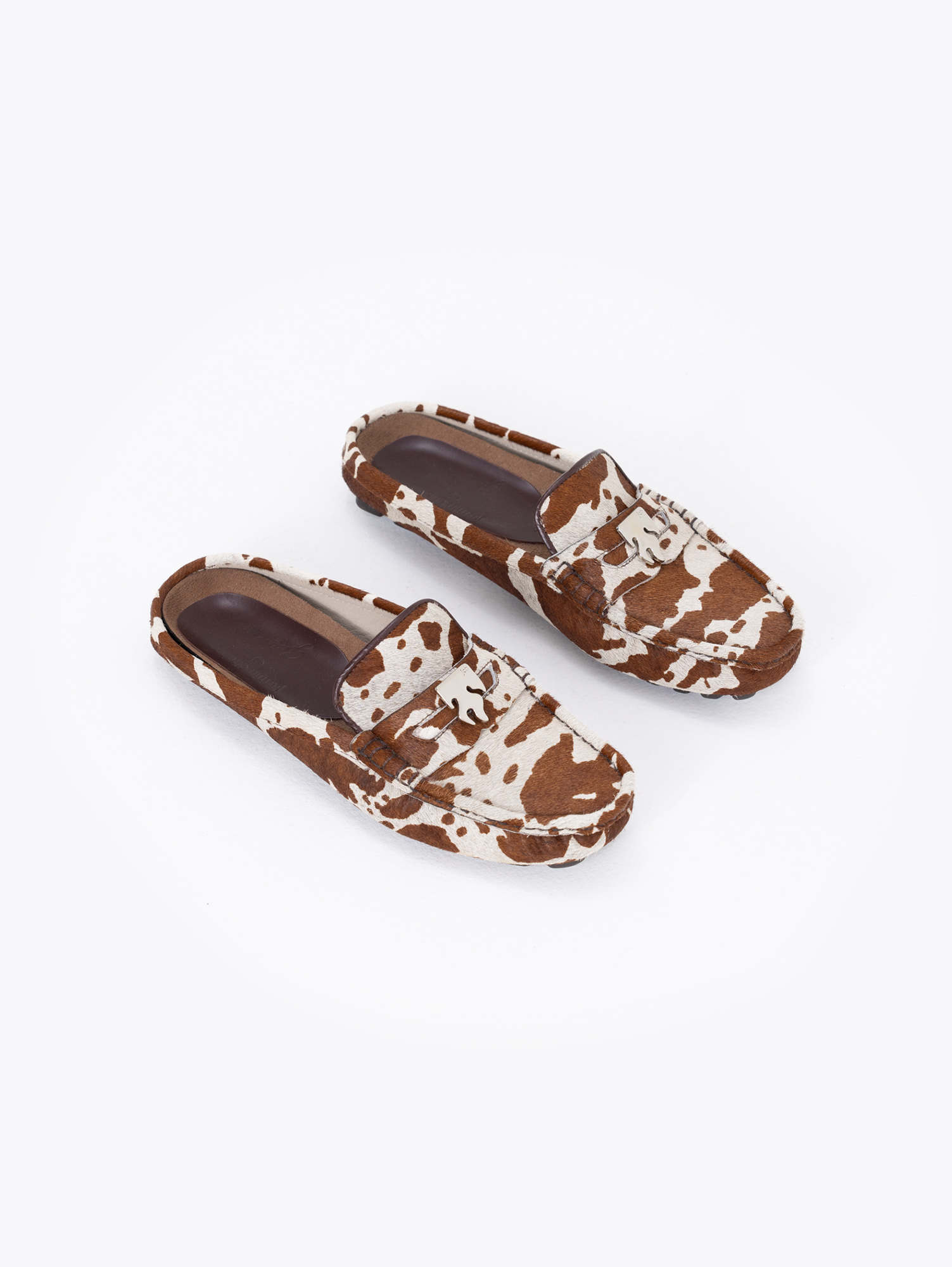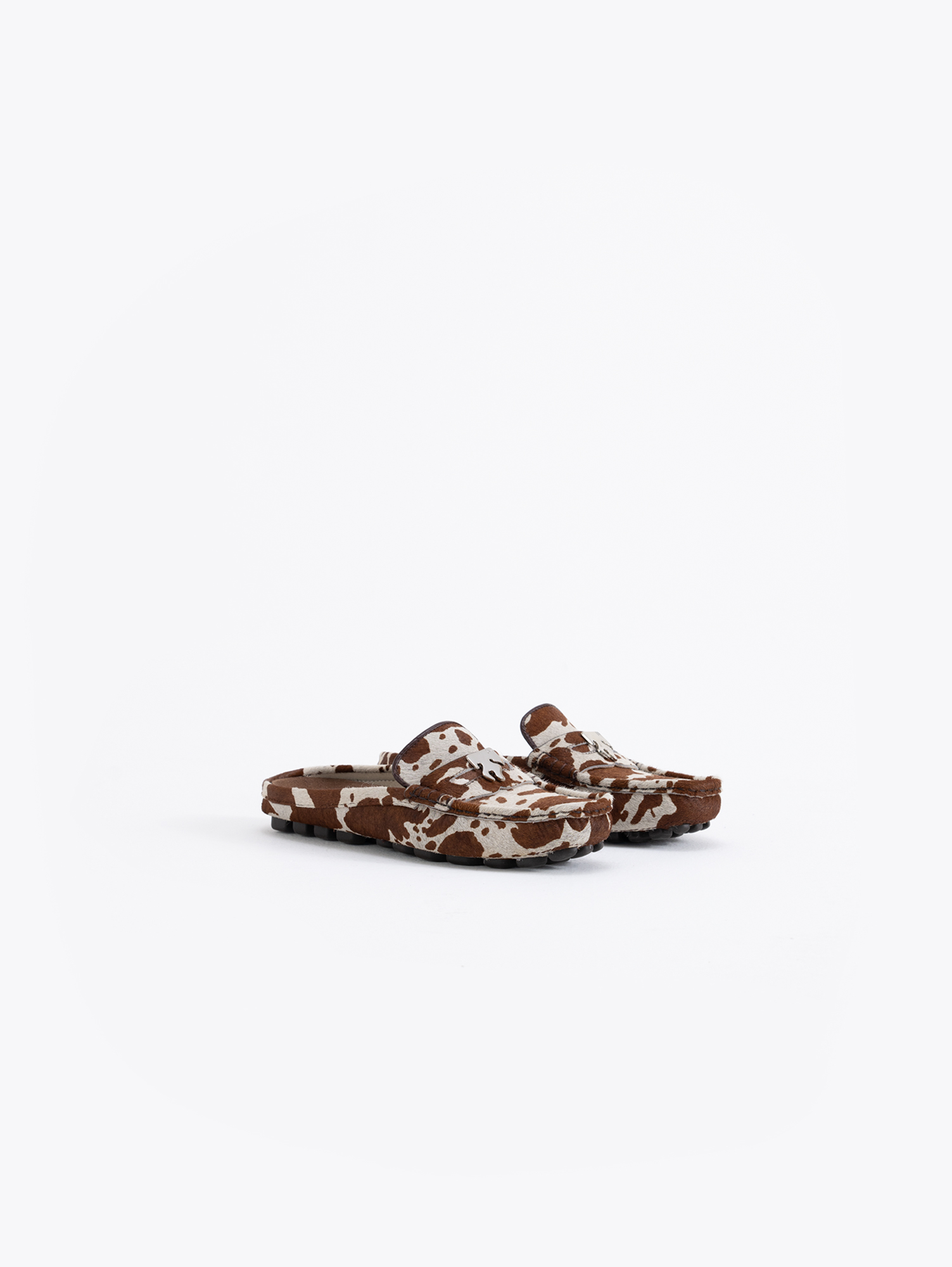 Mocasín Jane confeccionado en pelo vacuno, de diseño destalonado. En la vincha lleva aplique metálico Fire como detalle. Diseño de la colaboración Jazmín Chebar x Guido.