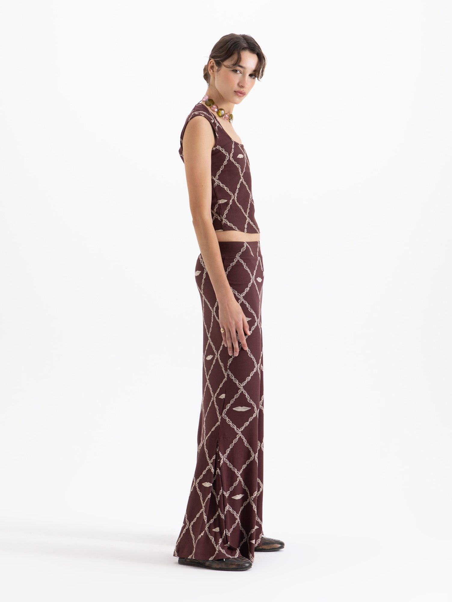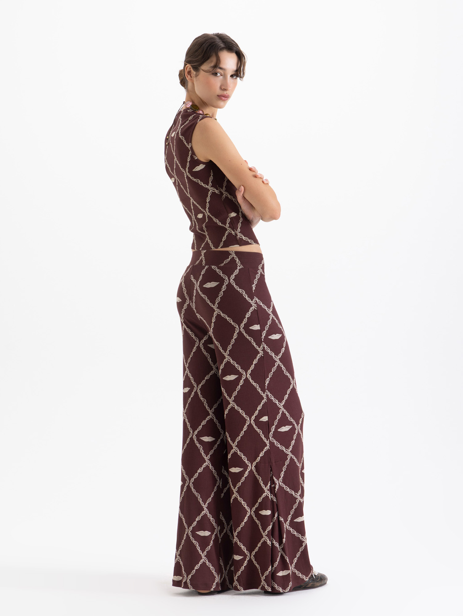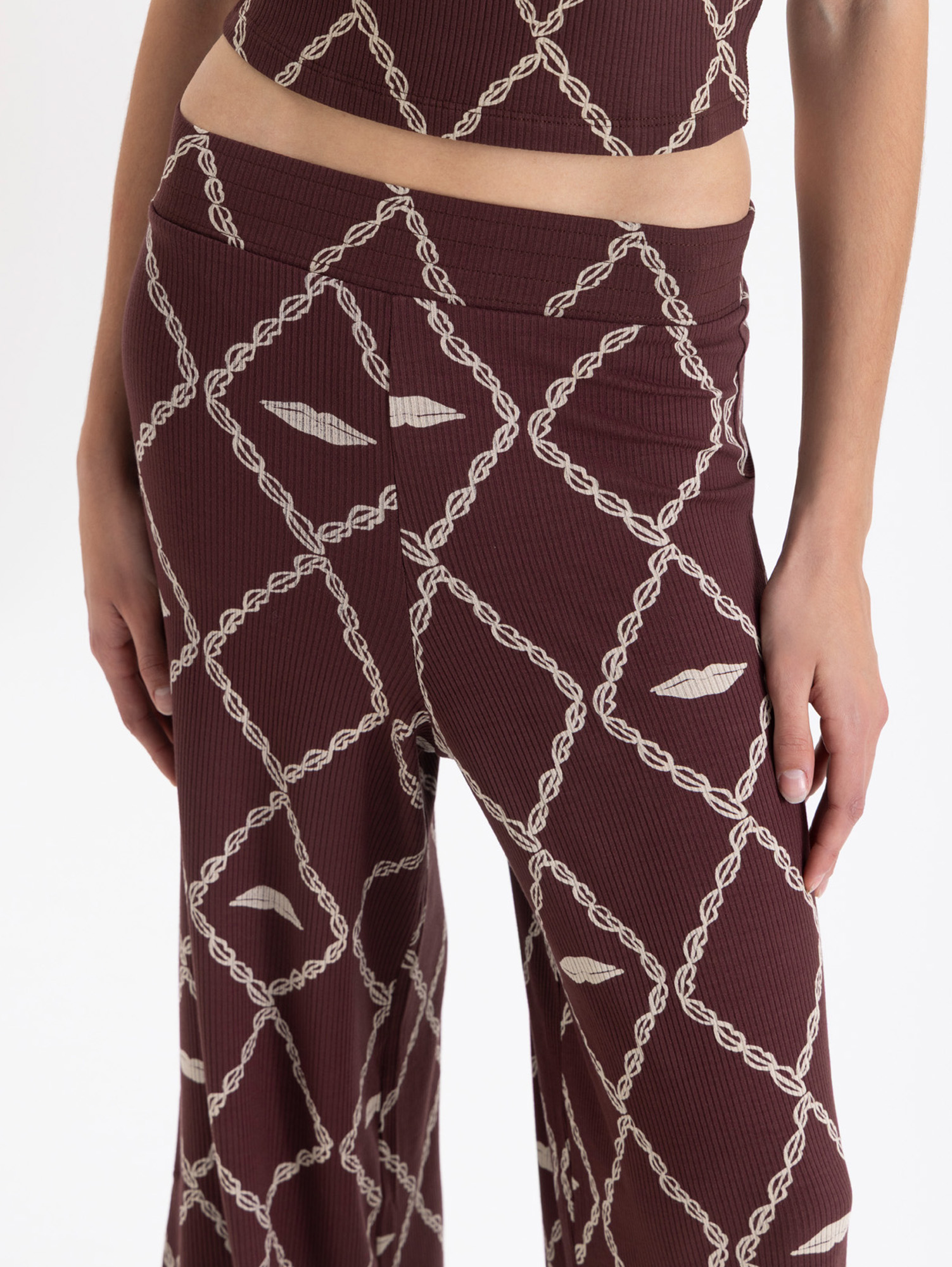 Pantalon Aurora confeccionado en tela de punto con estampado full print, de fit amplio. Lleva cintura elastizada y tabla en bota que aporta mayor amplitud y comodidad al la prenda.