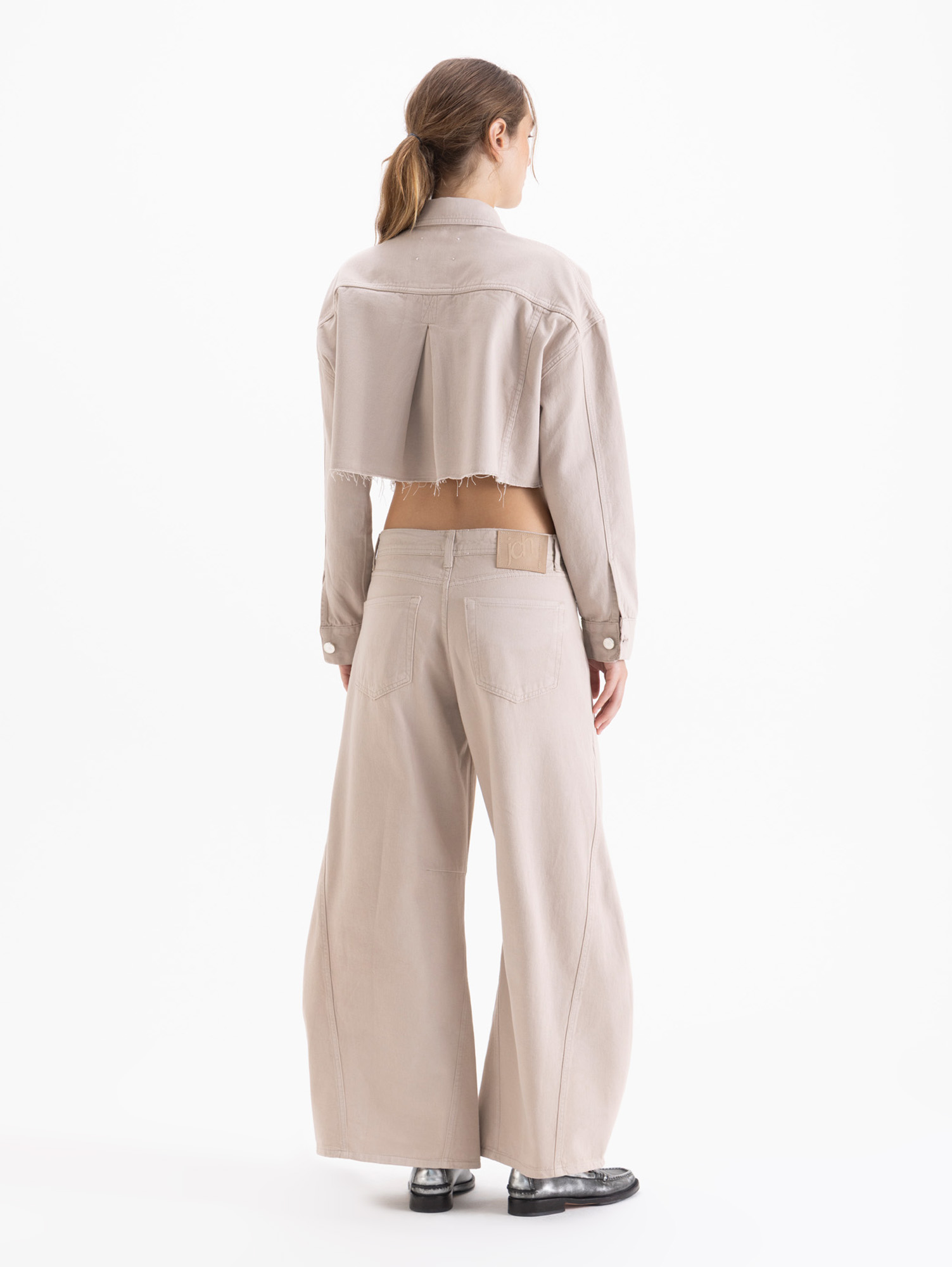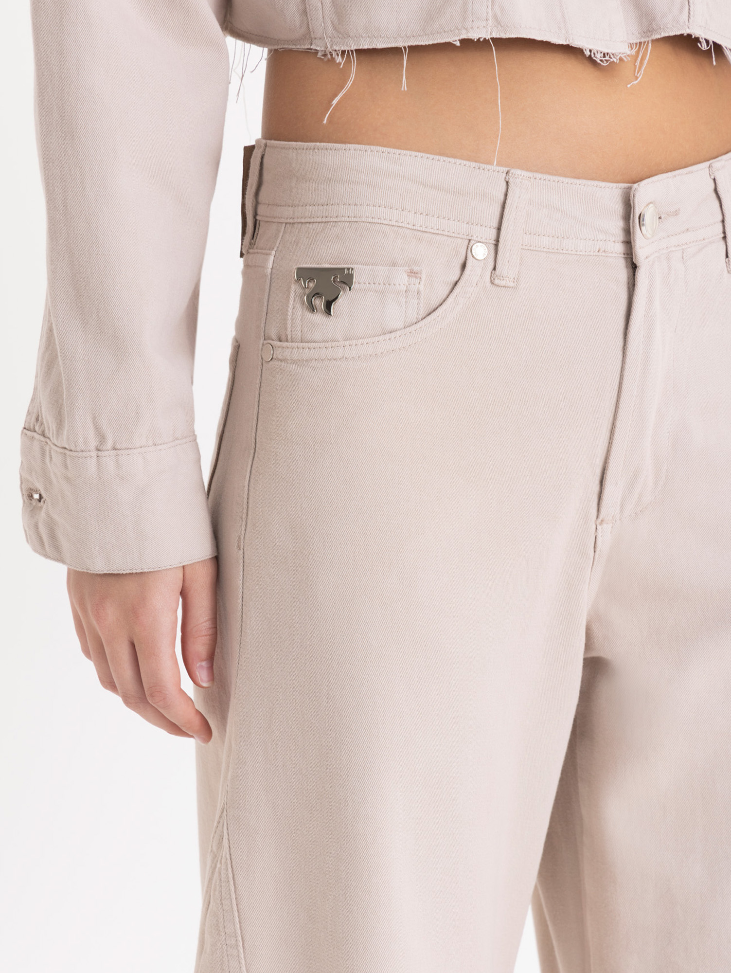 Pantalón Flame de espíritu jeanero con calce wide y forma redondeada. Las pinzas en la zona de rodillas intensifican su silueta envolvente. Lleva metales níquel y remache especial «Fire», ícono distintivo de esta colección.