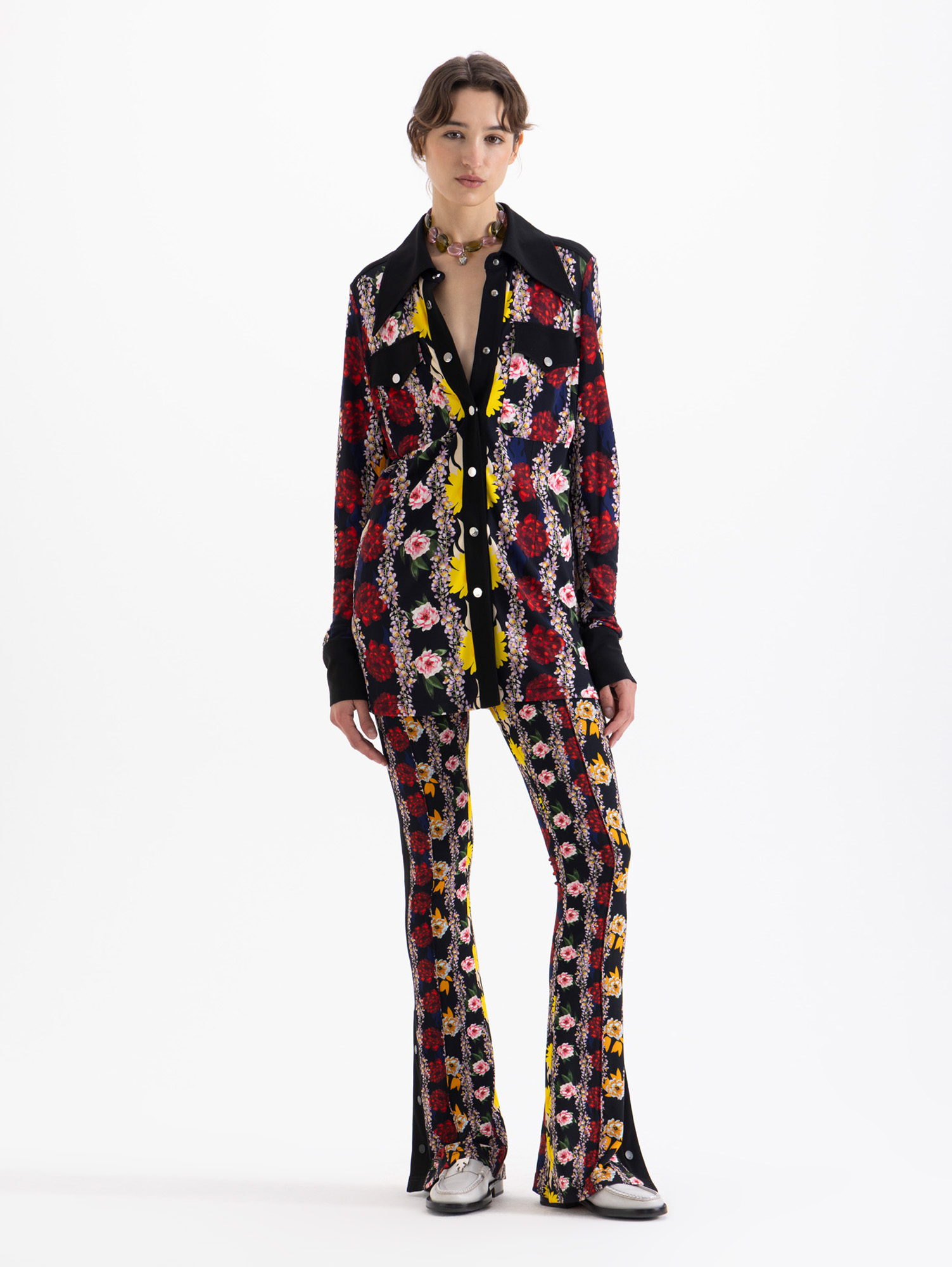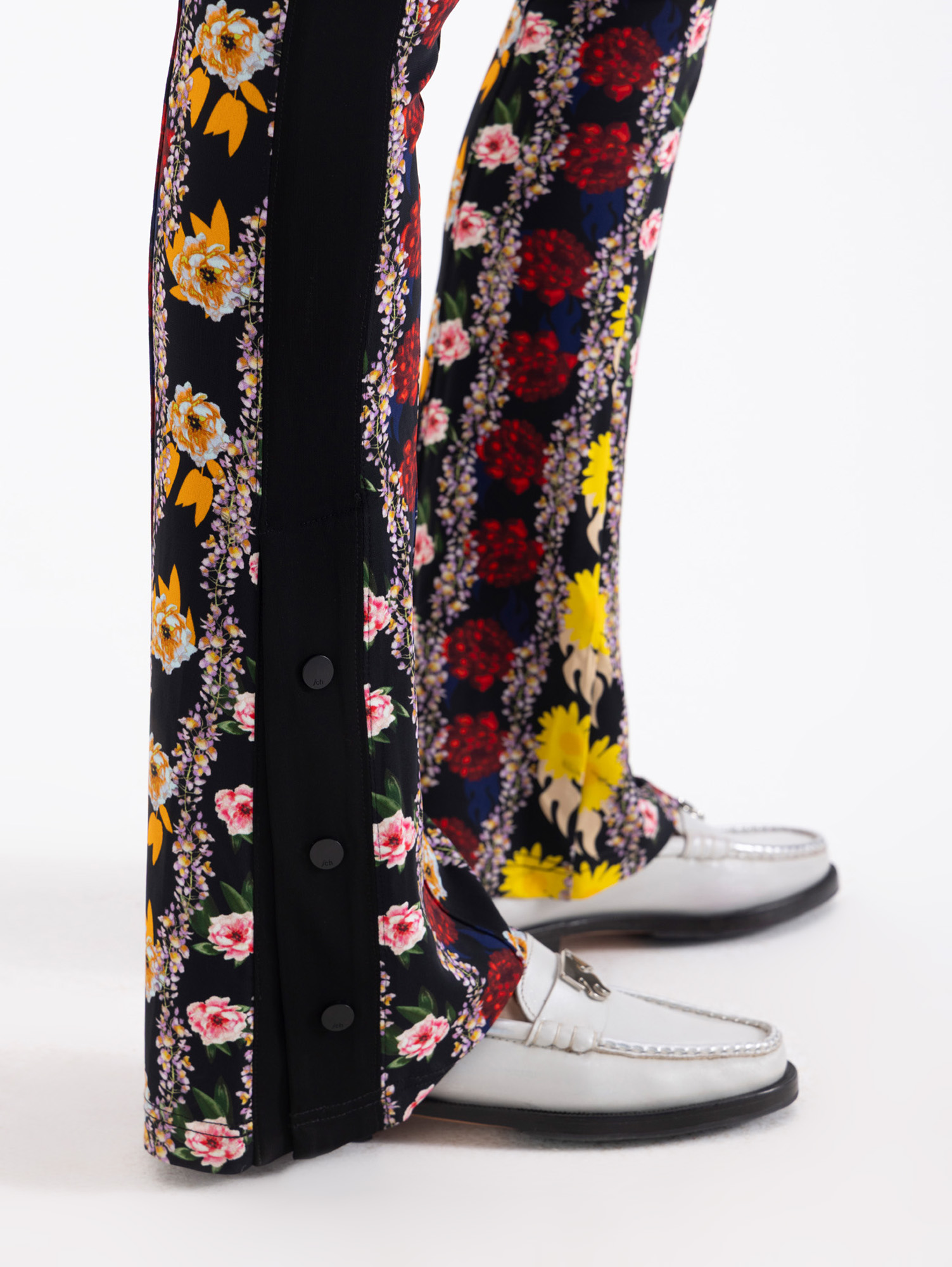 Pantalon Flowers de fit recto, confeccionado en viscosa estampada. Tiene cintura elastizada con elástico embutido. Los laterales están terminados con piezas de tela complemento y broches black niquel con logo de JCH grabado en botamanga.