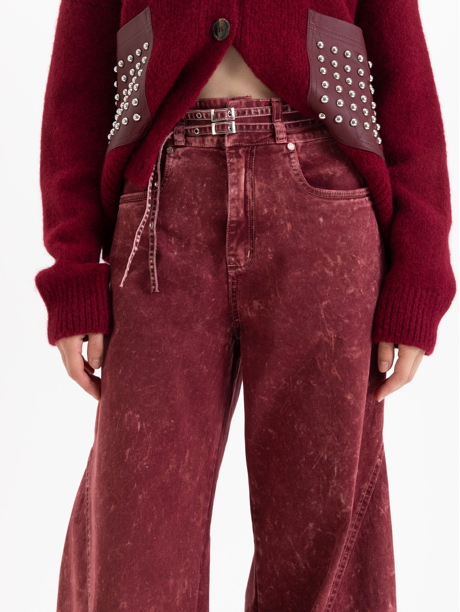 Pantalón Gigi de fit wide leg y tiro medio, confeccionado en denim con lavado efecto gastado. Lleva un cinturón del mismo tejido con doble hebilla metálica que permite ajustar la cintura.
