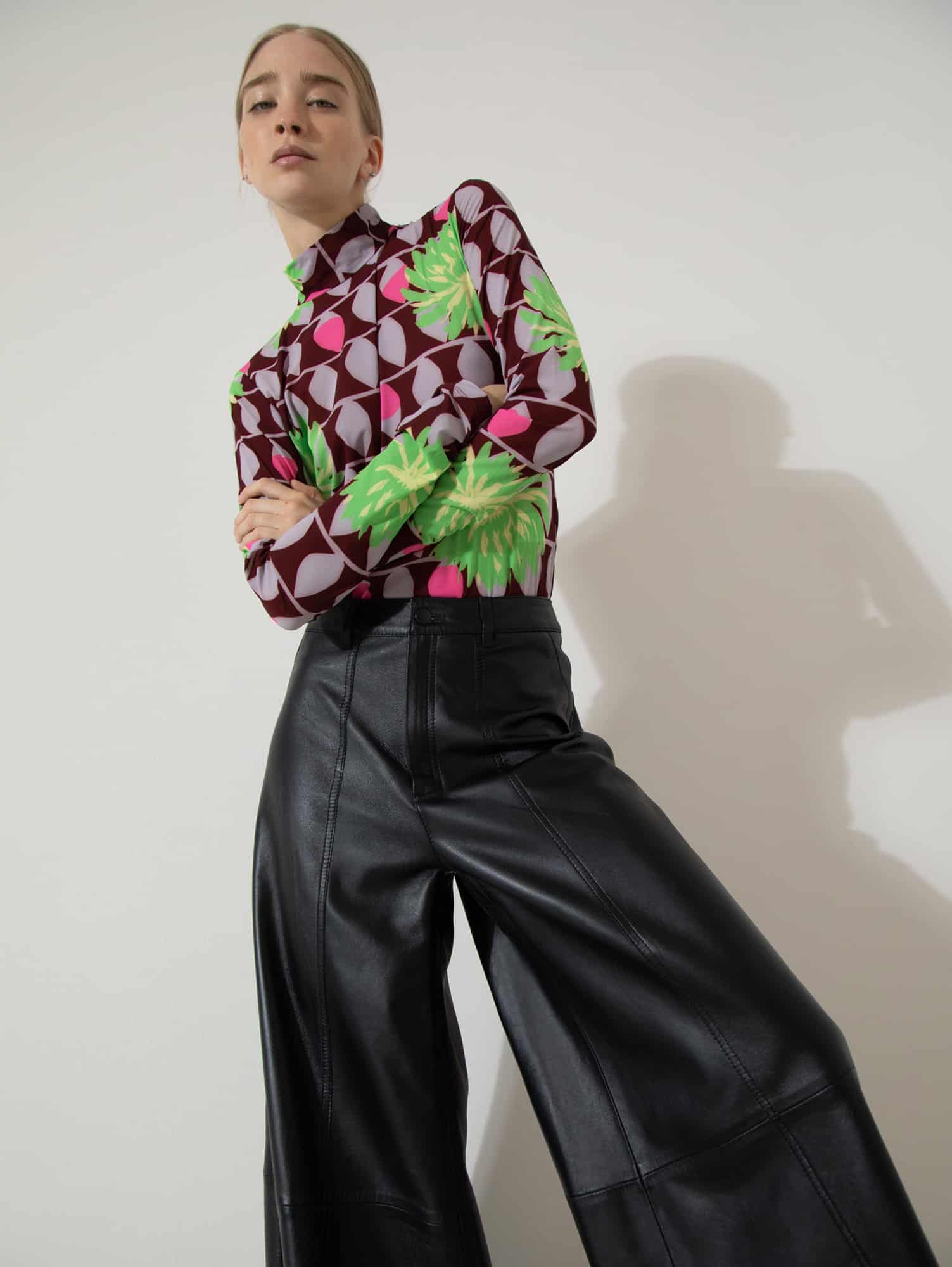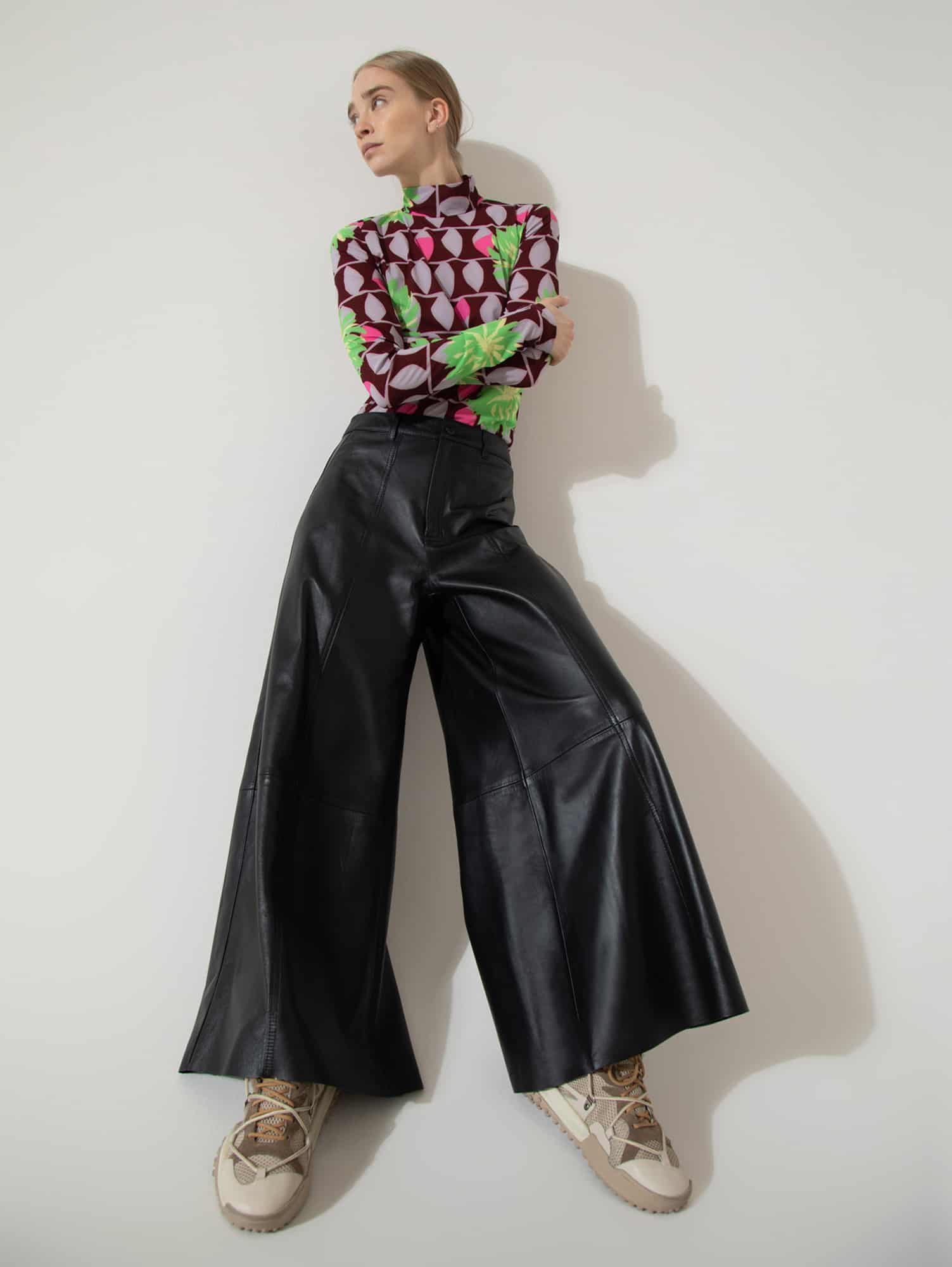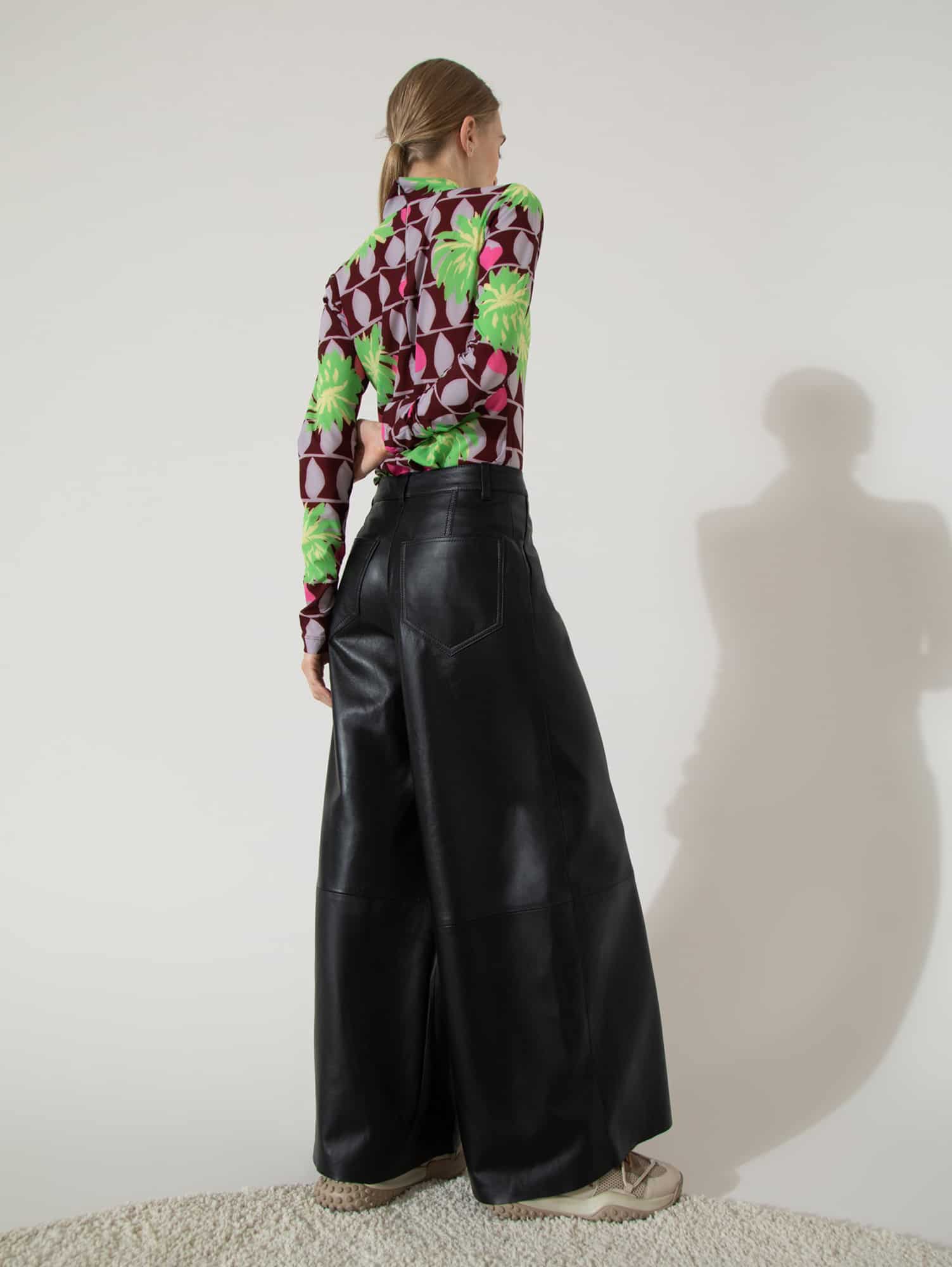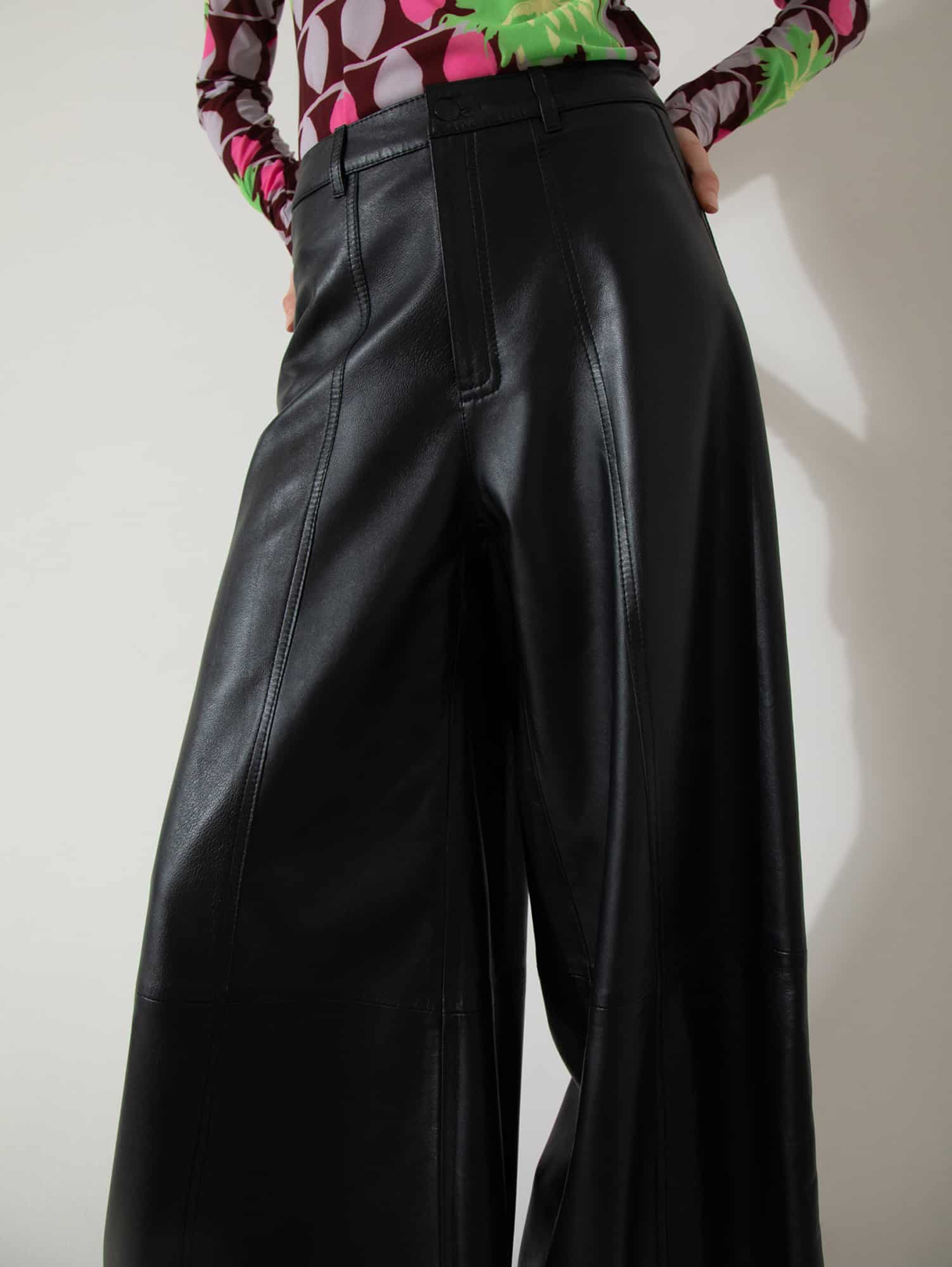 Pantalón confeccionado 100% en cuero ovino. Fit ancho y largo cropped, con recorte central y pespuntes en ambas piernas. Acceso mediante cierre y botón metálico. Posee bolsillos jeaneros en espalda.