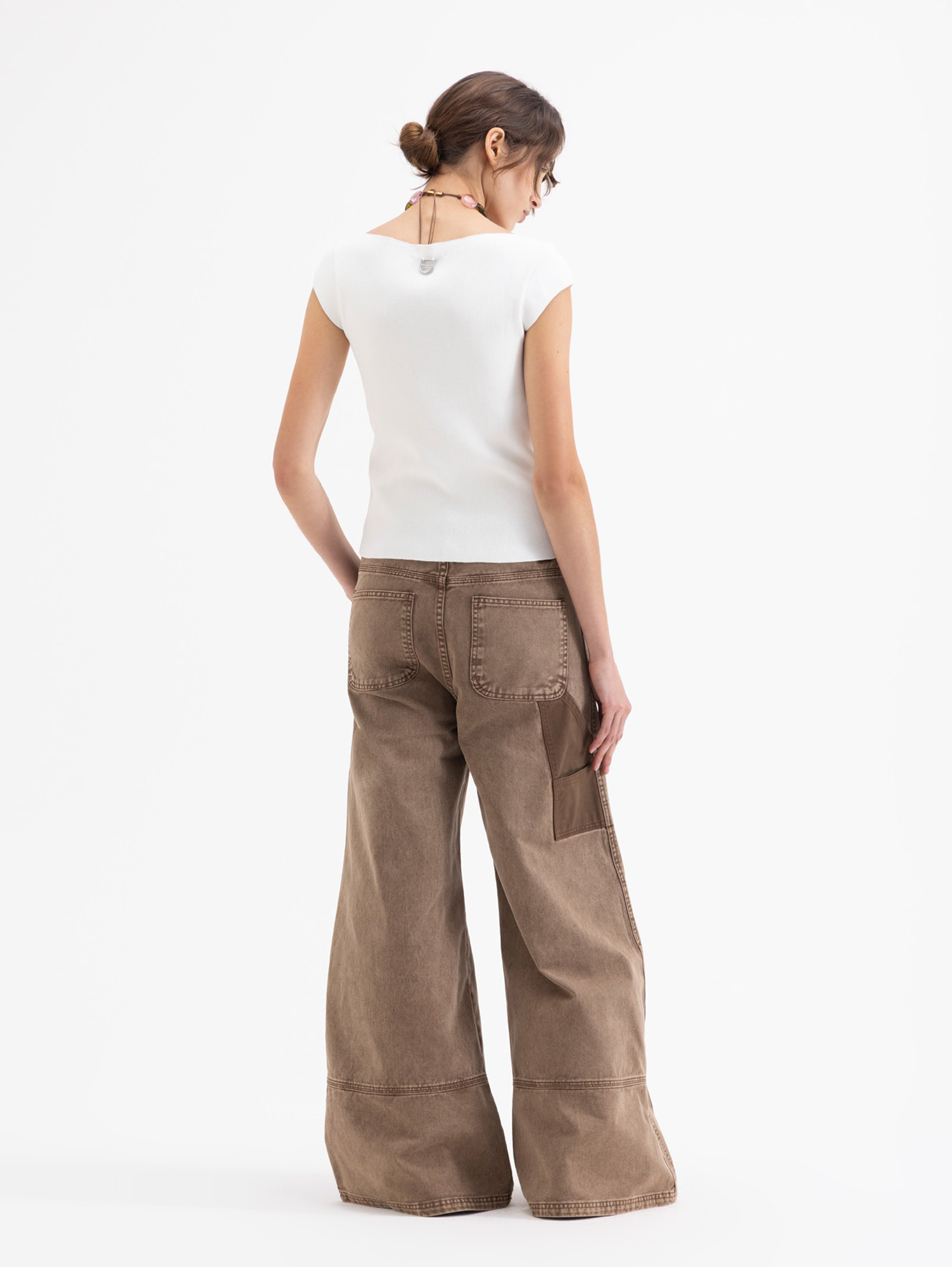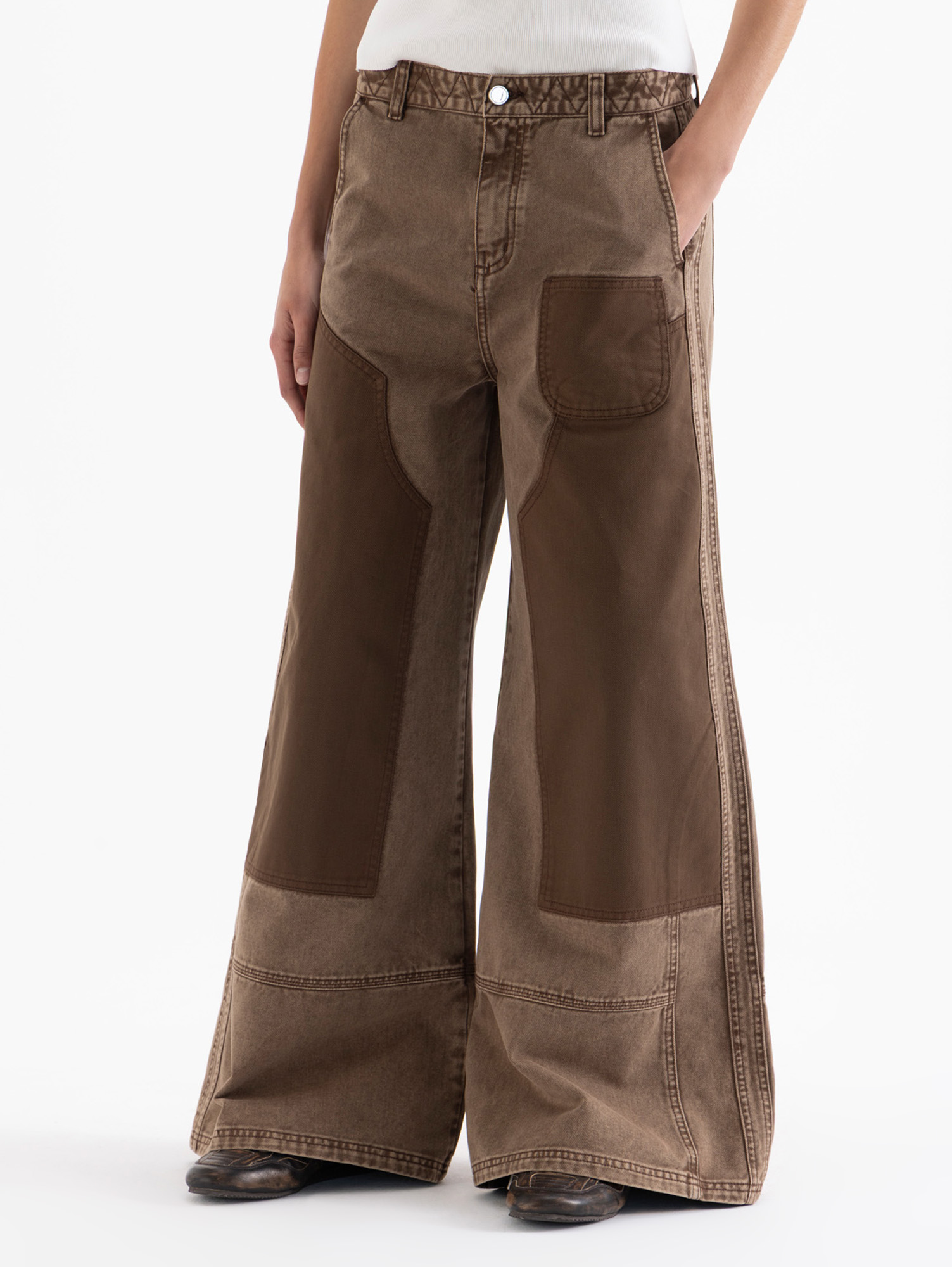 Pantalon Park City wide con parches carpinteros que presentan reservas en el lavado, generando diferencia de tonos. Lleva bolsillos diagonales en el frente y bolsillos plaque redondeados en la espalda.