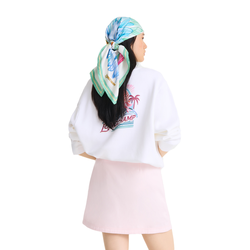 Este estampado presenta tablas de surf Longchamp decoradas con el icónico logo del surfista en la parte posterior. Las tablas presentan un degradado de rojo a azul, con toques de amarillo y verde, capturando a la perfección la energía vibrante y el brillo del verano.