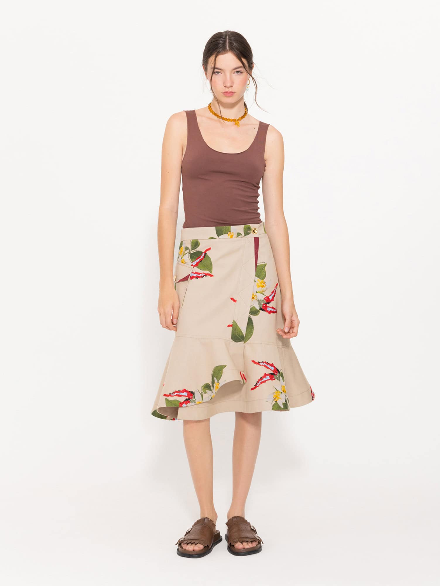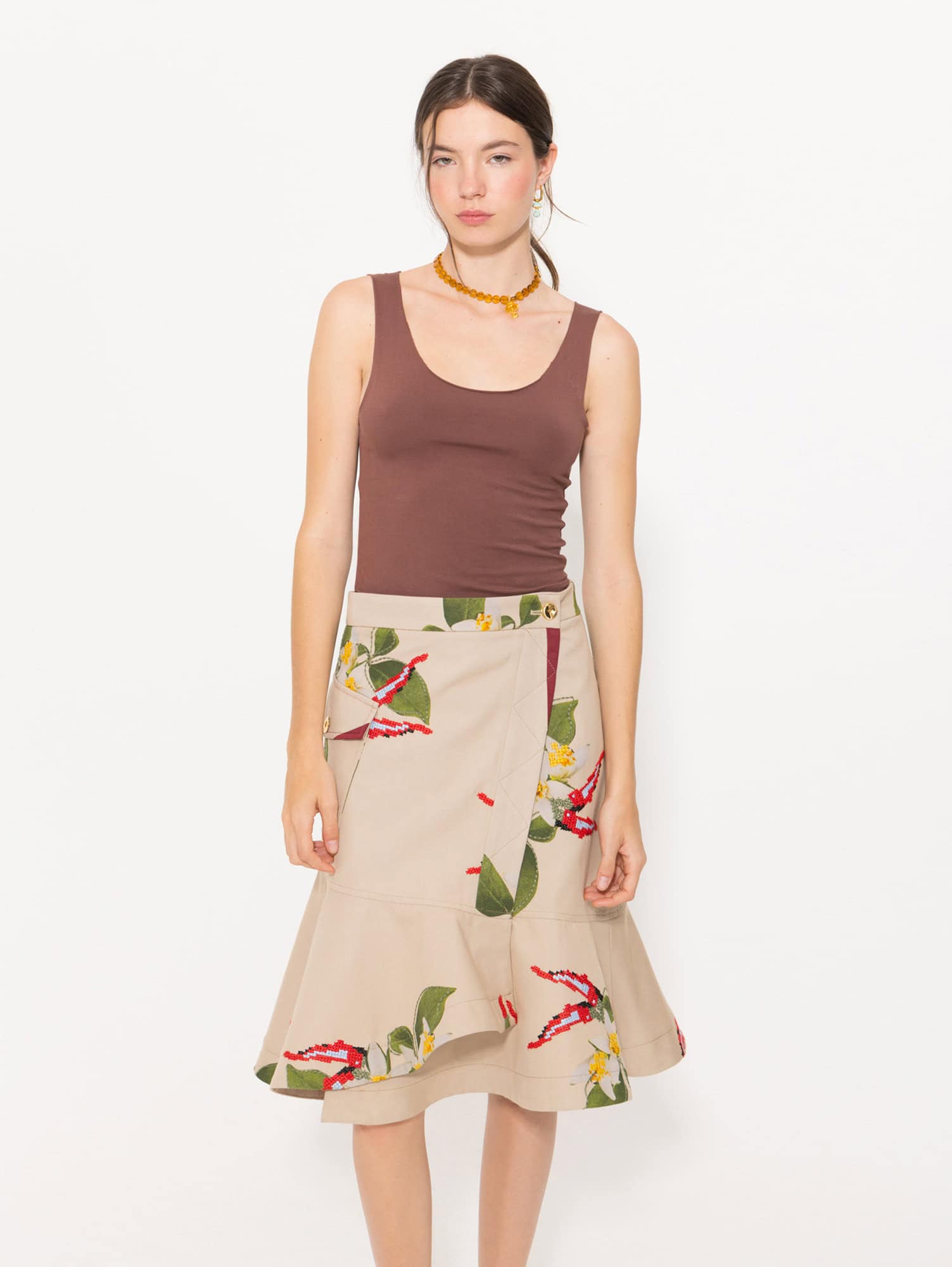 Pollera Bouquet confeccionada en gabardina estampada con bordados, largo midi. Lleva un cruce diagonal con botón waves de oro personalizado y botón interno para sostener solapa inferior. Incluye bolsillo plaqué en delantero orientado a cintura y volado en forma de caracol en ruedo.