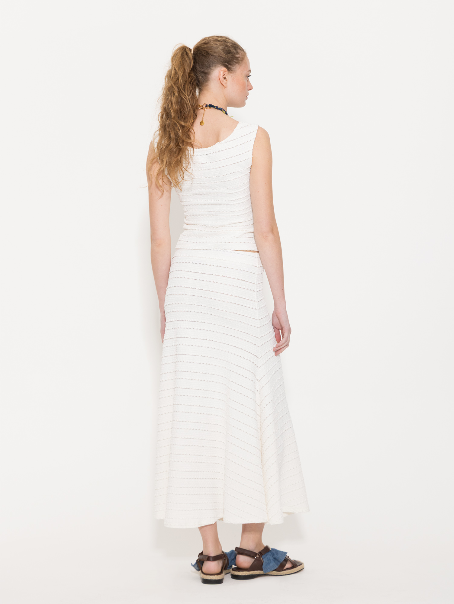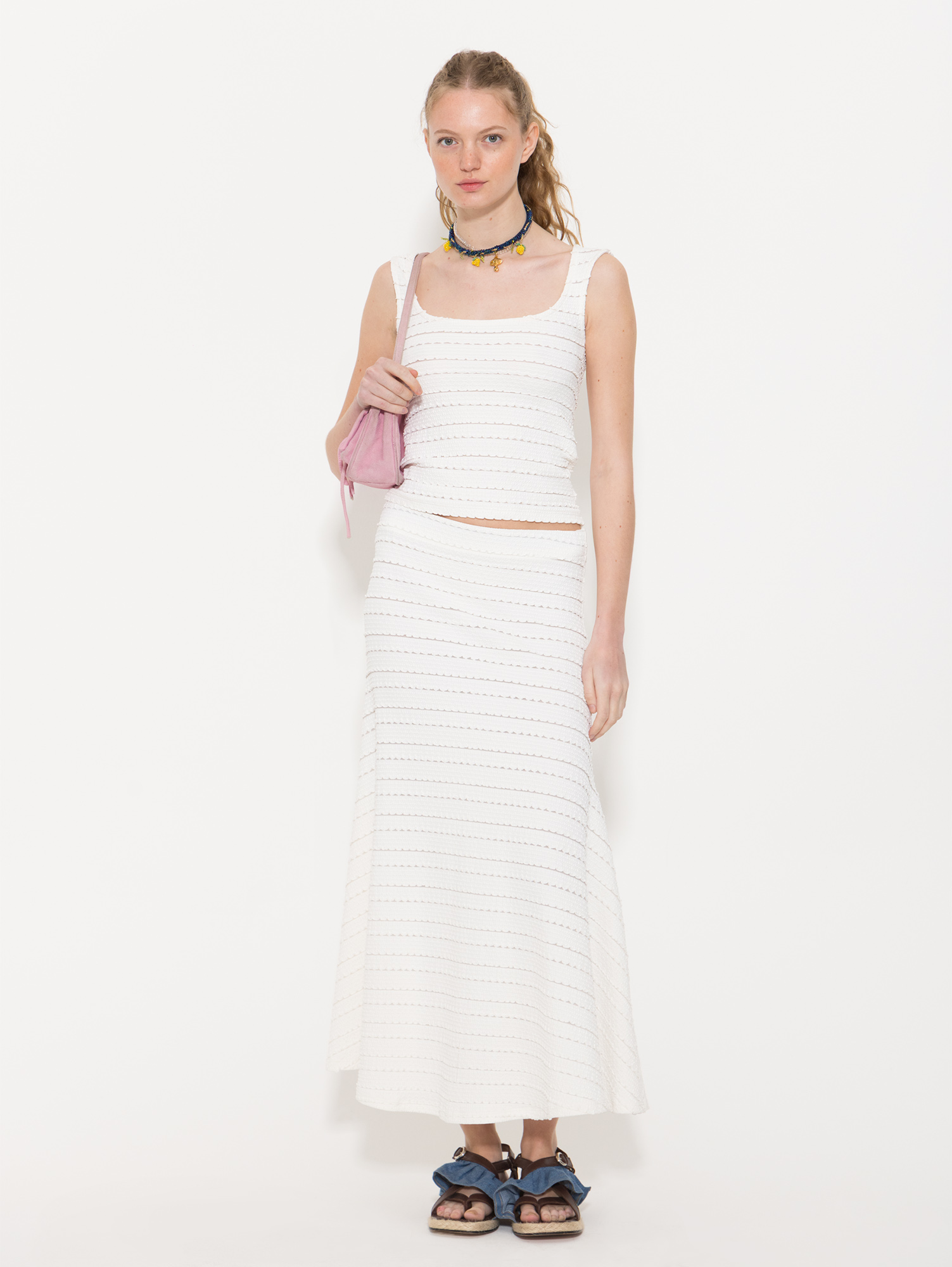 Pollera Daphne confeccionada en tela de punto fantasía con textura. Lleva cintura elastizada para mayor comodidad y vuelo en el bajo.
