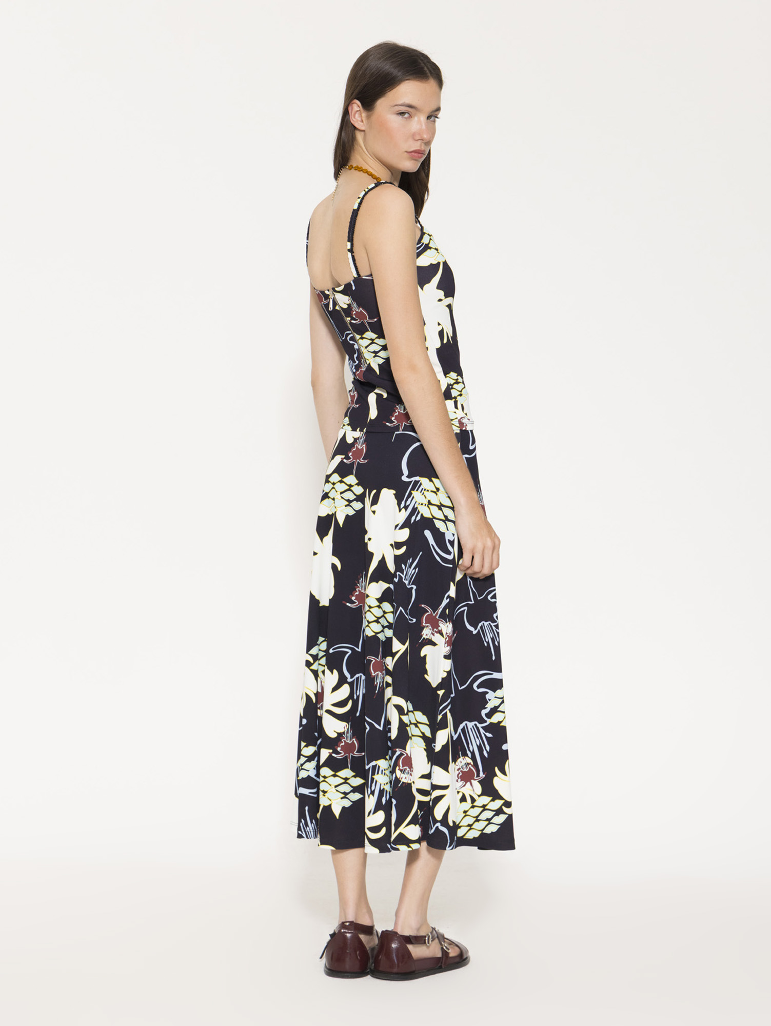 Pollera Delfi de silueta amplia, larga a los tobillos confeccionada en tela estampada liviana. Lleva elástico embutido en la cintura para ajustar y forrería interna.