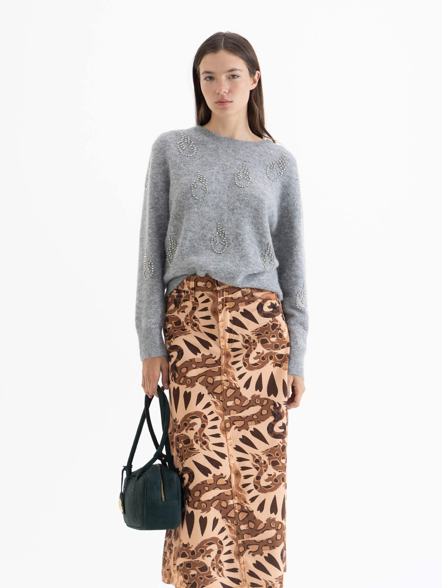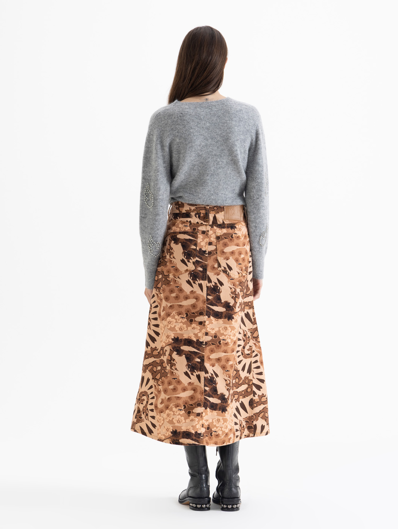Pollera Dragones midi, amplia confeccionada en gabardina con estampado de dragones, exclusivo de esta etapa de la colección. Lleva cinco bolsillos clásicos de inspiración jeanera. Incluye bragueta con cierre y broche soft touch al tono en la cintura.