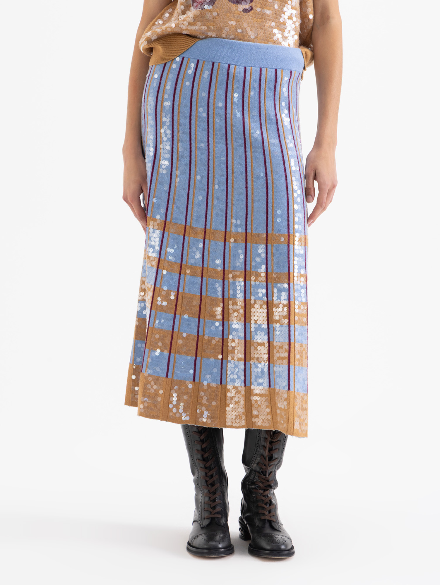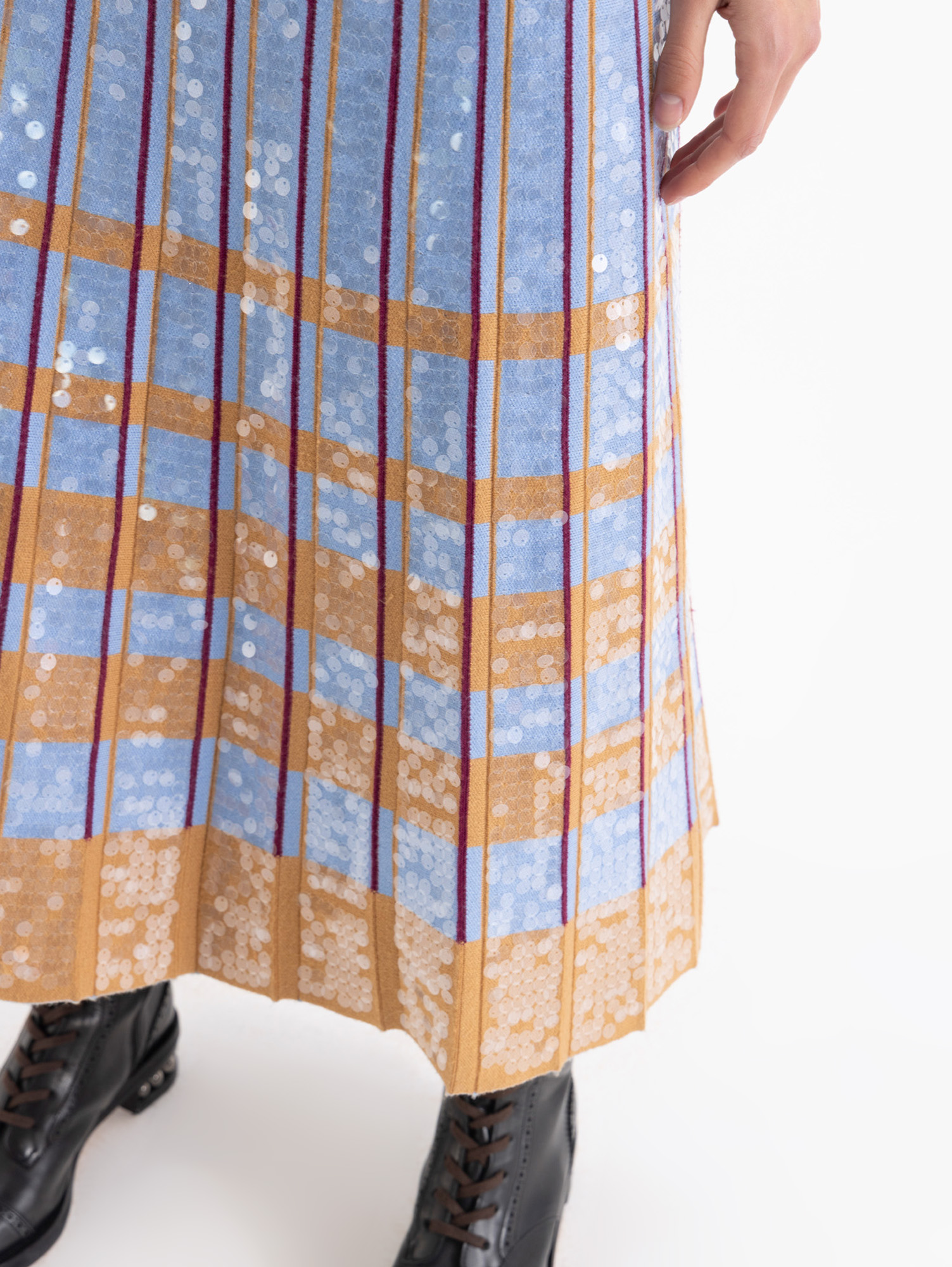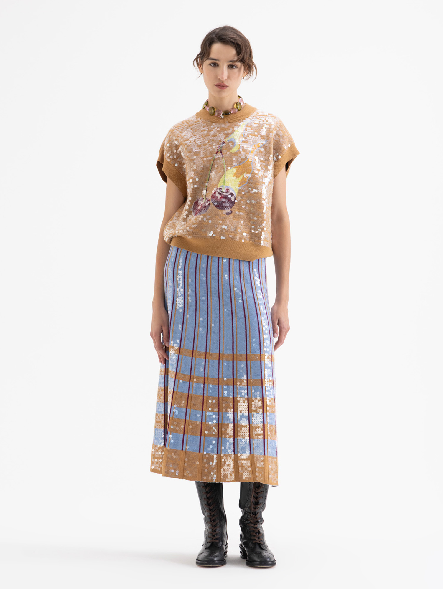 Pollera Flaming Cherry larga por arriba de tobillos, confeccionada en tejido símil tablas. Esta full bordada con lentejuelas.