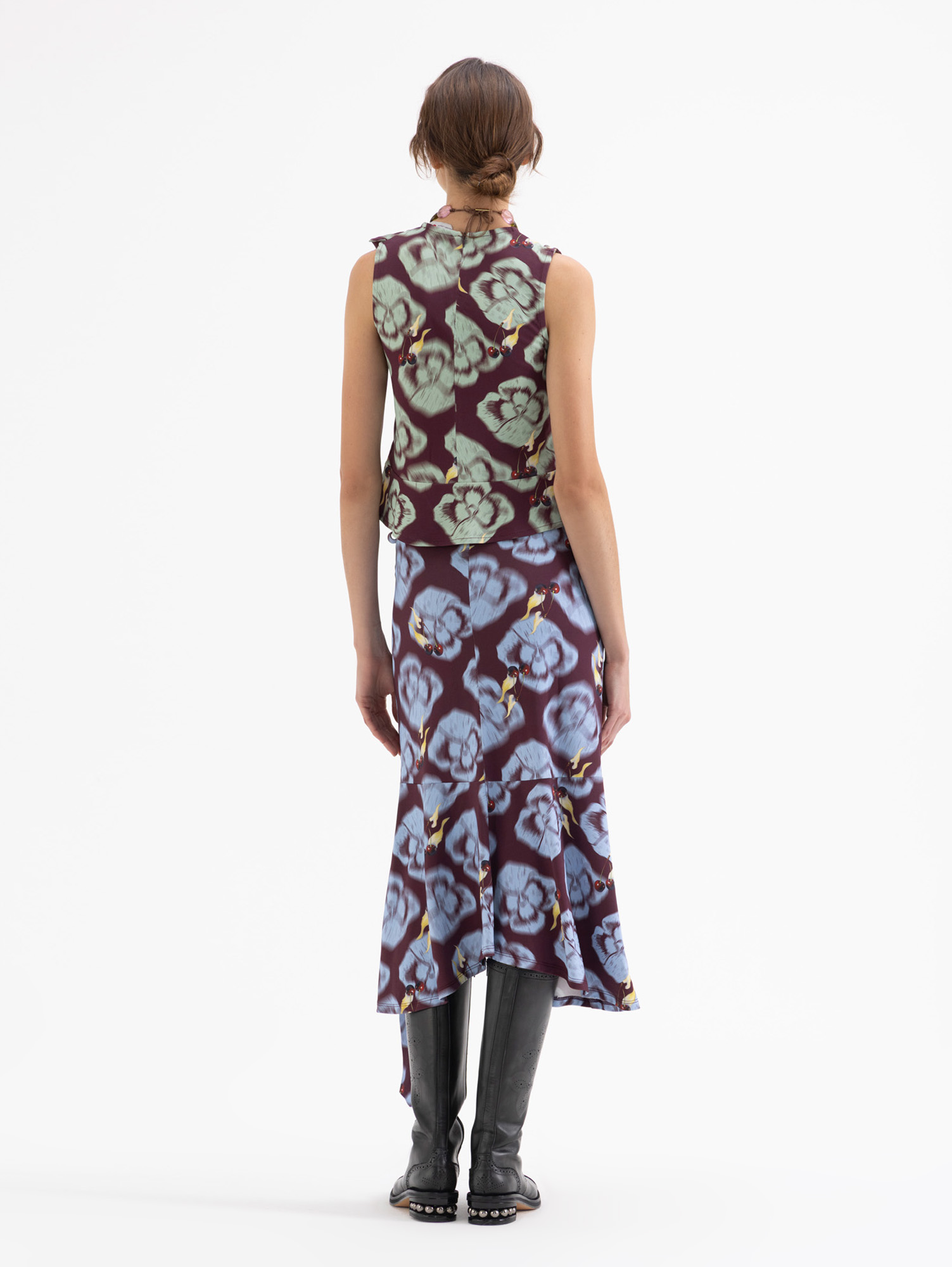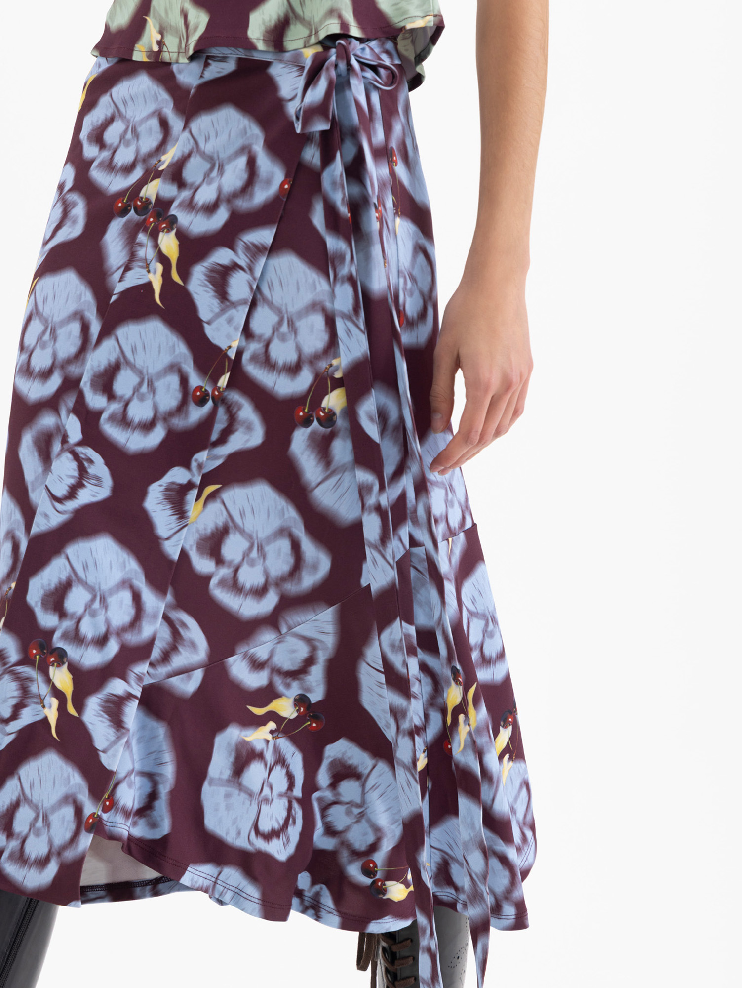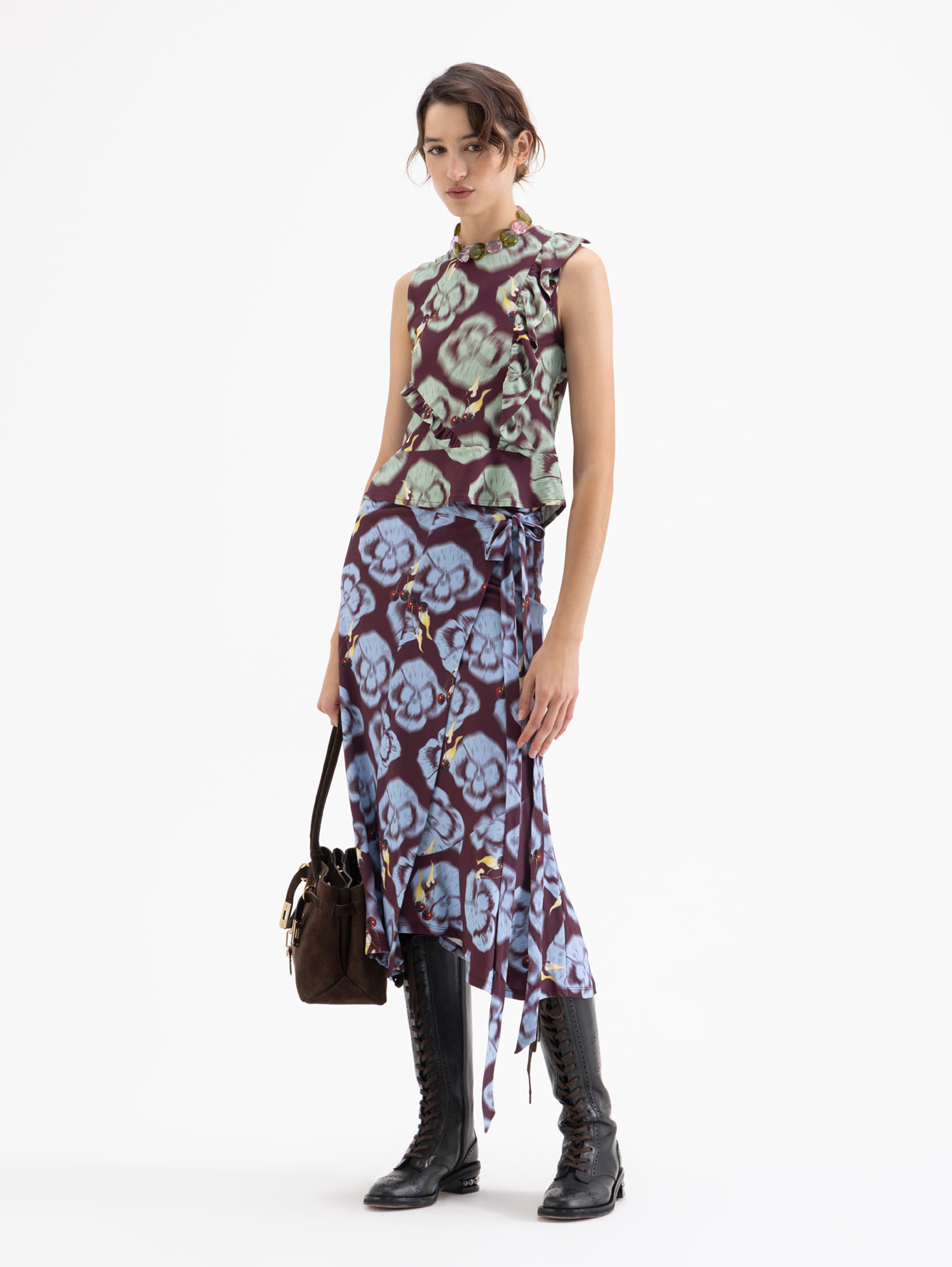 Pollera Flowers tipo portafolio confeccionada en tela de punto estampada. Lleva volados en el bajo que aportan más volumen al la prenda. Se ajusta en cintura mediante lazo.