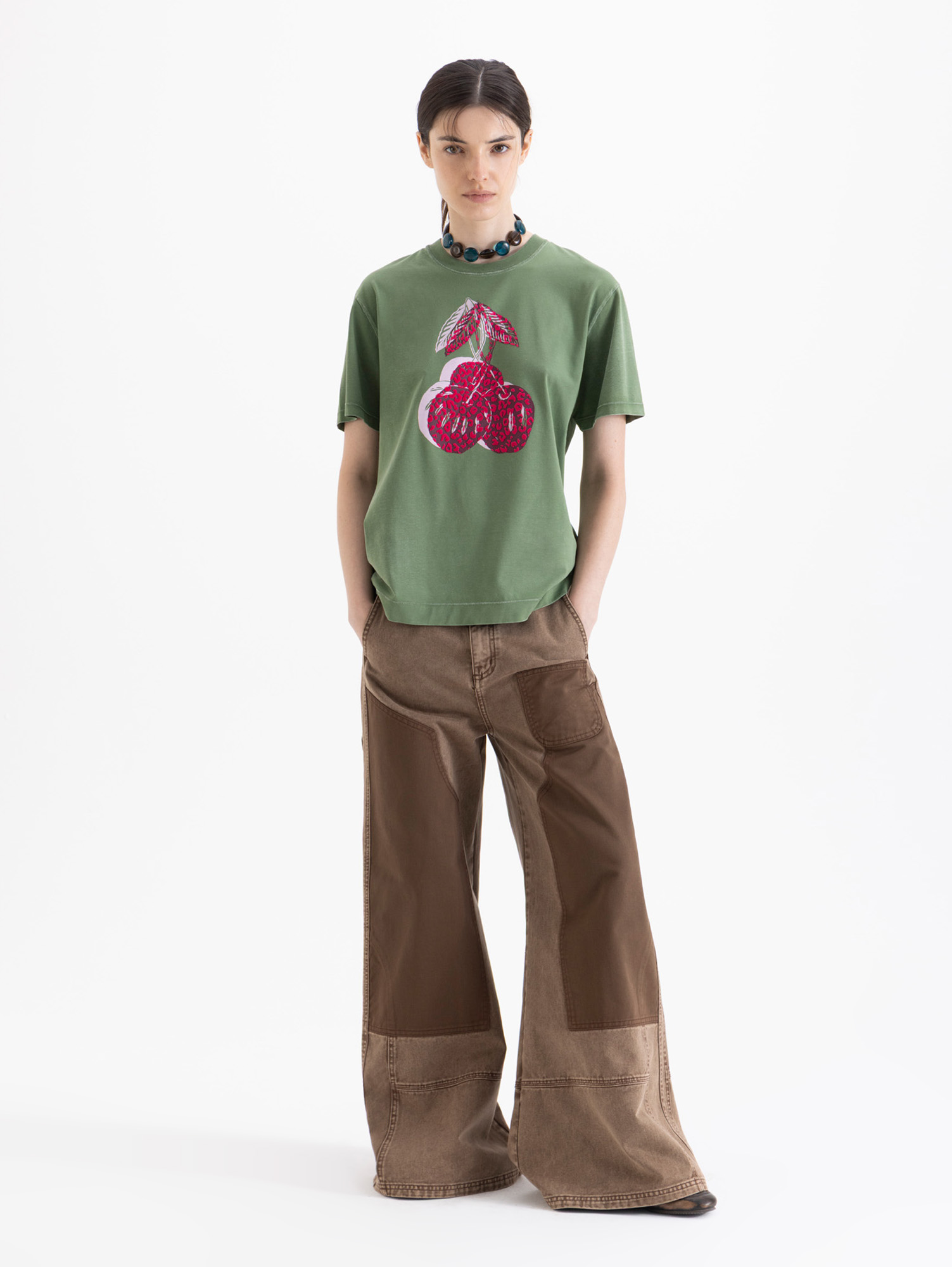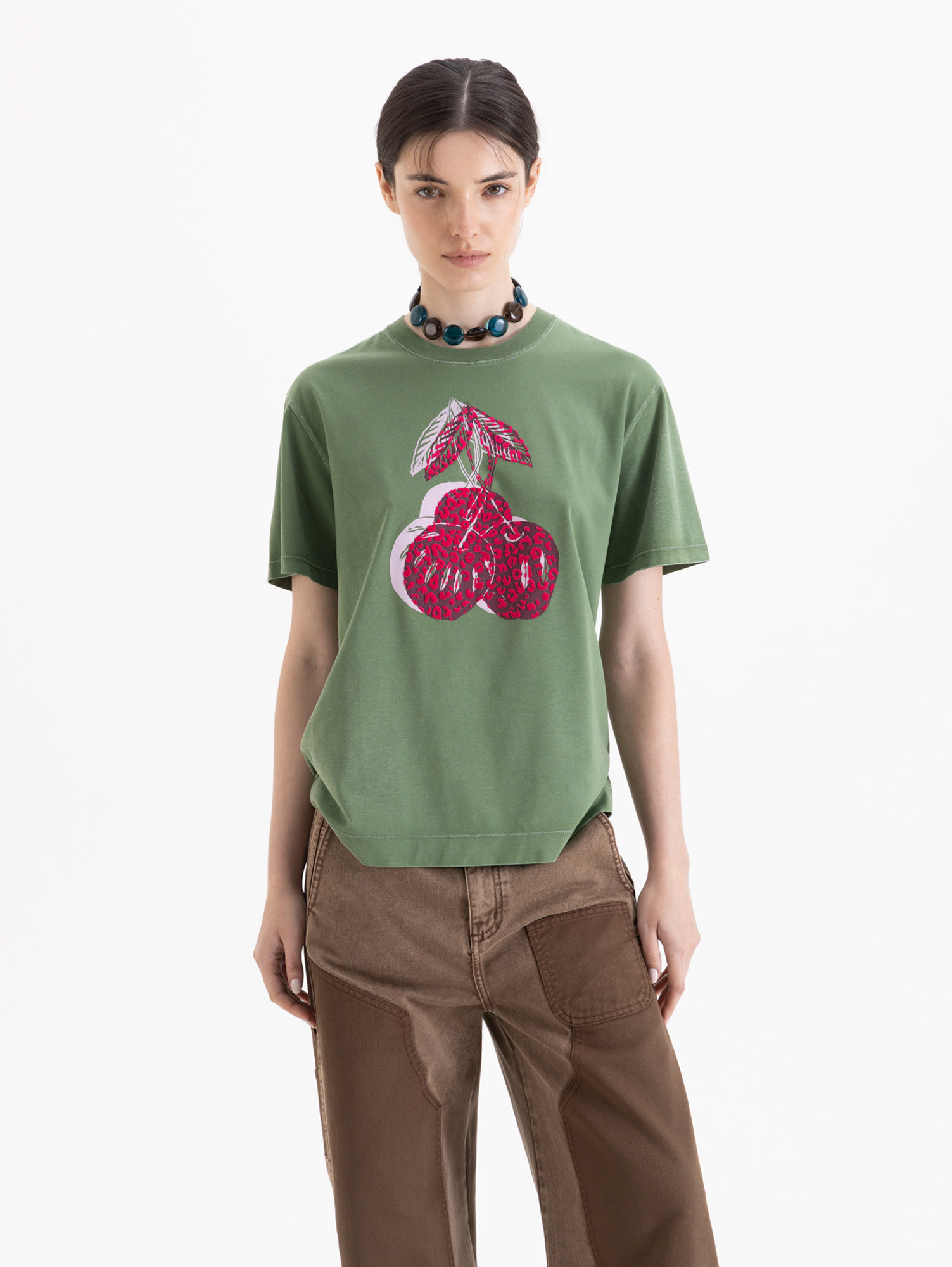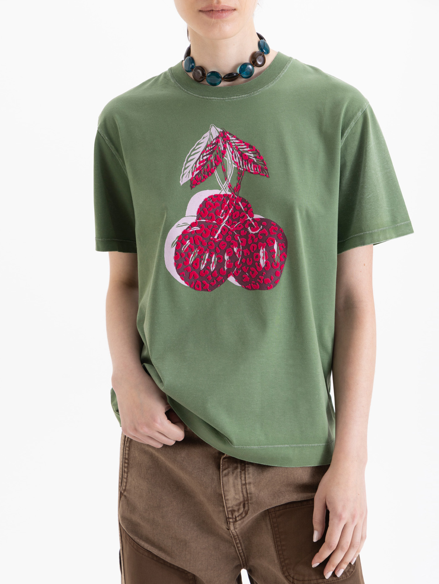 Remera Alexa de mangas cortas, larga a la altura de la cadera y cuello redondo. Es de fit amplio y cómodo. Lleva estampa Cherry en delantero.