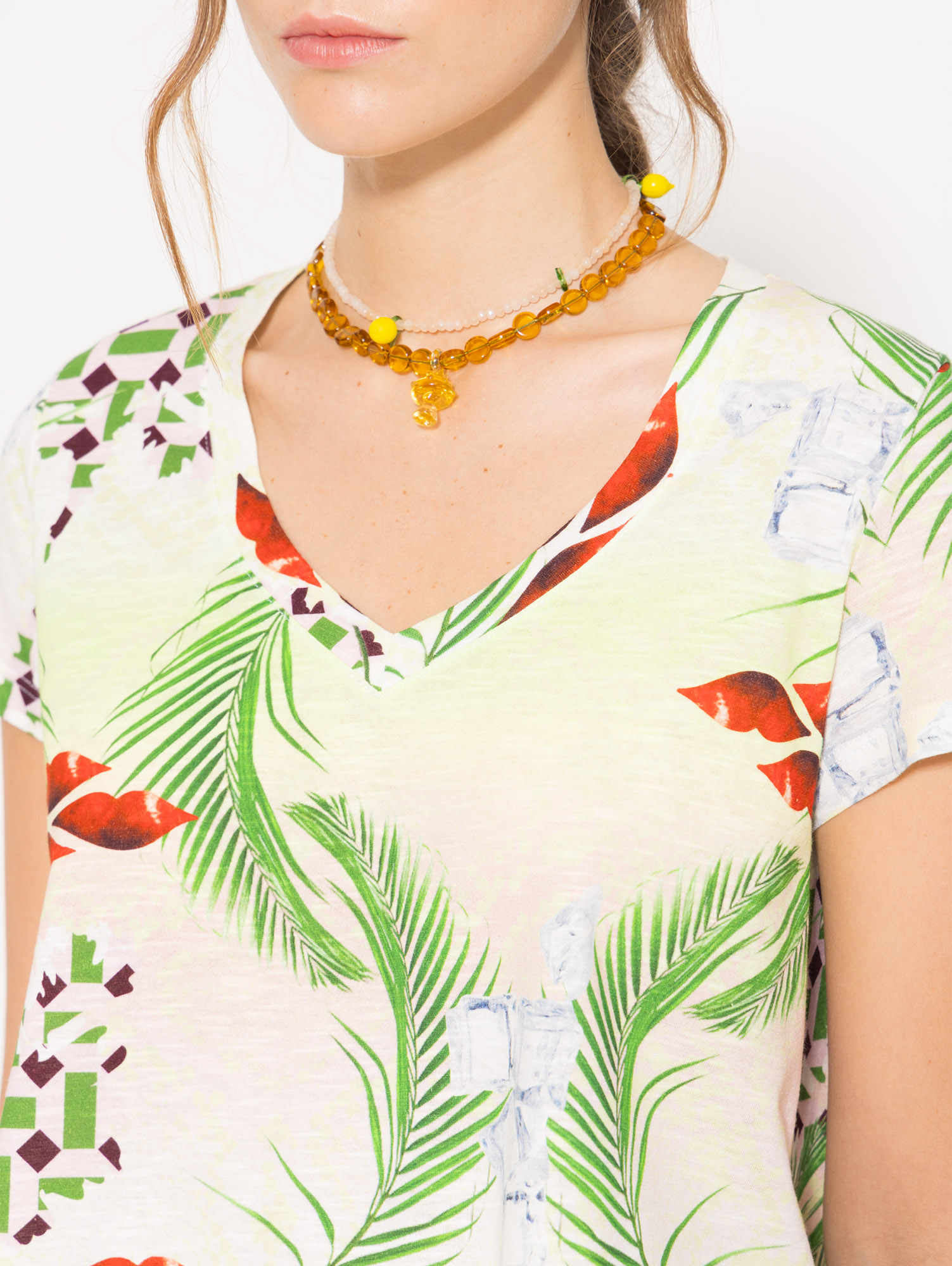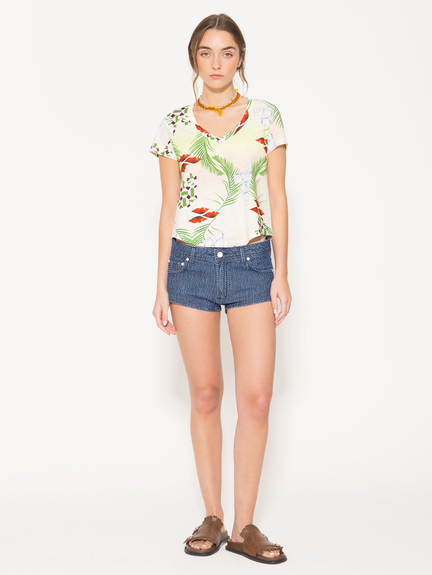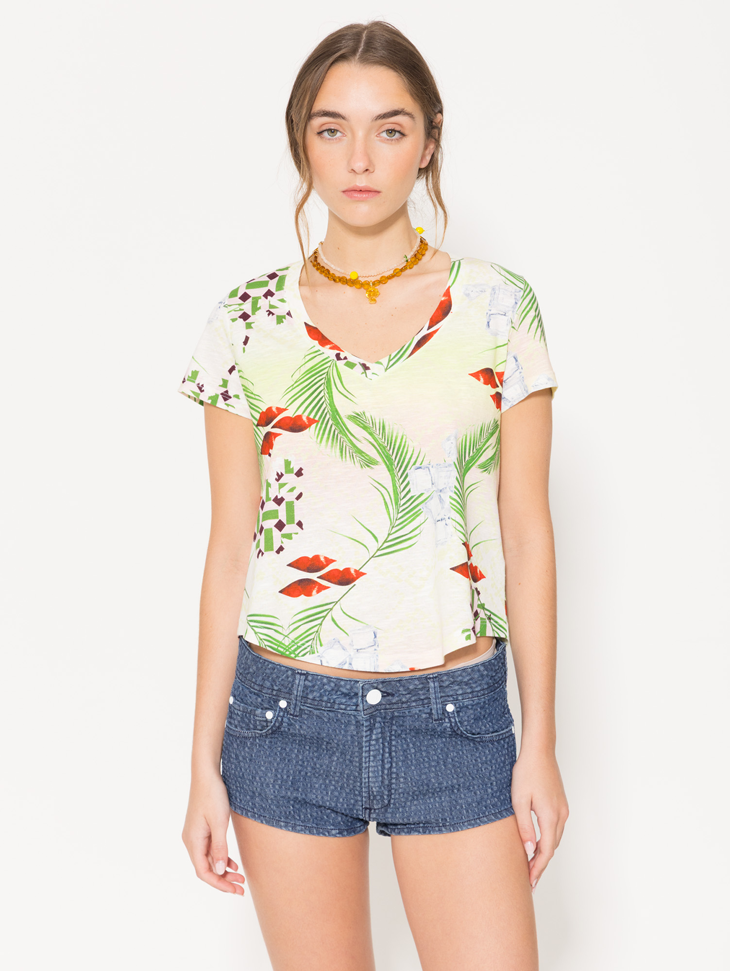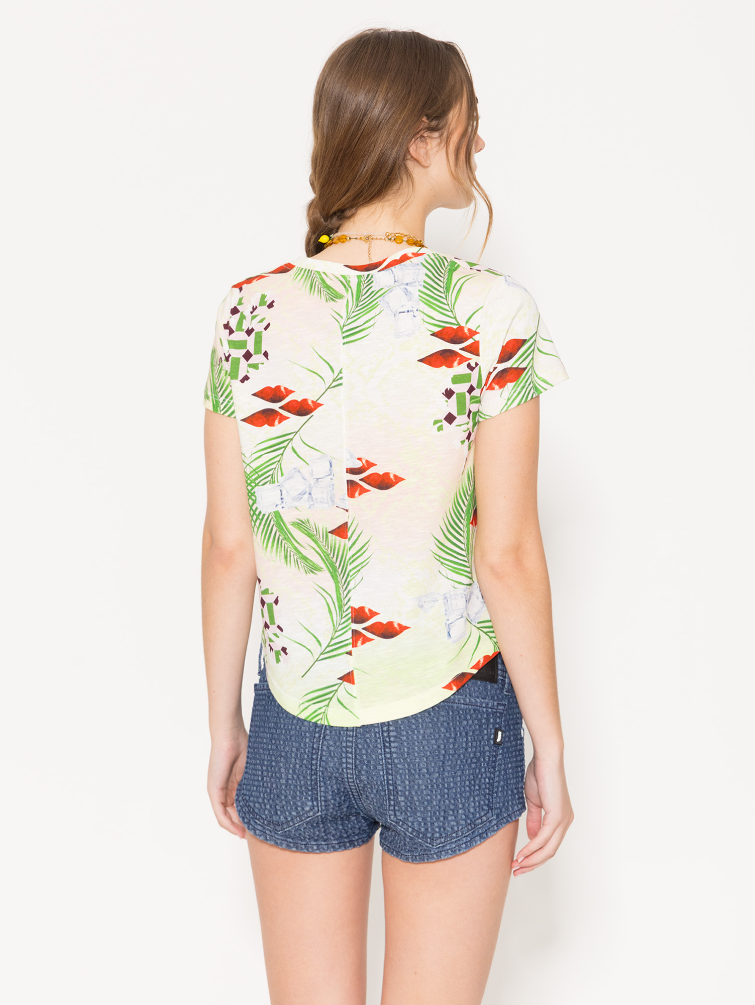 Remera Ice de flame estampada, confeccionada en 100% algodón. Tien cuello en V, recorte central en la espalda y ruedo curvo, que aporta un calce relajado y femenino.