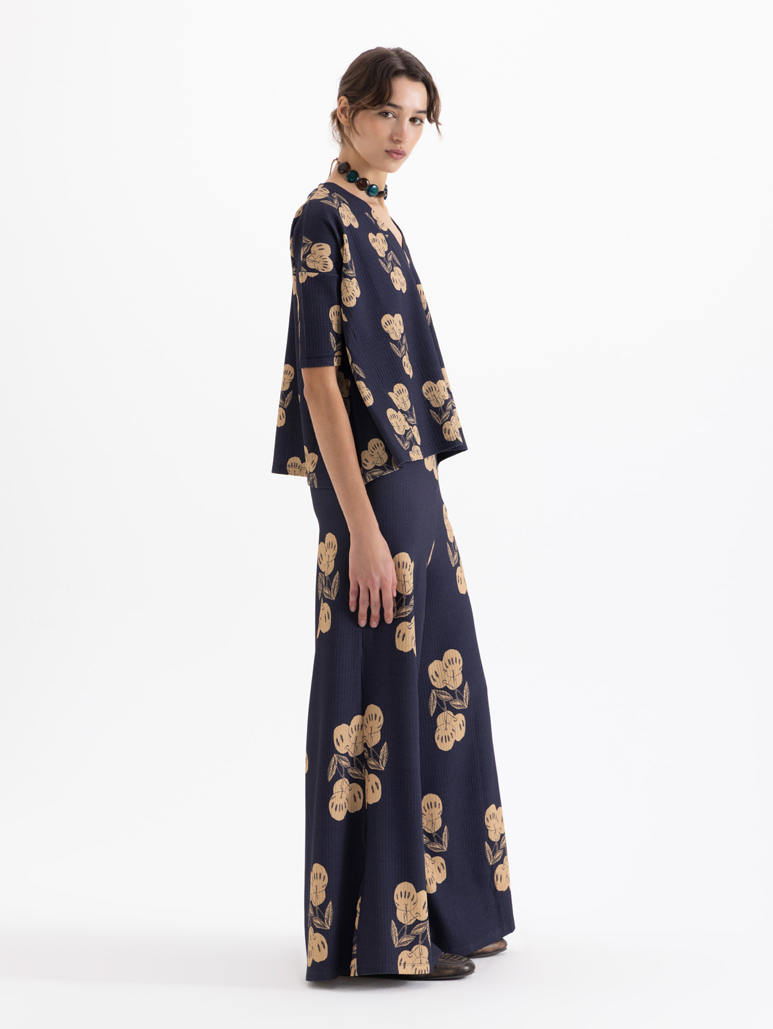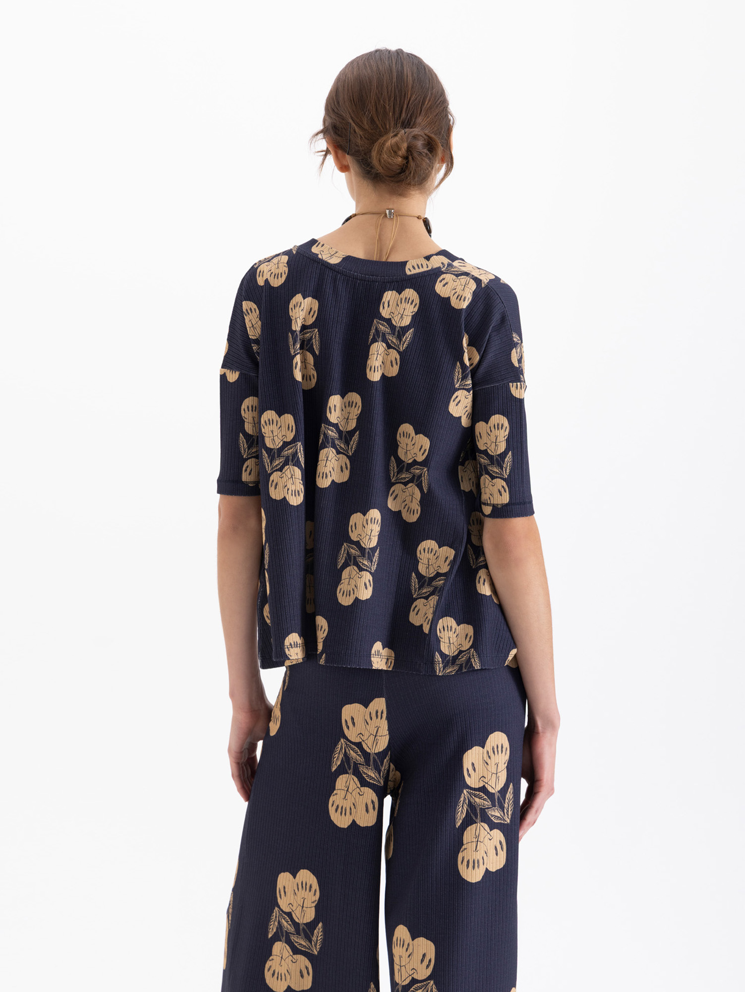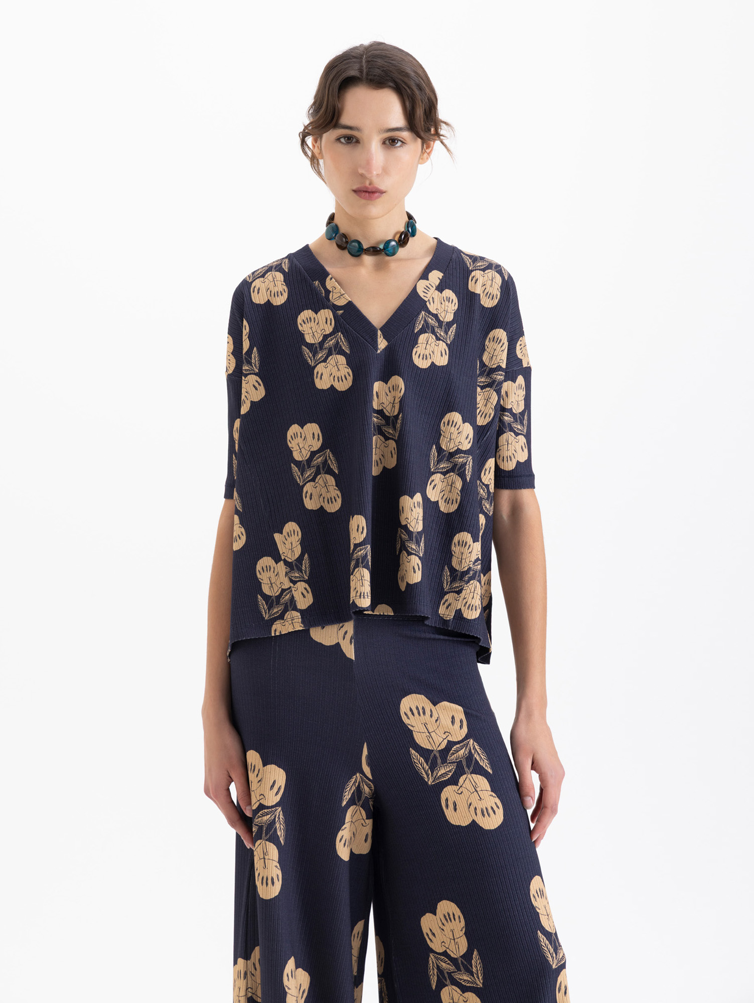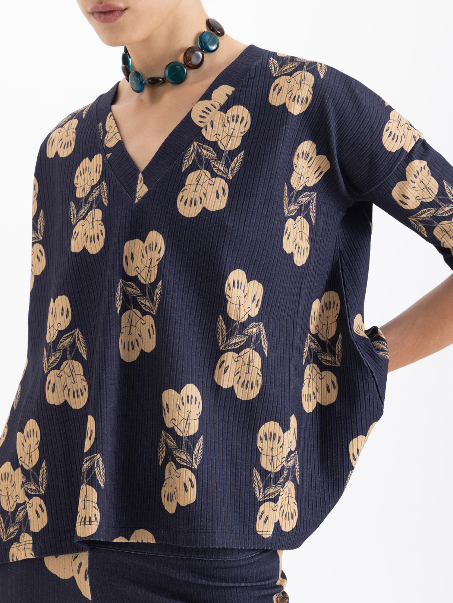 Remera Kiraz confeccionada en morley de punto full print, es de escote en V y mangas a la altura del codo. Fit amplio y cómodo.