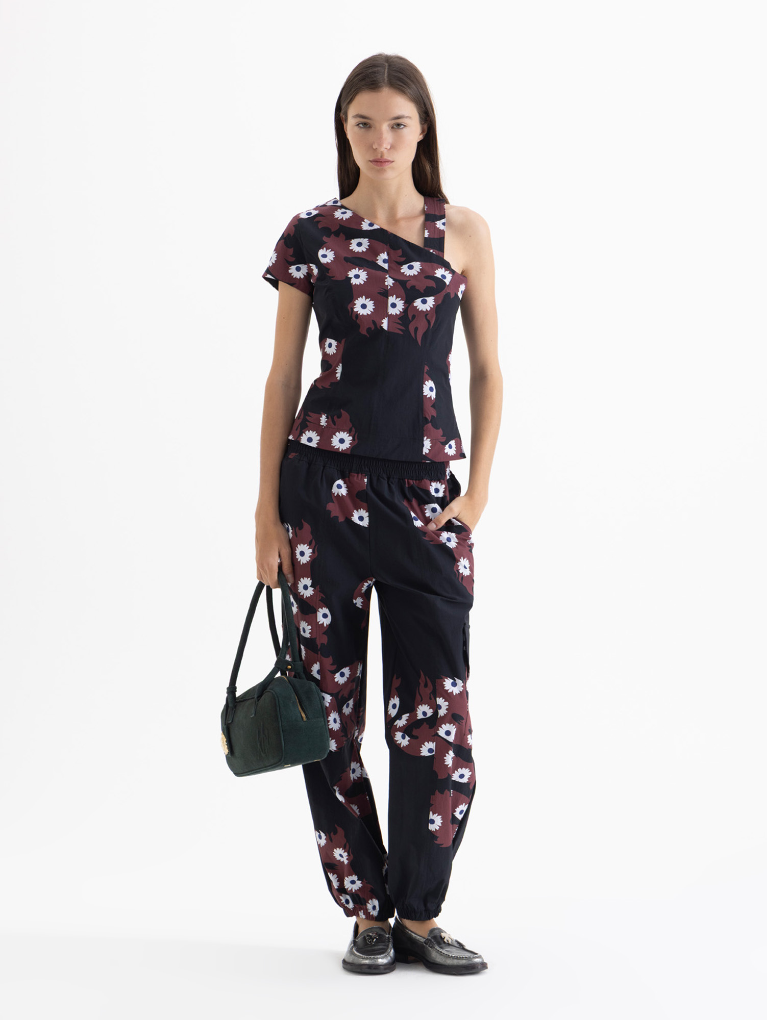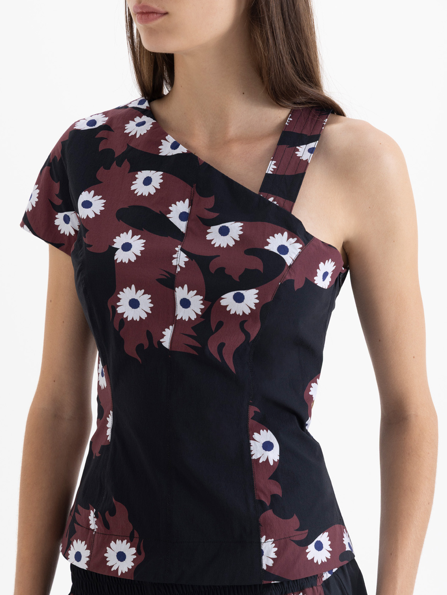 Top Amapola confeccionado en poplin 4way con estampa exclusiva de dragones y flores. Presenta silueta asimétrica con escote al hombro: un lateral lleva bretel fino y el otro manga, creando un efecto de un solo hombro cubierto. El tejido con rebote permite un calce cómodo y ajustado.