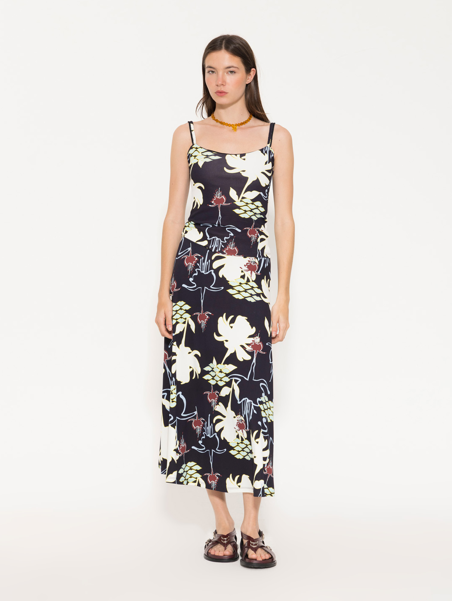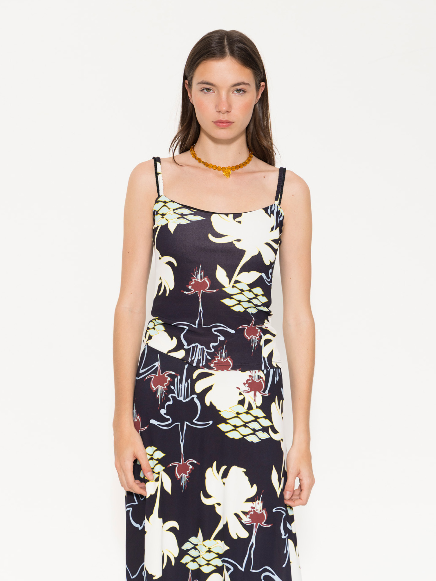 Top Delfi estampado al cuerpo. Lleva cinta volados en breteles y bordado JCH en borde izquierdo inferior. Su acceso es mediante cierre en espalda.