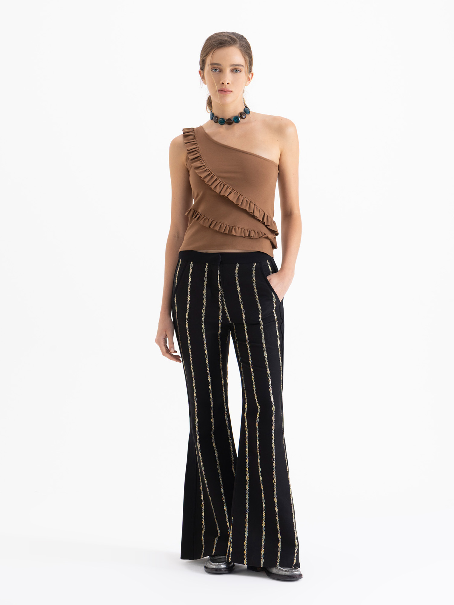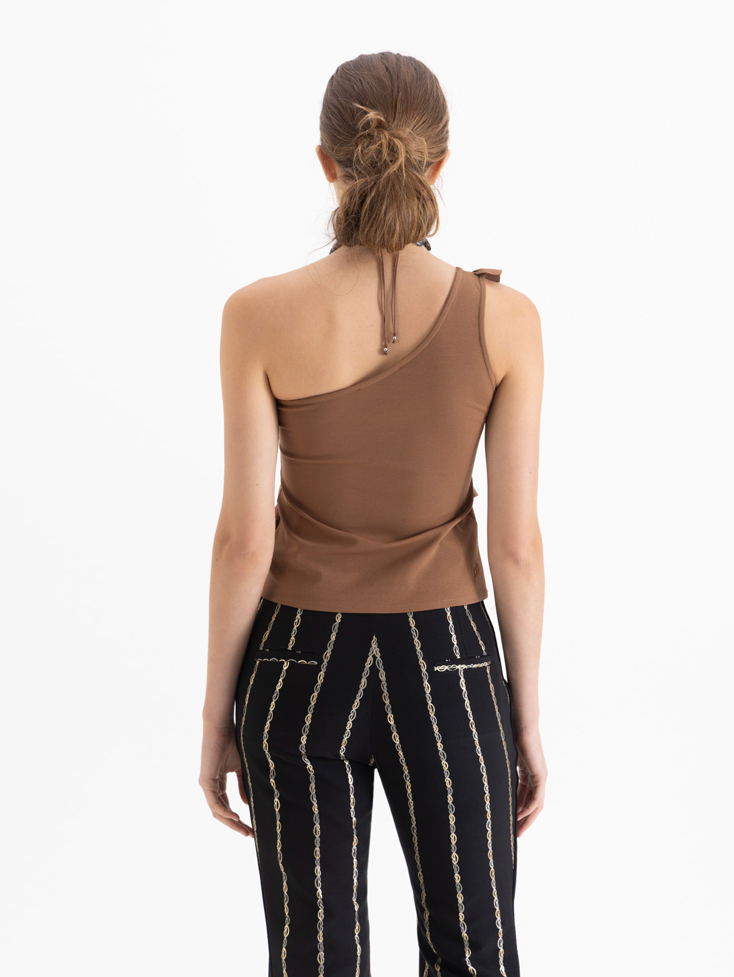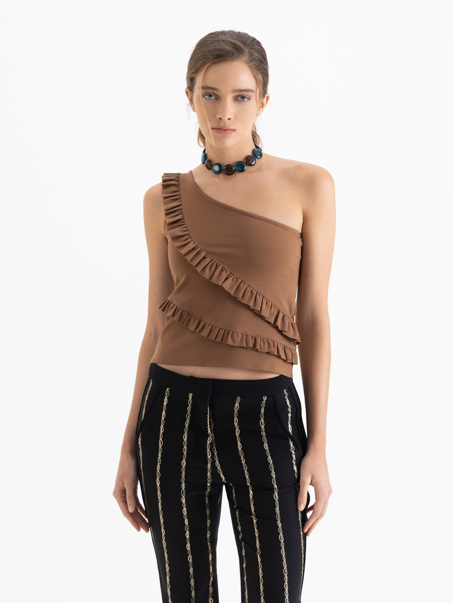 Top Eve confeccionado en tela de punto lisa, con un solo hombro y lleva volados en el delantero.