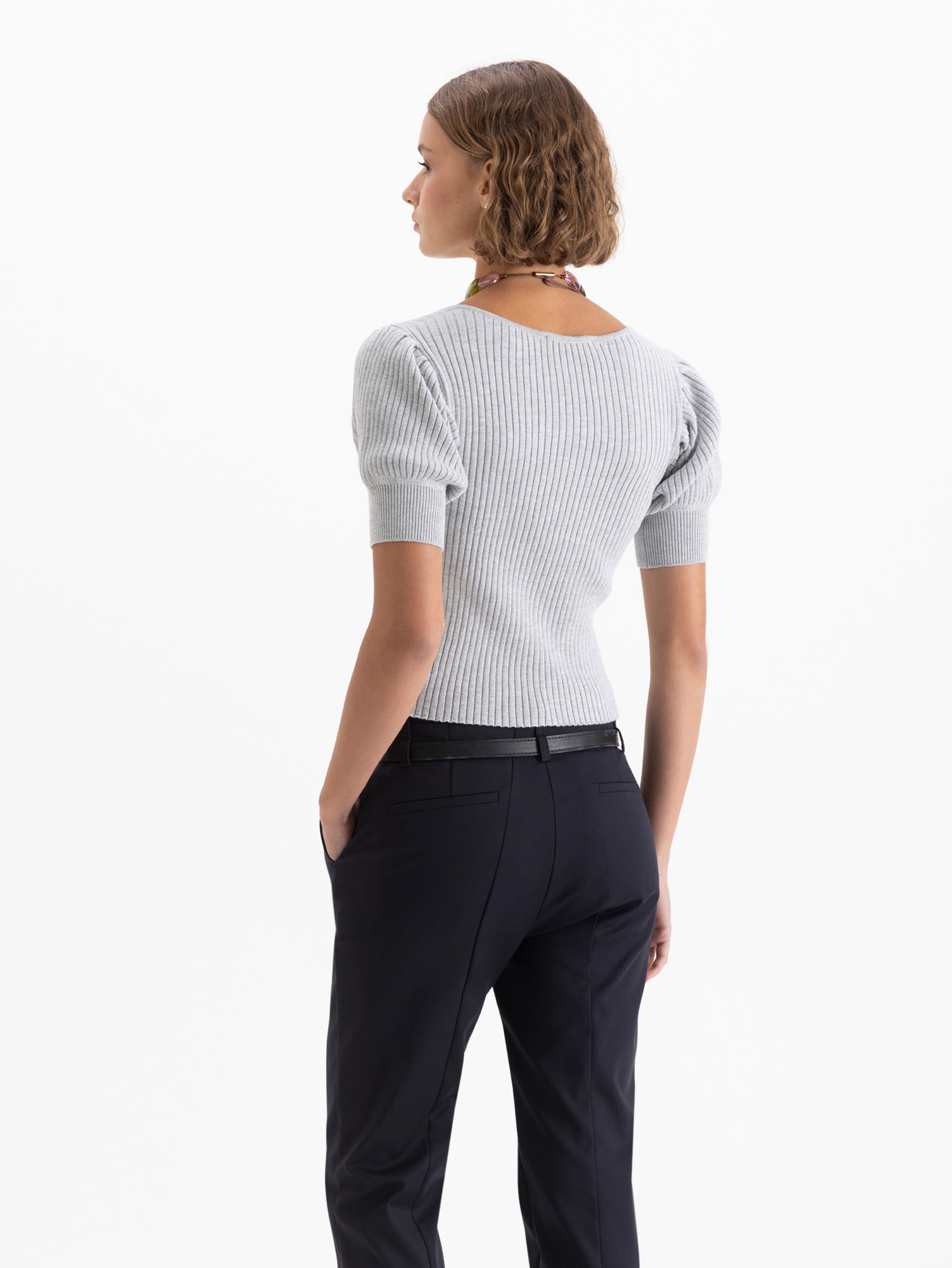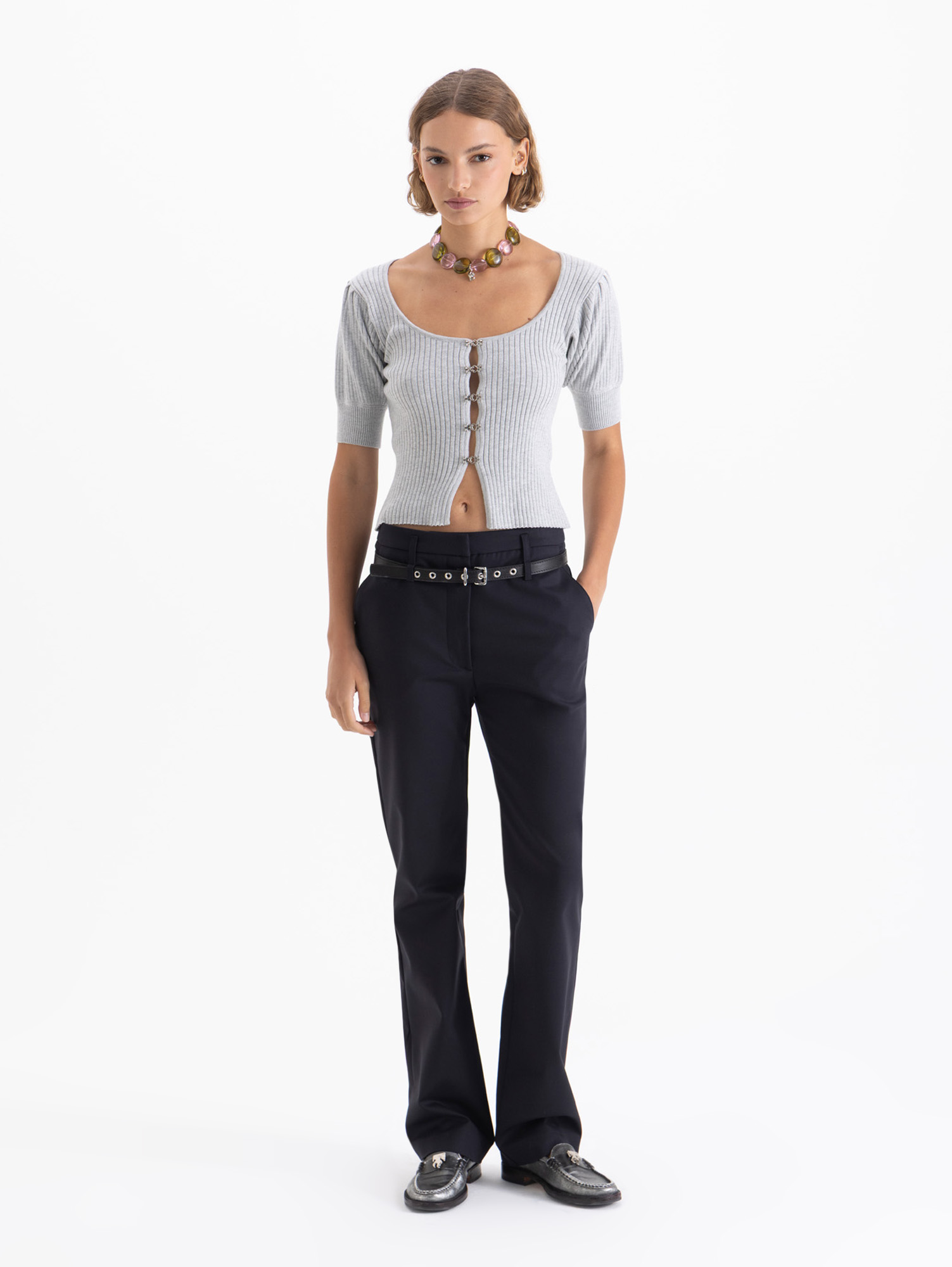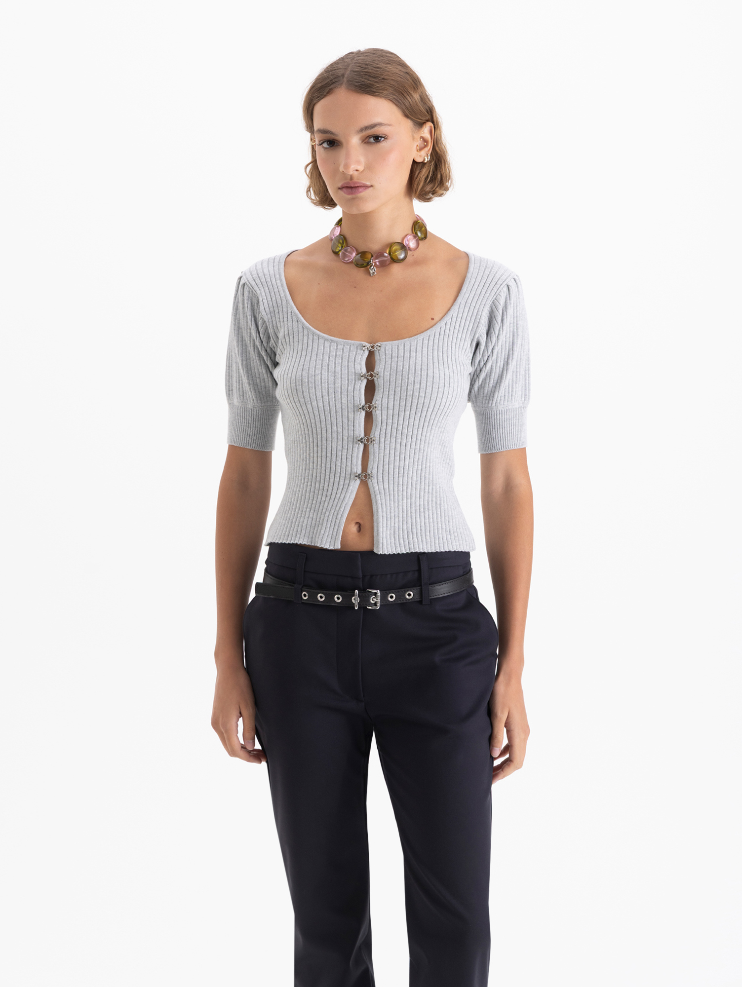 Top Joan corto con largo por arriba de la cadera. Lleva acceso frontal con tres pequeños ganchos con piedras que aportan un detalle sofisticado. Manga 3/4 y tejido liviano con mezcla de seda que realza su caída y textura.
