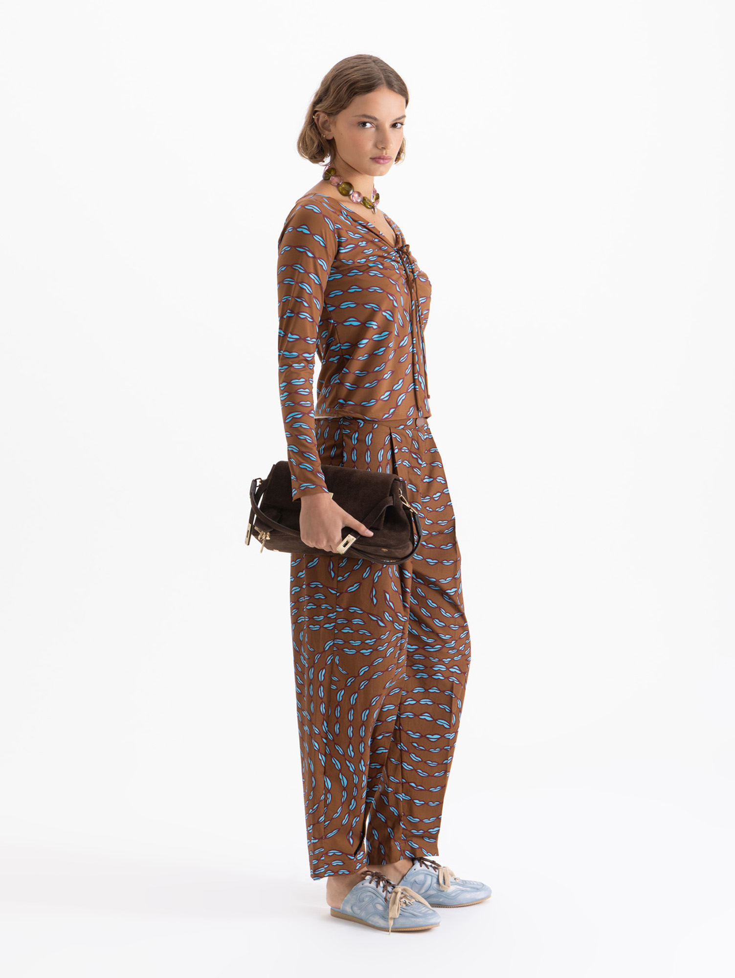 Top Kisses confeccionado en tela de punto con estampa full print que aporta energía y movimiento. Lleva escote en “V” profundo con jareta para ajustar y anudar, generando un detalle visual femenino y versátil. De mangas largas y calce al cuerpo, ideal para acompañar looks con personalidad.