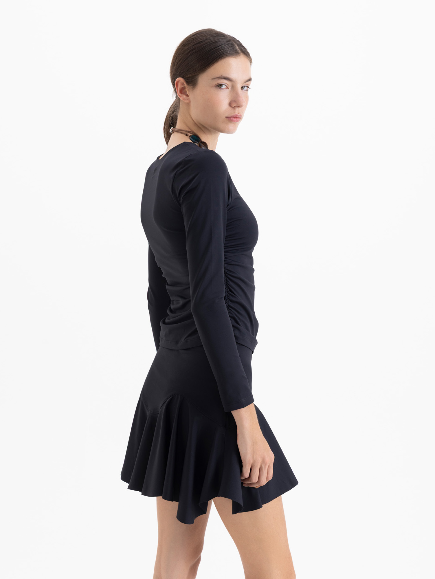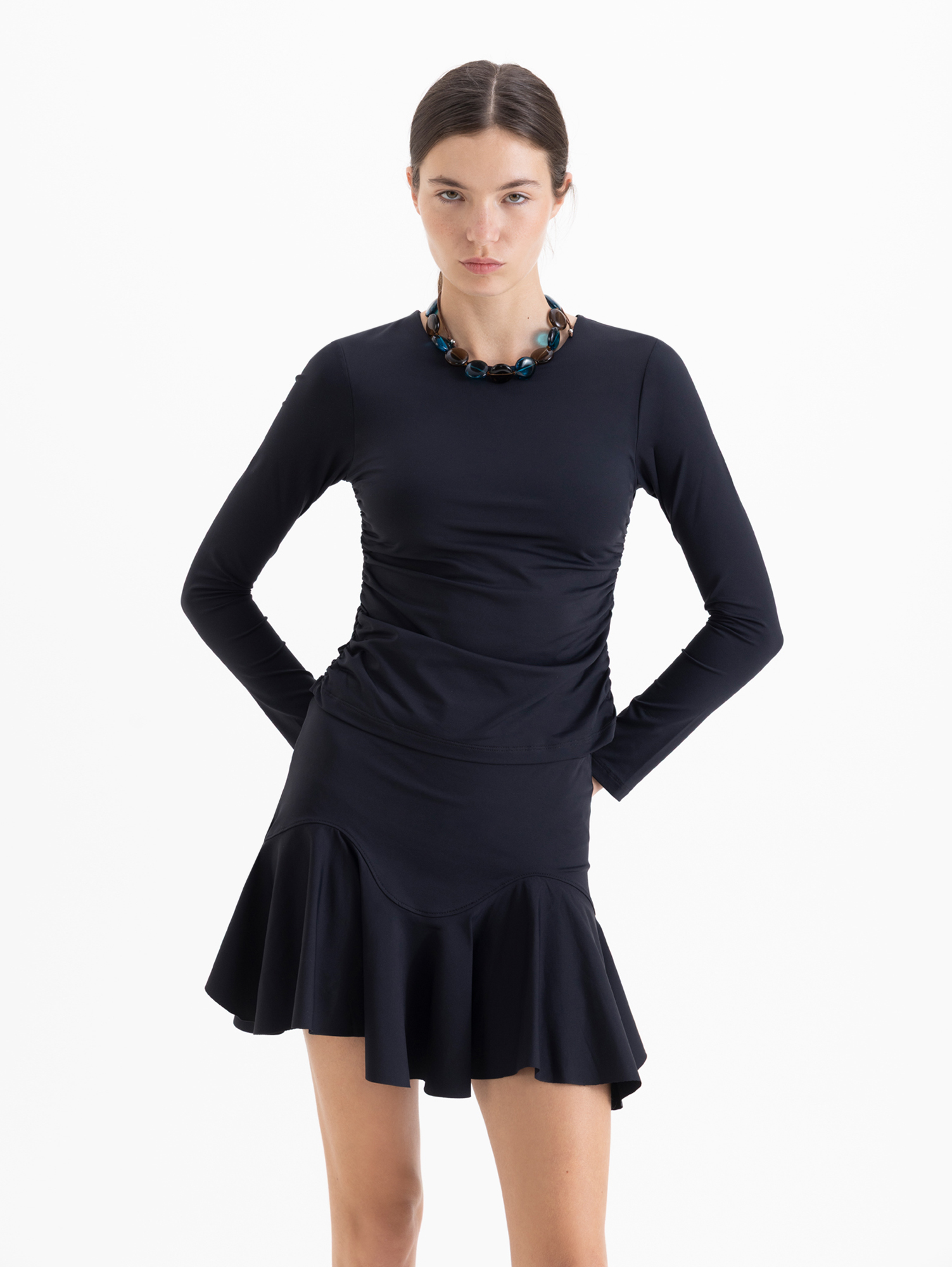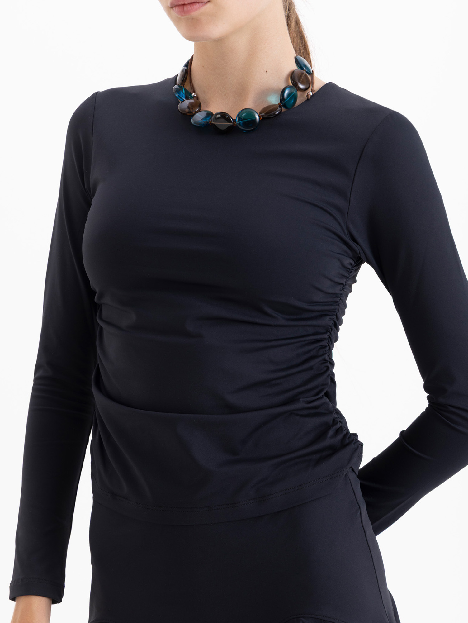 Top Maureen de manga larga y cuello redondo, confeccionado en algodón. Se destaca por su diseño con drapeados laterales que generan pliegues orgánicos en el frente, aportando textura a la prenda.