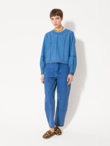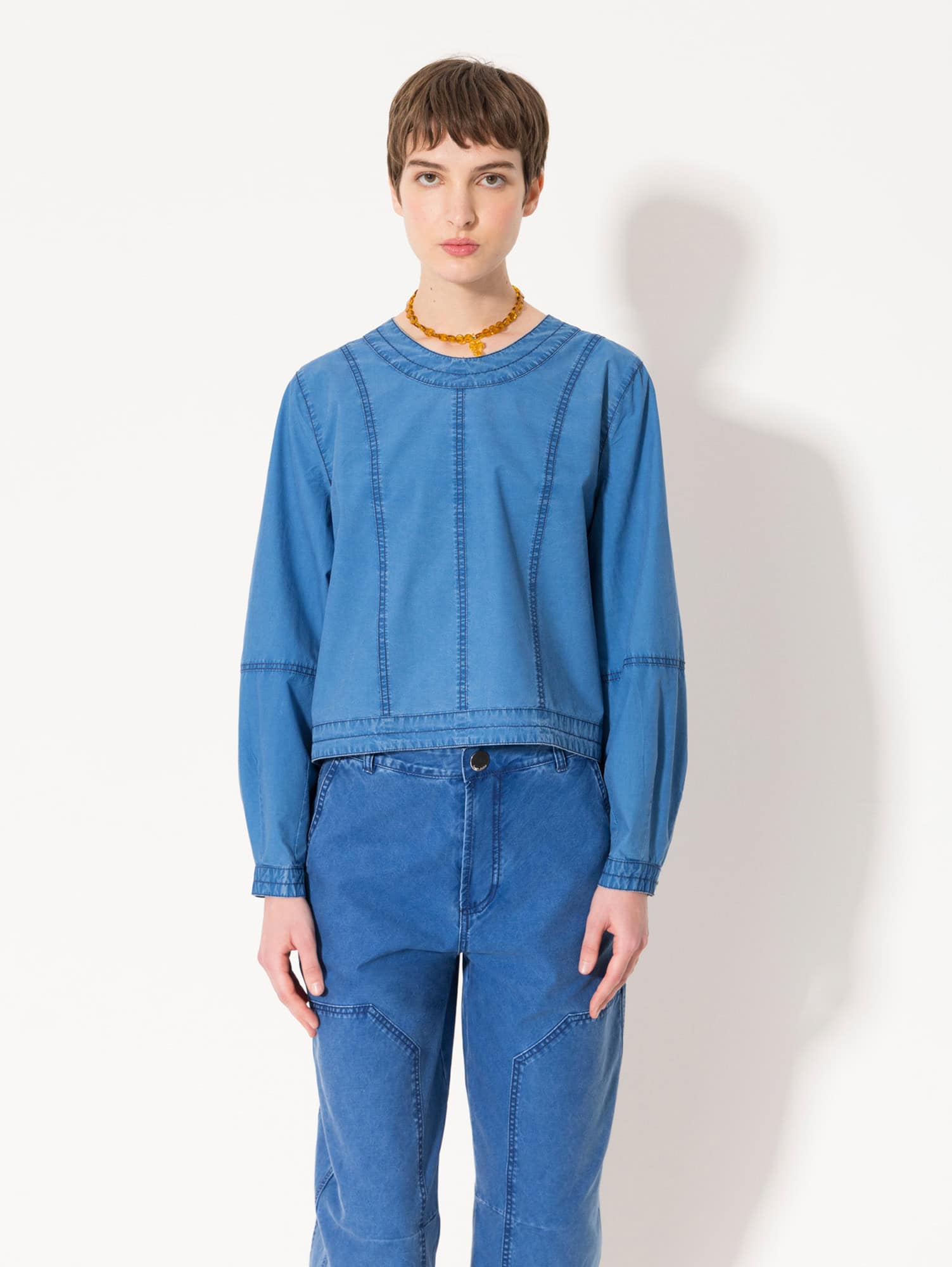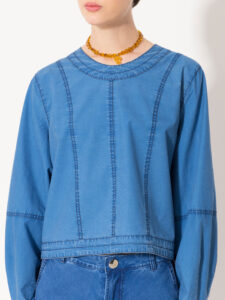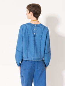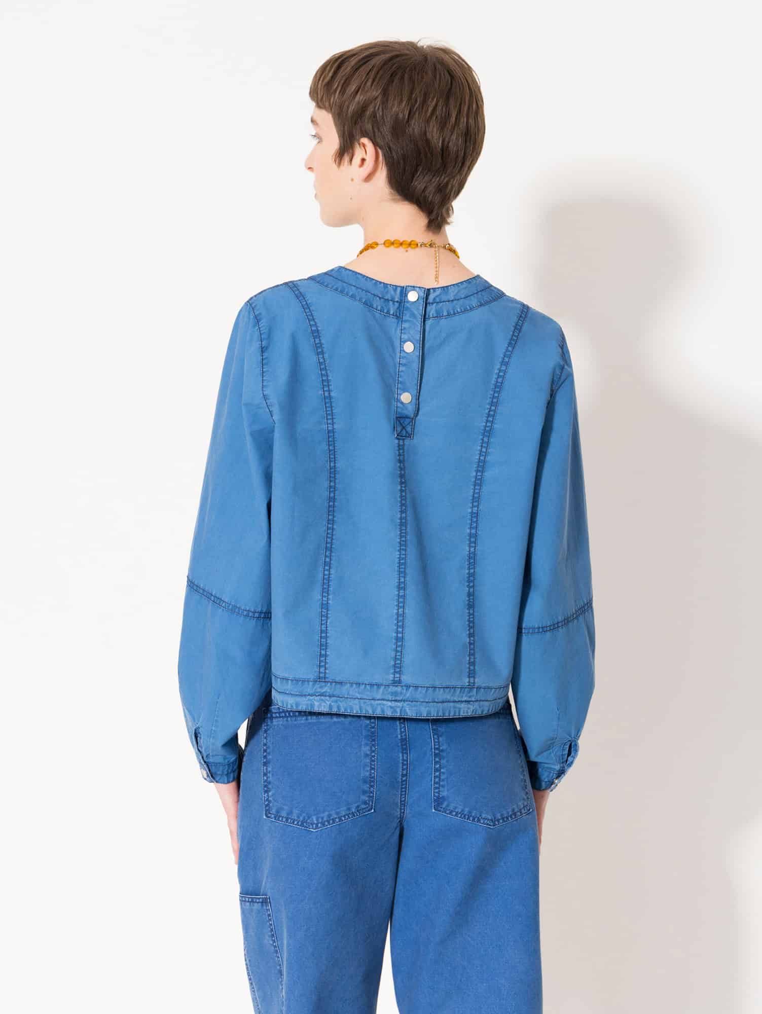 Top Texas de manga larga y cuello a la base, confeccionado en denim paper touch. Presenta recortes en el frente que estilizan la silueta y cartera en la espalda con broches para facilitar el acceso.