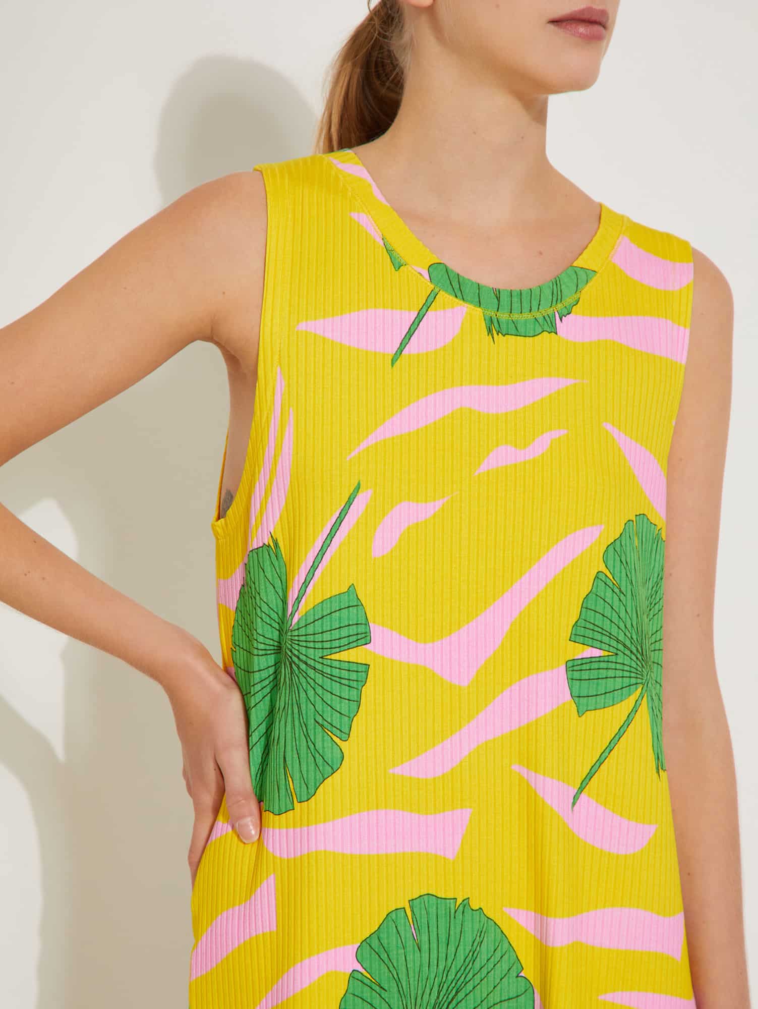 Vestido largo confeccionado en tejido estampado con diseño Flores NY. Fit al cuerpo con escote redondo y sin mangas. Posee un recorte central en espalda que se funde hacia el delantero, formando tajos que aportan libertad de movimiento a la prenda.