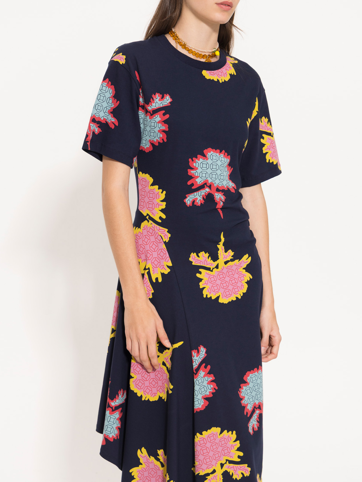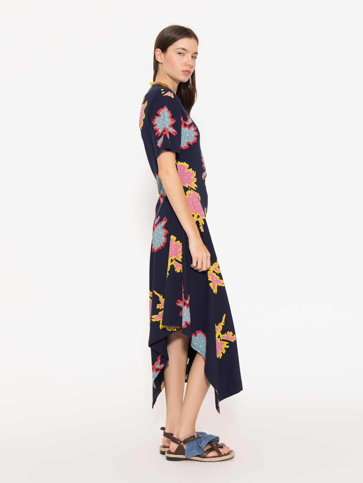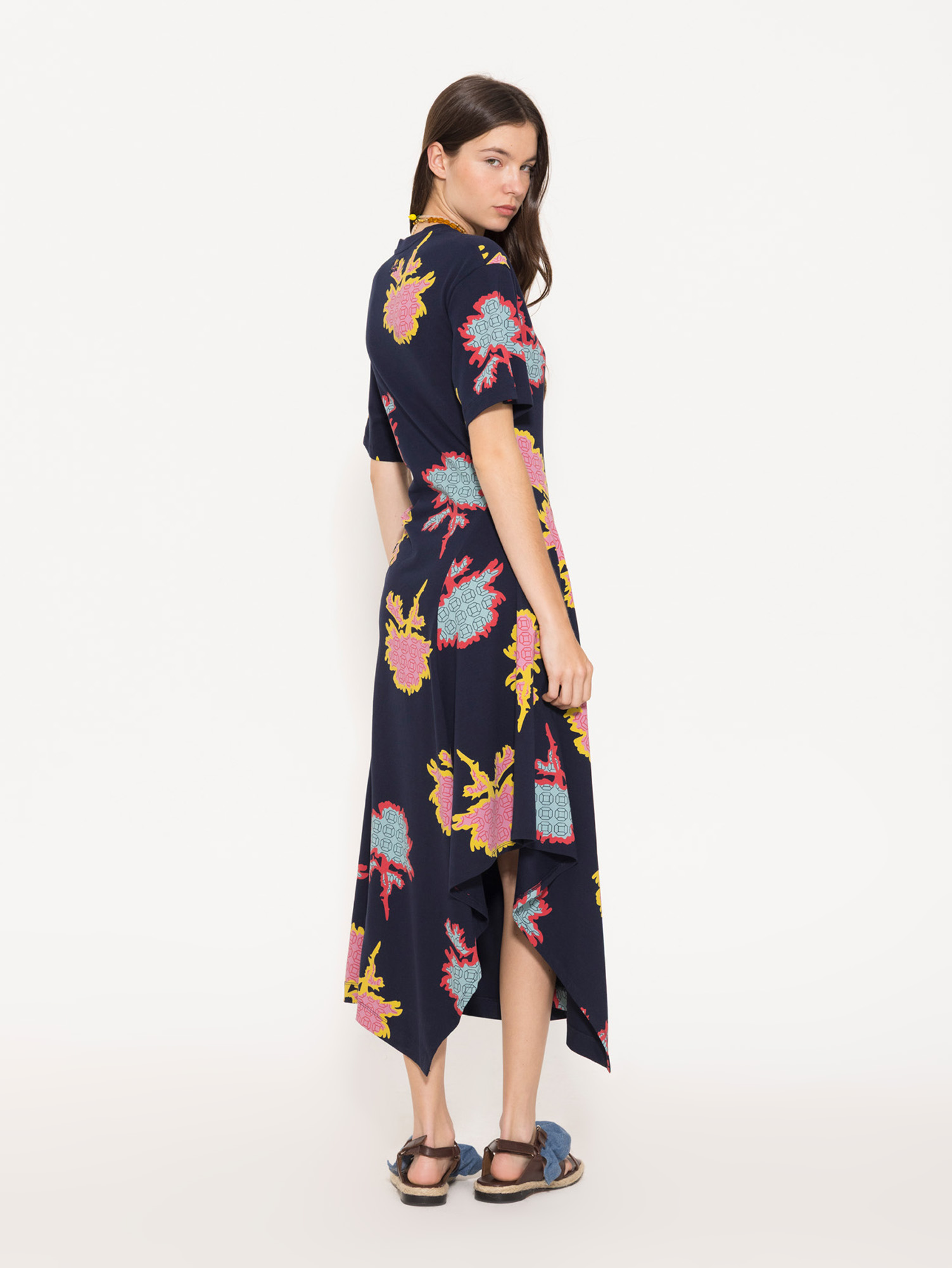 Vestido Rachel largo confeccionado en algodón egipcio estampado. Presenta recortes asimétricos que aportan movimiento a la prenda. Es de mangas cortas y cuello redondo tejido a tono con la tela