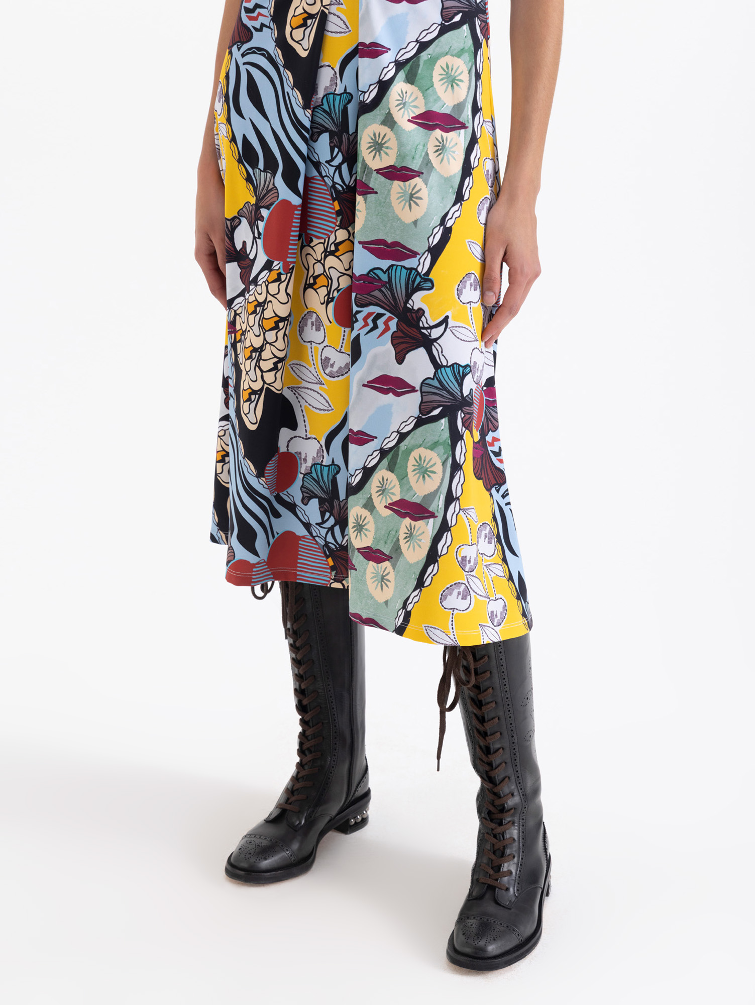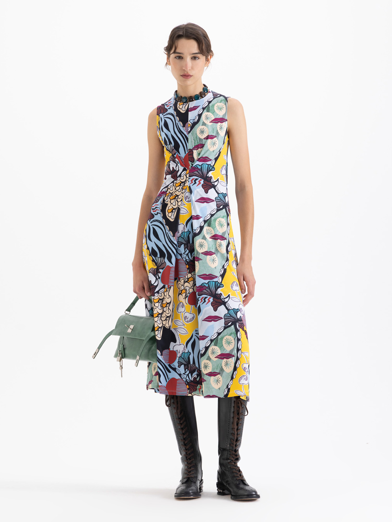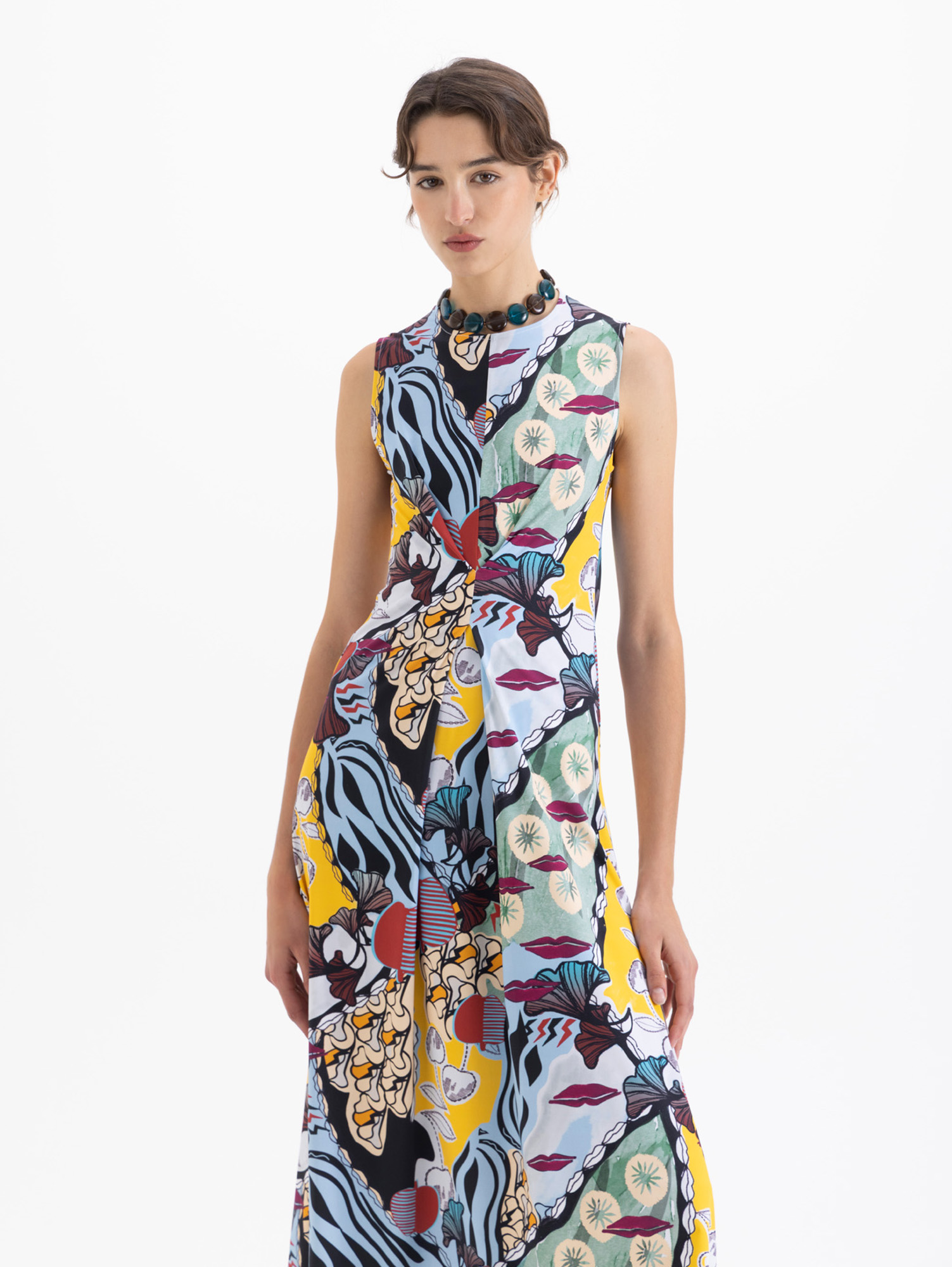 Vestido Sunny confeccionado en tela de punto full print. Es largo por debajo de las rodillas, sin mangas y lleva tabla en delantero.