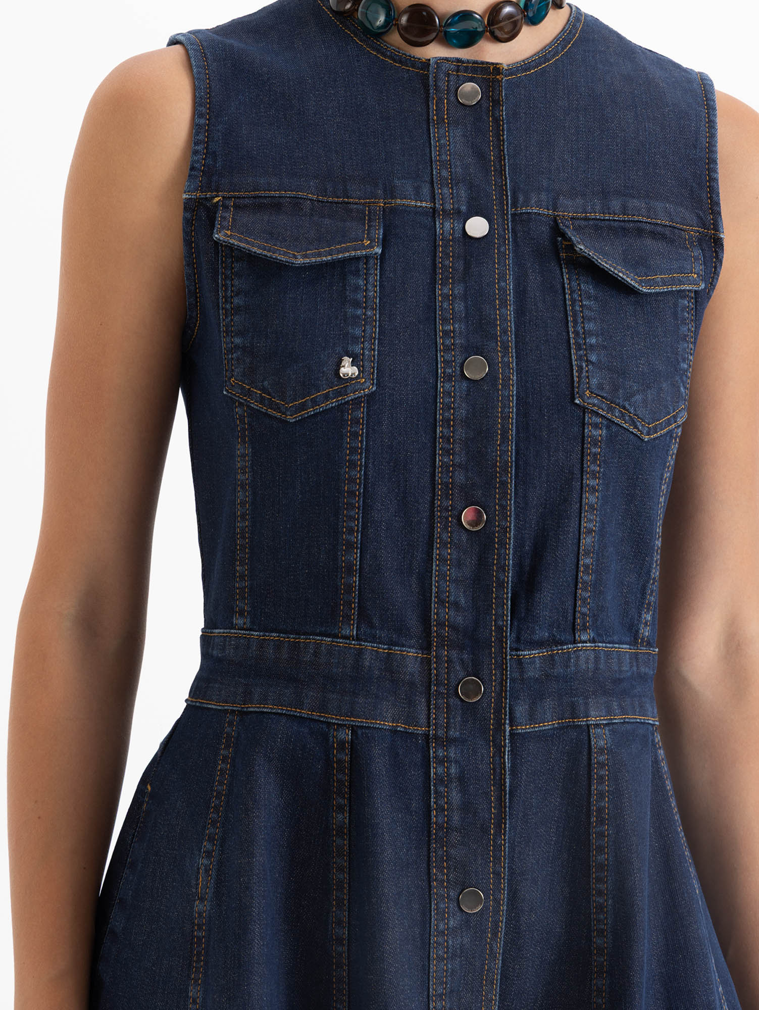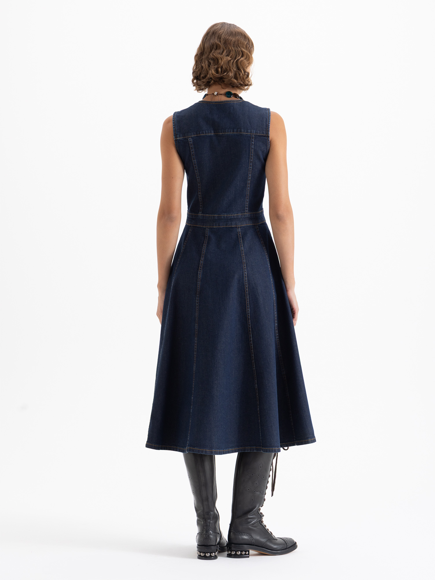 Vestido West largo de denim, sin mangas y de silueta limpia. Viene en lavado oscuro con desgastes sutiles que aportan profundidad. El tejido incluye un leve porcentaje de elastano, lo que permite un calce cómodo y favorecedor.Una pieza versátil para usar sola o en capas.