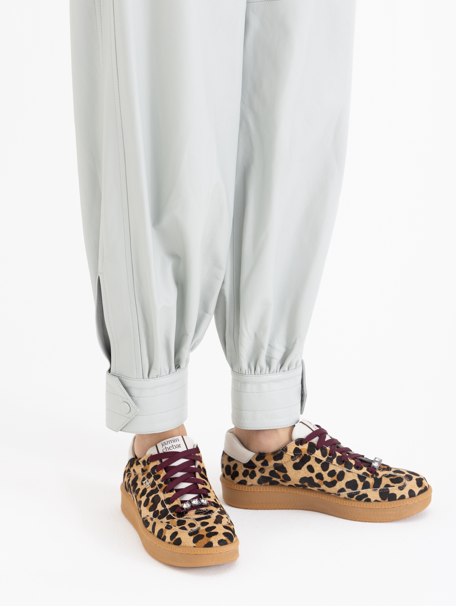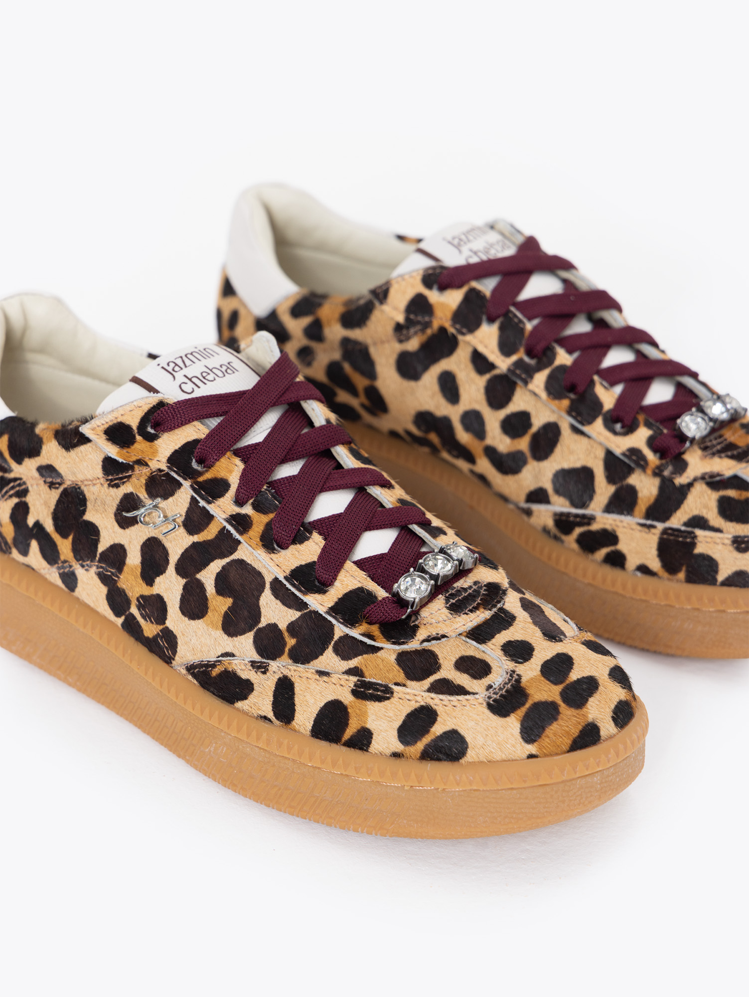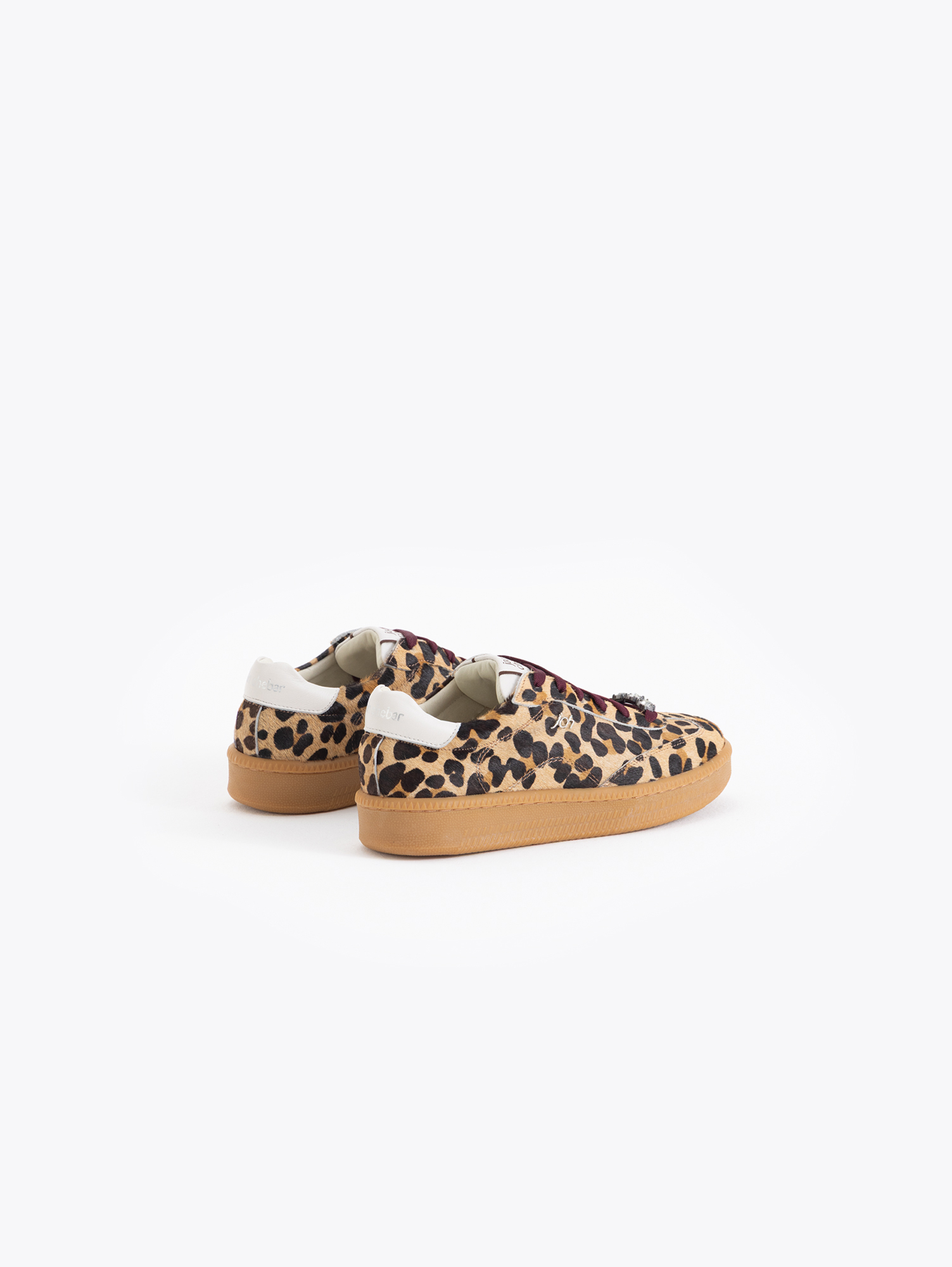 Zapatilla Moon Wild confeccionada en pelo vacuno con apliques de cuero vacuno en contraste. Al igual que la versión clásica, incorpora el detalle de badana en la lengüeta y un cristal en la zona de los cordones. Cuenta con forrería de cuero flor y una resistente suela de caucho.