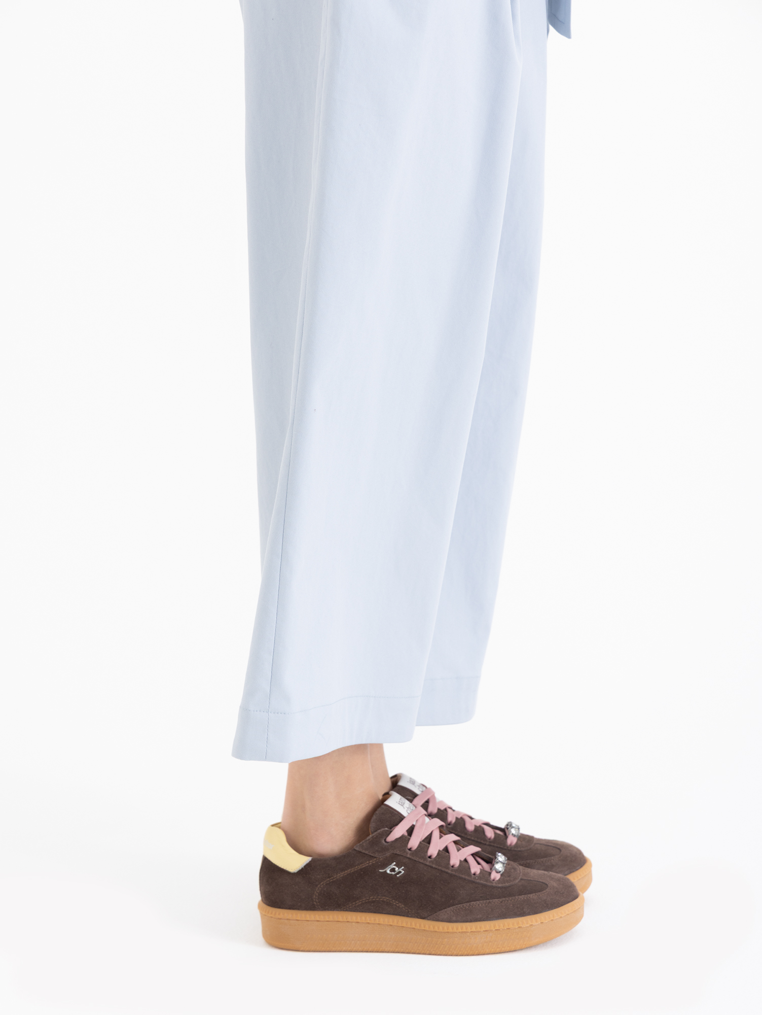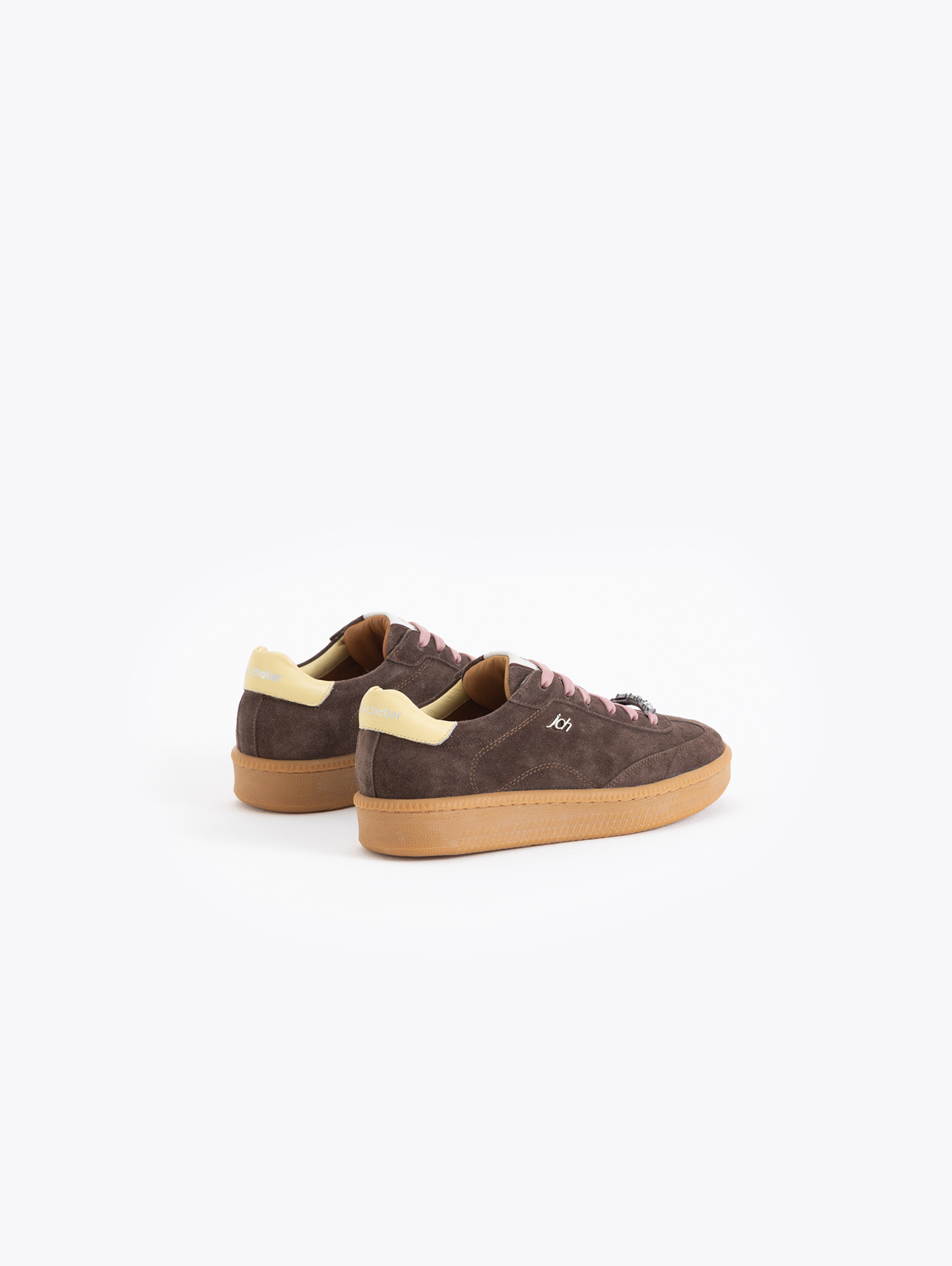 Zapatilla Moon realizada en cuero descarne con una combinación de cuero vacuno liso. El diseño se distingue por el detalle de badana en la lengüeta y un aplique de cristal en la cordonera que aporta un brillo sutil. Cuenta con forrería de cuero flor y una resistente suela de caucho.